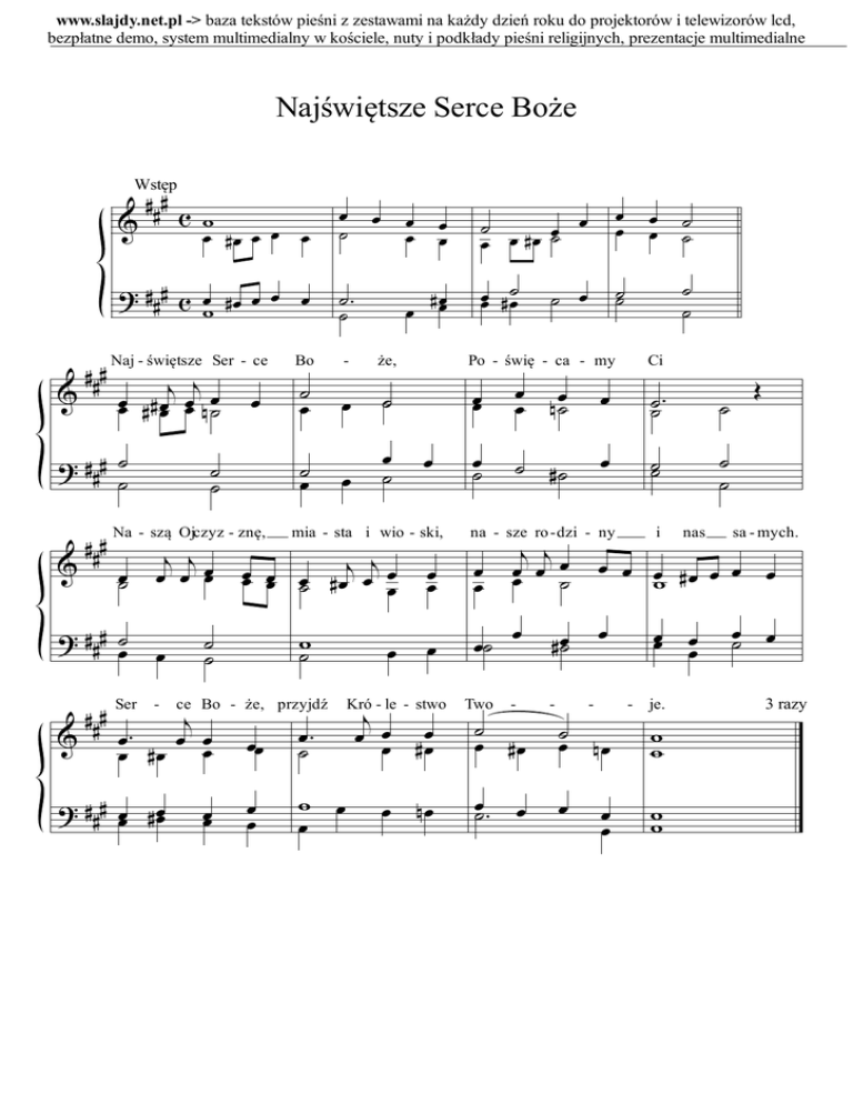 www.slajdy.net.pl -> baza tekstów pieśni z zestawami na każdy dzień roku do projektorów i telewizorów lcd, bezpłatne demo, system multimedialny w kościele, nuty i podkłady pieśni religijnych, prezentacje multimedialne Najświętsze Serce Boże ∀∀∀ Wstęp % β ϖ œ ∀œ œ œ œ > ∀∀∀ β œ ∀ œ œ œ œ ϖ % ∀∀∀ ι œœ ∀ ∀ œœι œœ µ œ˙ Naj - świętsze Ser - ce > ∀∀∀ ˙ ˙ % ∀∀∀ % ˙ ˙ Na - szą Ojczyz - znę, œ˙ > ∀∀∀ ˙ œ ∀∀∀ œ ι ι œ œ œœ œ ˙ ˙ ι œ− œ œ œ ∀œ œ Ser - > ∀ ∀ ∀ œœ ∀ œœ Bo œ œ ˙ ˙− ˙ - ˙ œ œ ˙ œ œ ϖ̇ œ œ œ ∀ œœ ˙ œ ˙ œ− ˙ ϖ œ œ œ œ œ œ ˙ œ ˙ œ œ ∀œ œœ ∀ ˙œ œ œ œ œ œ œ ι œ œ œ œ ∀œ Kró - le - stwo œ µœ œœ œ ˙ œ œ œ µ˙ Ci œ ˙˙ − œ ˙ ∀˙ ι ι œœ œ œ ˙ œ˙ œ ˙ œ ∀œ Two - œ˙ − œ œ - ˙ œ µœ œ i Œ ˙ ˙ nas sa - mych. œ œ œ ∀œ œ œ œ ϖ ∀ œ˙ - ˙ ˙˙ na - sze ro -dzi - ny œ œ ˙ ˙ ˙ ˙ ˙˙ ˙ œ Po - świę - ca - my mia - sta i wio - ski, ce Bo - że, przyjdź œœ œ œ że, œœ œœ œ ∀ œι œι œ ˙ œ œœ œ œ œ œ œœ œ œ - je. ϖ ϖ ϖ ϖ œ˙ œ 3 razy www.slajdy.net.pl -> baza tekstów pieśni z zestawami na każdy dzień roku do projektorów i telewizorów lcd, bezpłatne demo, system multimedialny w kościele, nuty i podkłady pieśni religijnych, prezentacje multimedialne Najświętsze Serce Boże % ∀∀∀ 1. ι ι œœ ∀ ∀ œœ œœ œœ µ œœ > ∀∀∀ ˙ ˙ % ∀∀∀ œ ˙ ι ι œ ˙ œ œ œœ > ∀ ∀ ∀ ˙œ − œ % ∀∀∀ ι œœ − œ œ œœ > ∀∀∀ œ ˙ % ∀∀∀ 2. % œ œœ ι ι œœ œ œœ % ˙ ˙ œ ˙ œ œ œ ι ι œœ œ œ ∀˙ ι œœ − œ œ˙ œ œ ˙ ˙− œœ œ ∀œ œ œ ˙ œ œ œœ œ œ œ ˙ ˙ œœ œ œ ˙ œ ∀œ ˙˙ ∀ œ˙ ˙ œϖ œ ˙ œ˙ œ œ ∀˙ œœ ˙˙ −− ˙− ˙− Œ Œ œ œ œ ∀ œ œ µ œœ œ ˙ œ ˙œ œ œ ˙ œ œ œ ϖ ϖ œ ˙œ − œ ∀˙ ϖ ϖ Œ œ ∀ ˙œ œœ œœ œ ∀ œι œι œ œ œ œ œ ∀œ œ œ ι ι œœ œ œœ ∀ œœ œ œœ ∀ œ œ µ œœ œœ œ ι œ œ œ œ œ ∀œ Ι ˙ œ œ µœ ˙ ˙ ι œ − œ œ œœ œ œœ œ− œ− œ œ ˙ œ œ œ ˙œ œ ˙ ˙ œ ˙œ œ ˙ œ œ > ∀ ∀ ∀ ϖœ ∀ œ œ œœ œœ œ œ œ œ œϖ ˙˙ œœ ˙˙ > ∀∀∀ œ µ œ œ œ ∀∀∀ œ œ ˙ œ œ œœ œœ œ ∀ œι œιµ œœ ˙ ι ι œœ ∀ ∀ œœ œœ ∀ œ˙ > ∀∀∀ ˙ ˙ ∀∀∀ œ œ ˙œ œ œ œœ µ œœ œœ œ ϖ œœ œ œ œ ∀œ ˙ ˙ œ œ œ œ œ µœ ˙ ˙− œ œ œ œ œ ϖ ϖ ϖ ϖ œ œ œ œ © Ł. DZ
