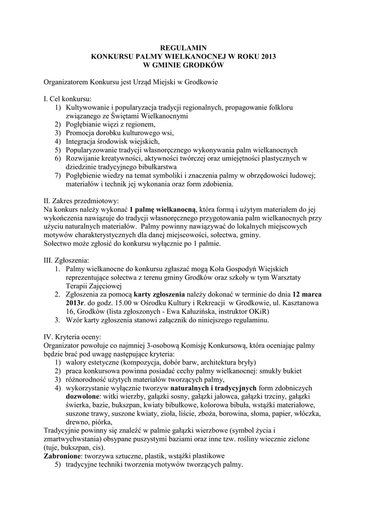 REGULAMIN KONKURSU PALMY WIELKANOCNEJ W ROKU 2013 W GMINIE GRODKÓW Organizatorem Konkursu jest Urząd Miejski w Grodkowie I. Cel konkursu: 1) Kultywowanie i popularyzacja tradycji regionalnych, propagowanie folkloru związanego ze Świętami Wielkanocnymi 2) Pogłębianie więzi z regionem, 3) Promocja dorobku kulturowego wsi, 4) Integracja środowisk wiejskich, 5) Popularyzowanie tradycji własnoręcznego wykonywania palm wielkanocnych 6) Rozwijanie kreatywności, aktywności twórczej oraz umiejętności plastycznych w dziedzinie tradycyjnego bibułkarstwa 7) Pogłębienie wiedzy na temat symboliki i znaczenia palmy w obrzędowości ludowej; materiałów i technik jej wykonania oraz form zdobienia. II. Zakres przedmiotowy: Na konkurs należy wykonać 1 palmę wielkanocną, która formą i użytym materiałem do jej wykończenia nawiązuje do tradycji własnoręcznego przygotowania palm wielkanocnych przy użyciu naturalnych materiałów. Palmy powinny nawiązywać do lokalnych miejscowych motywów charakterystycznych dla danej miejscowości, sołectwa, gminy. Sołectwo może zgłosić do konkursu wyłącznie po 1 palmie. III. Zgłoszenia: 1. Palmy wielkanocne do konkursu zgłaszać mogą Koła Gospodyń Wiejskich reprezentujące sołectwa z terenu gminy Grodków oraz szkoły w tym Warsztaty Terapii Zajęciowej 2. Zgłoszenia za pomocą karty zgłoszenia należy dokonać w terminie do dnia 12 marca 2013r. do godz. 15.00 w Ośrodku Kultury i Rekreacji w Grodkowie, ul. Kasztanowa 16, Grodków (lista zgłoszonych - Ewa Kałuzińska, instruktor OKiR) 3. Wzór karty zgłoszenia stanowi załącznik do niniejszego regulaminu. IV. Kryteria oceny: Organizator powołuje co najmniej 3-osobową Komisję Konkursową, która oceniając palmy będzie brać pod uwagę następujące kryteria: 1) walory estetyczne (kompozycja, dobór barw, architektura bryły) 2) praca konkursowa powinna posiadać cechy palmy wielkanocnej: smukły bukiet 3) różnorodność użytych materiałów tworzących palmy, 4) wykorzystanie wyłącznie tworzyw naturalnych i tradycyjnych form zdobniczych dozwolone: witki wierzby, gałązki sosny, gałązki jałowca, gałązki trzciny, gałązki świerka, bazie, bukszpan, kwiaty bibułkowe, kolorowa bibuła, wstążki materiałowe, suszone trawy, suszone kwiaty, zioła, liście, zboża, borowina, słoma, papier, włóczka, drewno, piórka, Tradycyjnie powinny się znaleźć w palmie gałązki wierzbowe (symbol życia i zmartwychwstania) obsypane puszystymi baziami oraz inne tzw. rośliny wiecznie zielone (tuje, bukszpan, cis). Zabronione: tworzywa sztuczne, plastik, wstążki plastikowe 5) tradycyjne techniki tworzenia motywów tworzących palmy. V. Przebieg konkursu: 1. Palmy należy dostarczyć w dniu Jarmarku Wielkanocnego 24 marca na rynek w Grodkowie przed jego rozpoczęciem (rozpoczęcie godzina 10.00), gdzie zostaną ustawione i poddane ocenie jury. 2. Palmom zostaje nadany numer, a następnie jury ocenia palmy 3. Wręczanie nagród odbędzie się podczas Jarmarku Wielkanocnego 4. Palma pozostaje własnością grupy wykonawców, a po wręczeniu nagród i zakończeniu Jarmarku Wielkanocnego może zostać zabrana przez zgłaszającego. VI. Nagrody: Dla 3 najwyżej ocenionych palm organizator przewiduje nagrody. Organizator zastrzega sobie prawo do innego podziału nagród. . VII. Postanowienia końcowe: 1. Komisja konkursu jest niezawisła w swojej ocenie. Jej werdykt jest niepodważalny i ostateczny. Przebieg prac komisji jest udokumentowany w protokole. 2. Zgłoszenie prac do konkursu jest równoznaczne z przekazaniem praw autorskich do nich na rzecz Organizatora, o których mowa w art. 50 ustawy z dnia 4 lutego 1994r. o prawach autorskich i prawach pokrewnych (Dz. U. z 1994r., Nr 24, poz. 83) oraz do publikacji w wydawnictwach wszelkiego typu, wydawanych przez Organizatora oraz w Internecie. 3. Udział w konkursie jest jednoznaczny z wyrażeniem zgody przez każdego uczestnika na wykorzystanie i przetwarzanie swoich danych osobowych przez Organizatora w celu wyłonienia zwycięzcy i przyznania nagrody; umieszczenia danych w materiałach publikowanych przez Organizatora i na stronie internetowej Organizatora; promocji konkursu lub idei konkursu. W sprawach organizacyjnych proszę kontaktować się z organizatorami konkursu: Urząd Miejski w Grodkowie Dorota Zawadzka, tel. 77 40 40 345 Jarmark Wielkanocny Grodków, 24 marca 2013r. Konkurs na Palmę Wielkanocną 2013 KARTA ZGŁOSZENIA sołectwo/wieś zgłaszające palmę ………………………………………………………………………………………………… Imię i nazwisko zgłaszającego: ………………………………………………………………………………………………… Dane kontaktowe ………………………………………………………………………………………………… Krótki opis palmy (np. długość, użyte materiały) ………………………………………………………………………………………………… …........................................................................................................................................…… …........................................................................................................................................…… …........................................................................................................................................…… …........................................................................................................................................…… …........................................................................................................................................…… ………………………………… ( podpis) Wypełnioną kartę należy przesłać do Ośrodka Kultury i Rekreacji, ul. Kasztanowa 16, 49-200 Grodków do dnia 12 marca 2013r. lub przynieść w dn
