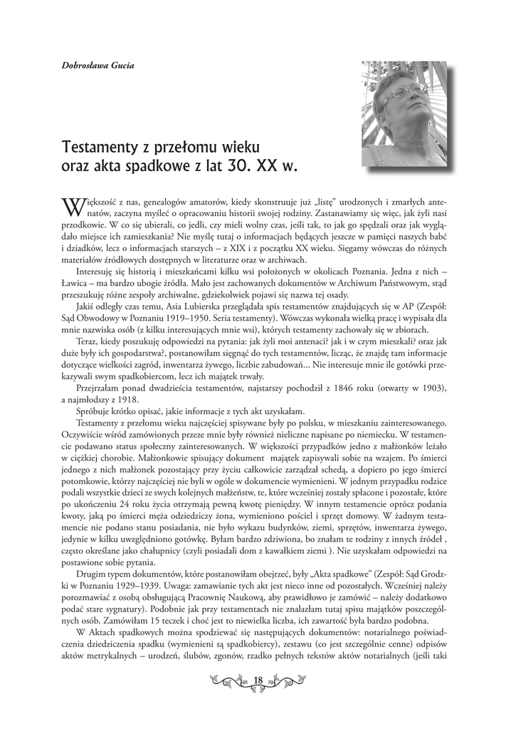 Dobrosława Gucia Testamenty z przełomu wieku oraz akta spadkowe z lat 30. XX w. W iększość z nas, genealogów amatorów, kiedy skonstruuje już „listę” urodzonych i zmarłych antenatów, zaczyna myśleć o opracowaniu historii swojej rodziny. Zastanawiamy się więc, jak żyli nasi przodkowie. W co się ubierali, co jedli, czy mieli wolny czas, jeśli tak, to jak go spędzali oraz jak wyglądało miejsce ich zamieszkania? Nie myślę tutaj o informacjach będących jeszcze w pamięci naszych babć i dziadków, lecz o informacjach starszych – z XIX i z początku XX wieku. Sięgamy wówczas do różnych materiałów źródłowych dostępnych w literaturze oraz w archiwach. Interesuję się historią i mieszkańcami kilku wsi położonych w okolicach Poznania. Jedna z nich – Ławica – ma bardzo ubogie źródła. Mało jest zachowanych dokumentów w Archiwum Państwowym, stąd przeszukuję różne zespoły archiwalne, gdziekolwiek pojawi się nazwa tej osady. Jakiś odległy czas temu, Asia Lubierska przeglądała spis testamentów znajdujących się w AP (Zespół: Sąd Obwodowy w Poznaniu 1919–1950. Seria testamenty). Wówczas wykonała wielką pracę i wypisała dla mnie nazwiska osób (z kilku interesujących mnie wsi), których testamenty zachowały się w zbiorach. Teraz, kiedy poszukuję odpowiedzi na pytania: jak żyli moi antenaci? jak i w czym mieszkali? oraz jak duże były ich gospodarstwa?, postanowiłam sięgnąć do tych testamentów, licząc, że znajdę tam informacje dotyczące wielkości zagród, inwentarza żywego, liczbie zabudowań... Nie interesuje mnie ile gotówki przekazywali swym spadkobiercom, lecz ich majątek trwały. Przejrzałam ponad dwadzieścia testamentów, najstarszy pochodził z 1846 roku (otwarty w 1903), a najmłodszy z 1918. Spróbuje krótko opisać, jakie informacje z tych akt uzyskałam. Testamenty z przełomu wieku najczęściej spisywane były po polsku, w mieszkaniu zainteresowanego. Oczywiście wśród zamówionych przeze mnie były również nieliczne napisane po niemiecku. W testamencie podawano status społeczny zainteresowanych. W większości przypadków jedno z małżonków leżało w ciężkiej chorobie. Małżonkowie spisujący dokument majątek zapisywali sobie na wzajem. Po śmierci jednego z nich małżonek pozostający przy życiu całkowicie zarządzał schedą, a dopiero po jego śmierci potomkowie, którzy najczęściej nie byli w ogóle w dokumencie wymienieni. W jednym przypadku rodzice podali wszystkie dzieci ze swych kolejnych małżeństw, te, które wcześniej zostały spłacone i pozostałe, które po ukończeniu 24 roku życia otrzymają pewną kwotę pieniędzy. W innym testamencie oprócz podania kwoty, jaką po śmierci męża odziedziczy żona, wymieniono pościel i sprzęt domowy. W żadnym testamencie nie podano stanu posiadania, nie było wykazu budynków, ziemi, sprzętów, inwentarza żywego, jedynie w kilku uwzględniono gotówkę. Byłam bardzo zdziwiona, bo znałam te rodziny z innych źródeł , często określane jako chałupnicy (czyli posiadali dom z kawałkiem ziemi ). Nie uzyskałam odpowiedzi na postawione sobie pytania. Drugim typem dokumentów, które postanowiłam obejrzeć, były „Akta spadkowe” (Zespół: Sąd Grodzki w Poznaniu 1929–1939. Uwaga: zamawianie tych akt jest nieco inne od pozostałych. Wcześniej należy porozmawiać z osobą obsługującą Pracownię Naukową, aby prawidłowo je zamówić – należy dodatkowo podać stare sygnatury). Podobnie jak przy testamentach nie znalazłam tutaj spisu majątków poszczególnych osób. Zamówiłam 15 teczek i choć jest to niewielka liczba, ich zawartość była bardzo podobna. W Aktach spadkowych można spodziewać się następujących dokumentów: notarialnego poświadczenia dziedziczenia spadku (wymienieni są spadkobiercy), zestawu (co jest szczególnie cenne) odpisów aktów metrykalnych – urodzeń, ślubów, zgonów, rzadko pełnych tekstów aktów notarialnych (jeśli taki 18 Przykładowe teczki testamentów oraz akt spadkowych, Ze zbiorów Archiwum Państwowego w Poznaniu dokument jest, podano w nim spadkobierców oraz przejmowany spadek) oraz rachunki i wysokości opłat sądowych. I podobnie jak w testamentach nie ma dokładnego określenia, co wchodzi w masę spadkową. Podawane są jedynie ewentualnie numery nieruchomości oraz ich wartość. Dla mnie ciekawe były inne niż akta metrykalne dokumenty dotyczące spadkobierców. W kilku przypadkach w teczkach znajdowały się wnioski do sądu o zmniejszenie lub zniesienie opłat z powodu ubóstwa. Podano w nich dokładny adres zamieszkania potencjalnych spadkobierców, czym się zajmowali, ilu wśród nich było bezrobotnych oraz stan cywilny – co w przypadku mieszkańców Poznania było szczególnie cenne, gdyż tych informacji bardzo często mi brakowało. 19