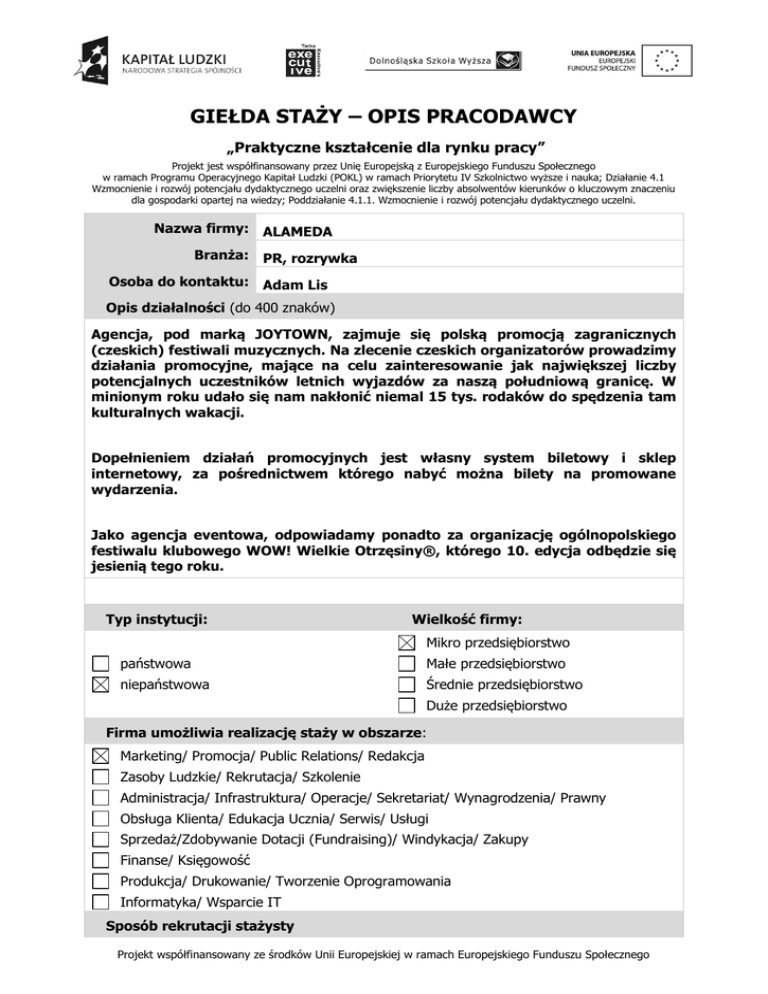 GIEŁDA STAŻY – OPIS PRACODAWCY „Praktyczne kształcenie dla rynku pracy” Projekt jest współfinansowany przez Unię Europejską z Europejskiego Funduszu Społecznego w ramach Programu Operacyjnego Kapitał Ludzki (POKL) w ramach Priorytetu IV Szkolnictwo wyższe i nauka; Działanie 4.1 Wzmocnienie i rozwój potencjału dydaktycznego uczelni oraz zwiększenie liczby absolwentów kierunków o kluczowym znaczeniu dla gospodarki opartej na wiedzy; Poddziałanie 4.1.1. Wzmocnienie i rozwój potencjału dydaktycznego uczelni. Nazwa firmy: ALAMEDA Branża: PR, rozrywka Osoba do kontaktu: Adam Lis Opis działalności (do 400 znaków) Agencja, pod marką JOYTOWN, zajmuje się polską promocją zagranicznych (czeskich) festiwali muzycznych. Na zlecenie czeskich organizatorów prowadzimy działania promocyjne, mające na celu zainteresowanie jak największej liczby potencjalnych uczestników letnich wyjazdów za naszą południową granicę. W minionym roku udało się nam nakłonić niemal 15 tys. rodaków do spędzenia tam kulturalnych wakacji. Dopełnieniem działań promocyjnych jest własny system biletowy i sklep internetowy, za pośrednictwem którego nabyć można bilety na promowane wydarzenia. Jako agencja eventowa, odpowiadamy ponadto za organizację ogólnopolskiego festiwalu klubowego WOW! Wielkie Otrzęsiny®, którego 10. edycja odbędzie się jesienią tego roku. Typ instytucji: Wielkość firmy: Mikro przedsiębiorstwo państwowa Małe przedsiębiorstwo niepaństwowa Średnie przedsiębiorstwo Duże przedsiębiorstwo Firma umożliwia realizację staży w obszarze: Marketing/ Promocja/ Public Relations/ Redakcja Zasoby Ludzkie/ Rekrutacja/ Szkolenie Administracja/ Infrastruktura/ Operacje/ Sekretariat/ Wynagrodzenia/ Prawny Obsługa Klienta/ Edukacja Ucznia/ Serwis/ Usługi Sprzedaż/Zdobywanie Dotacji (Fundraising)/ Windykacja/ Zakupy Finanse/ Księgowość Produkcja/ Drukowanie/ Tworzenie Oprogramowania Informatyka/ Wsparcie IT Sposób rekrutacji stażysty Projekt współfinansowany ze środków Unii Europejskiej w ramach Europejskiego Funduszu Społecznego Analiza dokumentów Spotkanie rekrutacyjne Projekt współfinansowany ze środków Unii Europejskiej w ramach Europejskiego Funduszu Społecznego