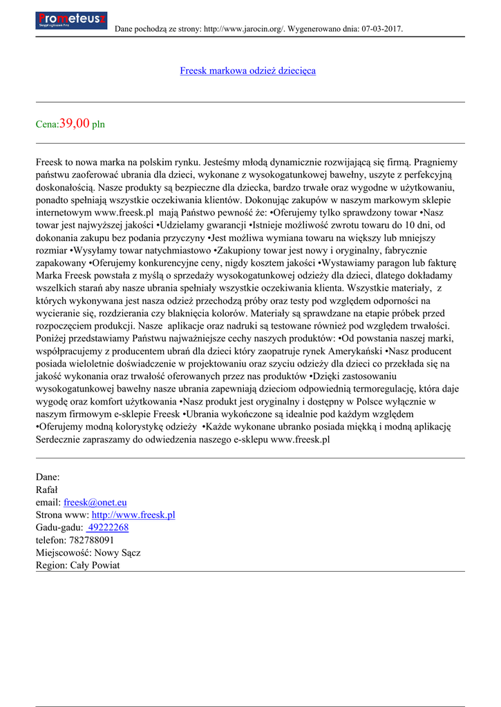 Dane pochodzą ze strony: http://www.jarocin.org/. Wygenerowano dnia: 07-03-2017. Freesk markowa odzież dziecięca Cena:39,00 pln Freesk to nowa marka na polskim rynku. Jesteśmy młodą dynamicznie rozwijającą się firmą. Pragniemy państwu zaoferować ubrania dla dzieci, wykonane z wysokogatunkowej bawełny, uszyte z perfekcyjną doskonałością. Nasze produkty są bezpieczne dla dziecka, bardzo trwałe oraz wygodne w użytkowaniu, ponadto spełniają wszystkie oczekiwania klientów. Dokonując zakupów w naszym markowym sklepie internetowym www.freesk.pl mają Państwo pewność że: •Oferujemy tylko sprawdzony towar •Nasz towar jest najwyższej jakości •Udzielamy gwarancji •Istnieje możliwość zwrotu towaru do 10 dni, od dokonania zakupu bez podania przyczyny •Jest możliwa wymiana towaru na większy lub mniejszy rozmiar •Wysyłamy towar natychmiastowo •Zakupiony towar jest nowy i oryginalny, fabrycznie zapakowany •Oferujemy konkurencyjne ceny, nigdy kosztem jakości •Wystawiamy paragon lub fakturę Marka Freesk powstała z myślą o sprzedaży wysokogatunkowej odzieży dla dzieci, dlatego dokładamy wszelkich starań aby nasze ubrania spełniały wszystkie oczekiwania klienta. Wszystkie materiały, z których wykonywana jest nasza odzież przechodzą próby oraz testy pod względem odporności na wycieranie się, rozdzierania czy blaknięcia kolorów. Materiały są sprawdzane na etapie próbek przed rozpoczęciem produkcji. Nasze aplikacje oraz nadruki są testowane również pod względem trwałości. Poniżej przedstawiamy Państwu najważniejsze cechy naszych produktów: •Od powstania naszej marki, współpracujemy z producentem ubrań dla dzieci który zaopatruje rynek Amerykański •Nasz producent posiada wieloletnie doświadczenie w projektowaniu oraz szyciu odzieży dla dzieci co przekłada się na jakość wykonania oraz trwałość oferowanych przez nas produktów •Dzięki zastosowaniu wysokogatunkowej bawełny nasze ubrania zapewniają dzieciom odpowiednią termoregulację, która daje wygodę oraz komfort użytkowania •Nasz produkt jest oryginalny i dostępny w Polsce wyłącznie w naszym firmowym e-sklepie Freesk •Ubrania wykończone są idealnie pod każdym względem •Oferujemy modną kolorystykę odzieży •Każde wykonane ubranko posiada miękką i modną aplikację Serdecznie zapraszamy do odwiedzenia naszego e-sklepu www.freesk.pl Dane: Rafał email: [email protected] Strona www: http://www.freesk.pl Gadu-gadu: 49222268 telefon: 782788091 Miejscowość: Nowy Sącz Region: Cały Powiat