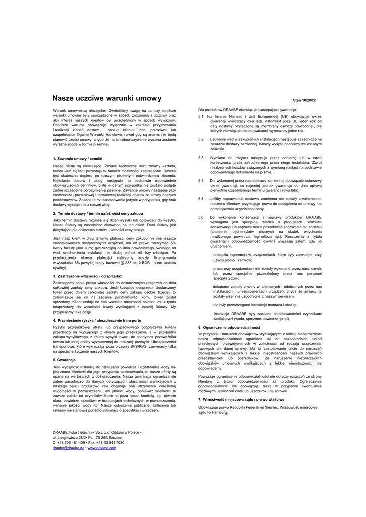 Nasze uczciwe warunki umowy Stan 10/2002 Warunki umowne są niezbędne. Zwróciliśmy uwagę na to, aby poniższe warunki umowne były sporządzone w sposób zrozumiały i uczciwy oraz aby interes naszych klientów był uwzględniony w sposób wyważony. Poniższe warunki obowiązują wyłącznie w zakresie przyjmowania i realizacji zleceń dostaw i obsługi klienta. Inne, przeciwne lub uzupełniające Ogólne Warunki Handlowe, nawet gdy są znane, nie będą stanowić części umowy, chyba że na ich obowiązywanie wydana zostanie wyraźna zgoda w formie pisemnej. Dla produktów DRAABE obowiązuje następująca gwarancja: 5.2. Usuwanie wad w zakupionych instalacjach następuje zasadniczo na zasadzie dostawy zamiennej. Koszty wysyłki ponosimy we własnym zakresie. 1. Zawarcie umowy / cenniki 5.3. Wymiana na miejscu następuje przez odbiorcę lub w razie konieczności przez zatrudnionego przez niego instalatora. Zwrot niezbędnych kosztów związanych z wymianą nastąpi na podstawie odpowiedniego dokumentu na piśmie. 5.4. Dla wykonanej przez nas dostawy zamiennej obowiązuje ustawowy okres gwarancji, co najmniej jednak gwarancja do dnia upływu pierwotnie uzgodnionego terminu gwarancji (dwa lata). 5.5. Jeśliby naprawa lub dostawa zamienna nie zostały zrealizowane, naszemu klientowi przysługuje prawo do odstąpienia od umowy lub pomniejszenia uzgodnionej ceny. 5.6. Do wykonania konserwacji i naprawy produktów DRAABE wymagana jest specjalna wiedza o produktach. Wadliwa konserwacja lub naprawa może powodować zagrożenie dla zdrowia (zapalenie pęcherzyków płucnych na skutek wdychania nawilżonego powietrza, leginelloza itp.). Roszczenia z tytułu gwarancji i odpowiedzialność cywilna wygasają zatem, gdy po uruchomieniu Nasze oferty są niewiążące. Zmiany techniczne oraz zmiany kształtu, koloru i/lub ciężaru pozostają w ramach możliwości zastrzeżone. Umowa jest skuteczna dopiero po naszym pisemnym potwierdzeniu zlecenia. Kalkulacja dostaw i usług następuje na podstawie odpowiednio obowiązujących cenników, o ile w danym przypadku nie zostało podjęte żadne szczególne porozumienie pisemne. Zawarcie umowy następuje przy zastrzeżeniu prawidłowej i terminowej realizacji dostaw ze strony naszych poddostawców. Zasada ta ma zastosowanie jedynie w przypadku, gdy brak dostawy wystąpił nie z naszej winy. 5.1. Na terenie Niemiec i Unii Europejskiej (UE) obowiązuje okres gwarancji wynoszący dwa lata, natomiast poza UE jeden rok od daty dostawy. Wyłączone są membrany osmozy odwróconej, dla których obowiązuje okres gwarancji wynoszący jeden rok. 2. Termin dostawy / termin należności ceny zakupu Jako termin dostawy rozumie się dzień wysyłki lub gotowości do wysyłki. Nasze faktury są zasadniczo datowane na ten dzień. Data faktury jest decydująca dla obliczenia terminu płatności ceny zakupu. Jeśli nasz klient w dniu terminu płatności ceny zakupu nie ma jeszcze zainstalowanych dostarczonych urządzeń, ma on prawo zatrzymać 5% kwoty faktury jako sumę gwarancyjną do dnia prawidłowego, wolnego od wad, uruchomienia instalacji, nie dłużej jednak niż trzy miesiące. Po przekroczeniu okresu płatności naliczamy koszty finansowania w wysokości 8% powyżej stopy bazowej (§ 288 pkt 2 BGB - niem. kodeks cywilny). 3. Zastrzeżenie własności / odsprzedaż Zastrzegamy sobie prawo własności do dostarczonych urządzeń do dnia całkowitej zapłaty ceny zakupu. Jeśli kupujący odsprzeda dostarczony towar przed dniem całkowitej zapłaty ceny zakupu osobie trzeciej, to zobowiązuje się on na żądanie poinformować, komu towar został sprzedany. Klient ceduje na nas wszelkie należności należne mu z tytułu odsprzedaży do wysokości kwoty wynikającej z naszej faktury. My przyjmujemy taką cesję. 4. Przeniesienie ryzyka / ubezpieczenie transportu Ryzyko przypadkowej utraty lub przypadkowego pogorszenia towaru przechodzi na kupującego z dniem jego przekazania, a w przypadku zakupu wysyłkowego, z dniem wysyłki towaru do spedytora, przewoźnika towaru lub innej osoby wyznaczonej do realizacji przesyłki. Ubezpieczenia transportowe, które wykraczają poza przepisy SVS/RVS, zawieramy tylko na specjalne życzenie naszych klientów. 5. Gwarancja Jeśli wydajność instalacji do nawilżania powietrza i uzdatniania wody nie jest znana klientowi dla jego przypadku zastosowania, to nasze oferty są oparte na wartościach z doświadczenia. Nasza gwarancja ogranicza się zatem zasadniczo do danych dotyczących właściwości wynikających z naszego opisu produktów. Nie obejmuje ona utrzymania określonej wilgotności w pomieszczeniu ani jakości wody, ponieważ wielkości te zawsze zależą od czynników, które są poza naszą kontrolą, np. otwarte okna, powietrze szkodliwe w instalacjach technicznych w pomieszczeniu, wahania jakości wody itp. Nasze ogłoszenia publiczne, zalecenia lub reklamy nie stanowią ponadto informacji o specyfikacji urządzeń. DRAABE Industrietechnik Sp.z o.o. Oddział w Polsce • ul. Langiewicza 28/2• PL - 70-263 Szczecin C: +48 606 481 409 • Fax: +48 43 841 7030 [email protected] • www.draabe.com - nastąpiła ingerencja w urządzeniach, które były zamknięte przy użyciu plomb i zamków; - prace przy urządzeniach nie zostały wykonane przez nasz serwis lub przez specjalnie przeszkolony przez nas personel specjalistyczny; - dokonane zostały zmiany w zaleconych i odebranych przez nas instalacjach i umiejscowieniach urządzeń, chyba że zmiany te zostały pisemnie uzgodnione z naszym serwisem; - nie były przestrzegane instrukcje montażu i obsługi; - instalacje DRAABE były zasilane nieodpowiednimi czynnikami zasilającymi (woda, sprężone powietrze, prąd). 6. Ograniczenie odpowiedzialności W przypadku naruszeń obowiązków wynikających z lekkiej nieostrożności nasza odpowiedzialność ogranicza się do bezpośrednich szkód przeciętnych przewidywalnych w zależności od rodzaju urządzenia, typowych dla d