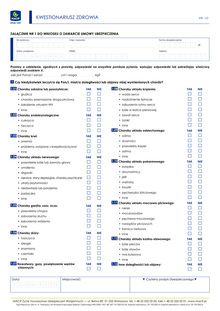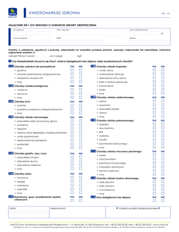KWESTIONARIUSZ ZDROWIA STR. 1/2 ZAŁĄCZNIK NR 1 DO WNIOSKU O ZAWARCIE UMOWY UBEZPIECZENIA Nr osobowy Imię i nazwisko Suma ubezpieczenia zł Data urodzenia D D PESEL M M R R R Telefon R Prosimy o udzielenie, zgodnych z prawdą, odpowiedzi na wszystkie poniższe pytania, wpisując odpowiedzi lub zakreślając właściwą odpowiedź znakiem X. Jaki jest Pana/-i wzrost: cm i waga: kg? 1 Czy kiedykolwiek leczył/a się Pan/i, miał/a dolegliwości lub objawy niżej wymienionych chorób? 1.01 Choroby zakaźne lub pasożytnicze: 1.08 Choroby układu krążenia: TAK NIE • wada serca TAK NIE • zawał serca • żylaki 1.03 Choroby krwi: TAK NIE • odma • anemia • duszności TAK NIE TAK NIE TAK NIE TAK NIE • gruźlica • choroby przenoszone drogą płciową • zakażenie wirusem HIV • inne 1.02 Choroby endokrynologiczne: • cukrzyca • tarczyca • inne • problemy związane z krzepliwością krwi • inne 1.04 Choroby układu nerwowego: • przewlekłe bóle lub zawroty głowy • omdlenia • drgawki • nerwice, stany depresyjne, choroby psychiczne • utraty przytomności • niedowłady lub porażenia • padaczka • inne 1.05 Choroby gardła, uszu, oczu: • przewlekła chrypa • zaburzenia słuchu • zaburzenia widzenia • inne 1.06 Choroby skóry: • łuszczyca • alergie • znamiona • czerniaki • inne 1.07 Nowotwory, guzy, powiększenie węzłów chłonnych: Miejscowość: Data: D D M M R R R • nadciśnienie tętnicze • zaburzenia rytmu serca • bóle w klatce piersiowej • inne 1.09 Choroby układu oddechowego: • przewlekły kaszel • astma • inne 1.10 Choroby układu pokarmowego: • żołądka • dwunastnicy • jelit • wątroby • trzustki • pęcherzyka żółciowego • inne 1.11 Choroby układu moczowo-płciowego: • nerek • moczowodów • pęcherza moczowego • narządów płciowych • kamica nerkowa • inne 1.12 Choroby układu kostno-stawowego: • bóle pleców • bóle stawów • rwa kulszowa • inne 1.13 Inne dolegliwości lub objawy: TAK NIE TAK NIE TAK NIE TAK NIE TAK NIE TAK NIE ▼ Czytelny podpis Ubezpieczonego▼ R MACIF Życie Towarzystwo Ubezpieczeń Wzajemnych — ul. Bema 89, 01-233 Warszawa, tel. + 48 22 535 02 00, faks + 48 22 535 02 01, www.macif.pl Sąd Rejonowy dla m. st. Warszawy XII Wydział Krajowego Rejestru Sądowego KRS 0000 1907 48, NIP 107-000-05-43, Kapitał zakładowy: 39 100 000 zł, Kapitał zakładowy wpłacony: 39 100 000 zł KWESTIONARIUSZ ZDROWIA STR. 2/2 2 Jeżeli odpowiedział/a Pan/i twierdząco na którekolwiek z pytań w puncie 1, prosimy o sprecyzowanie daty i przyczyny. Prosimy o dołączenie kopii ostatnich wyników badań lub historii choroby. 3 Czy kiedykolwiek przebywał/a Pan/i na zwolnieniu lekarskim dłużej niż 2 tygodnie? TAK ▼ NIE ▼ Jeśli tak, to z jakiego powodu? 4 Czy kiedykolwiek przebywał/a Pan/i w szpitalu lub był/a Pan/i operowany/-a? Jeśli tak, to kiedy i z jakiego powodu? 5 Czy obecnie jest Pan/i w trakcie diagnostyki lub leczenia? Jeśli tak, to z jakiego powodu? Przyjmowane leki: 6 Czy kiedykolwiek starał/a się Pan/i, pobierał/a lub pobiera rentę inwalidzką? Jeśli tak, to z jakiego powodu? 7 Czy pije Pan/i alkohol? Jeśli tak, prosimy podać rodzaj oraz średnie tygodniowe spożycie: 8 Czy pali Pan/i papierosy, fajkę lub cygara? Jeśli tak, prosimy podać średnią, dzienną ilość: 9 Czy kiedykolwiek Pana/-i wniosek o zawarcie umowy ubezpieczenia na życie został przyjęty na zmienionych warunkach lub odrzucony? Jeśli tak, to z jakiego powodu? Niniejszym oświadczam, iż wszelkie dane, zawarte w niniejszym kwestionariuszu zdrowia, są prawdziwe i zgodne z moją najlepszą wiedzą. Oświadczam, iż jestem świadomy/-a, że w okresie pierwszych trzech lat od mojego przystąpienia do umowy ubezpieczenia, dokonanego w oparciu o niniejszy wniosek, MACIF Życie TUW może odmówić wypłaty świadczenia określonego w umowie ubezpieczenia, w przypadku, w którym zdarzenie objęte ochroną ubezpieczeniową było skutkiem okoliczności, które nie zostały podane do wiadomości MACIF Życie TUW, lub zostały podane niezgodnie z prawdą. Jednocześnie wyrażam zgodę na poddanie się badaniom lekarskim i wykonanie dodatkowych badań diagnostycznych (z wyłączeniem badań genetycznych), w zakresie określonym przez MACIF Życie TUW. Miejscowość: Data: D M M R R R R Wypełnia lekarz Towarzystwa Data: Imię i nazwisko: D ATN ODRO ODMO ATP STA D M M R R R R Data: w ▼ Podpis lekarza ▼ OKR WYŁ MACIF Życie Towarzystwo Ubezpieczeń Wzajemnych — ul. Bema 89, 01-233 Warszawa, tel. + 48 22 535 02 00, faks + 48 22 535 02 01, www.macif.pl Sąd Rejonowy dla m. st. Warszawy XII Wydział Krajowego Rejestru Sądowego KRS 0000 1907 48, NIP 107-000-05-43, Kapitał zakładowy: 39 100 000 zł, Kapitał zakładowy wpłacony: 39 100 000 zł KZ/08/16 D ▼ Czytelny podpis Ubezpieczonego▼