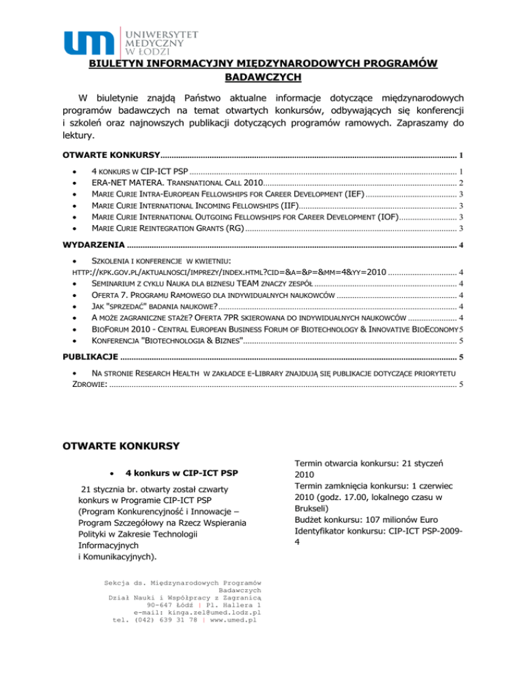 BIULETYN INFORMACYJNY MIĘDZYNARODOWYCH PROGRAMÓW BADAWCZYCH W biuletynie znajdą Państwo aktualne informacje dotyczące międzynarodowych programów badawczych na temat otwartych konkursów, odbywających się konferencji i szkoleń oraz najnowszych publikacji dotyczących programów ramowych. Zapraszamy do lektury. OTWARTE KONKURSY ..................................................................................................................................... 1 4 KONKURS W CIP-ICT PSP ........................................................................................................................ 1 ERA-NET MATERA. TRANSNATIONAL CALL 2010....................................................................................... 2 MARIE CURIE INTRA-EUROPEAN FELLOWSHIPS FOR CAREER DEVELOPMENT (IEF) ......................................... 3 MARIE CURIE INTERNATIONAL INCOMING FELLOWSHIPS (IIF)....................................................................... 3 MARIE CURIE INTERNATIONAL OUTGOING FELLOWSHIPS FOR CAREER DEVELOPMENT (IOF) .......................... 3 MARIE CURIE REINTEGRATION GRANTS (RG) ............................................................................................... 3 WYDARZENIA .................................................................................................................................................... 4 SZKOLENIA I KONFERENCJE W KWIETNIU: HTTP://KPK.GOV.PL/AKTUALNOSCI/IMPREZY/INDEX.HTML?CID=&A=&P=&MM=4&YY=2010 ............................... 4 SEMINARIUM Z CYKLU NAUKA DLA BIZNESU TEAM ZNACZY ZESPÓŁ ................................................................ 4 OFERTA 7. PROGRAMU RAMOWEGO DLA INDYWIDUALNYCH NAUKOWCÓW ...................................................... 4 JAK "SPRZEDAĆ" BADANIA NAUKOWE? ........................................................................................................... 4 A MOŻE ZAGRANICZNE STAŻE? OFERTA 7PR SKIEROWANA DO INDYWIDUALNYCH NAUKOWCÓW ...................... 4 BIOFORUM 2010 - CENTRAL EUROPEAN BUSINESS FORUM OF BIOTECHNOLOGY & INNOVATIVE BIOECONOMY 5 KONFERENCJA "BIOTECHNOLOGIA & BIZNES"................................................................................................ 5 PUBLIKACJE ....................................................................................................................................................... 5 • NA STRONIE RESEARCH HEALTH W ZAKŁADCE E-LIBRARY ZNAJDUJĄ SIĘ PUBLIKACJE DOTYCZĄCE PRIORYTETU ZDROWIE: ............................................................................................................................................................ 5 OTWARTE KONKURSY 4 konkurs w CIP-ICT PSP 21 stycznia br. otwarty został czwarty konkurs w Programie CIP-ICT PSP (Program Konkurencyjność i Innowacje – Program Szczegółowy na Rzecz Wspierania Polityki w Zakresie Technologii Informacyjnych i Komunikacyjnych). Sekcja ds. Międzynarodowych Programów Badawczych Dział Nauki i Współpracy z Zagranicą 90-647 Łódź | Pl. Hallera 1 e-mail: [email protected] tel. (042) 639 31 78 | www.umed.pl Termin otwarcia konkursu: 21 styczeń 2010 Termin zamknięcia konkursu: 1 czerwiec 2010 (godz. 17.00, lokalnego czasu w Brukseli) Budżet konkursu: 107 milionów Euro Identyfikator konkursu: CIP-ICT PSP-20094 Dokumenty konkursu: http://www.kpk.gov.pl/p/pliki/10678/CIPICT%20PSP_Call%20Fiche.pdf http://www.kpk.gov.pl/p/pliki/10684/CIPICT%20PSP_broszura_call4.pdf http://www.kpk.gov.pl/p/pliki/10679/CIPICT%20PSP_WORK%20PROGRAMME_201 0.pdf http://www.kpk.gov.pl/p/pliki/10681/GUID E%20FOR%20APPLICANTS_Pilot_A.pdf http://www.kpk.gov.pl/p/pliki/10682/GUID E%20FOR%20APPLICANTS_Pilot_B.pdf http://www.kpk.gov.pl/p/pliki/10683/GUID E%20FOR%20APPLICANTS_Thematic%20 Networks.pdf http://www.kpk.gov.pl/p/pliki/10680/GUID E%20FOR%20APPLICANTS_Best%20Practi ce%20Network_2010.pdf Strona konkursu: http://tinyurl.com/eceuropa-cip-call-4 Temat 3: ICT na rzecz zdrowia i społecznej spójności 13,5 mln € Poprawa dostępu do usług medycznych 3.1 Enlargement of the Pilot "epSOS" instrument: Pilot A 3.2 Scaling up of eHealth services instrument: Sieć tematyczna (TN) 3.3 e-Accessibility of Public Digital Terminals - instrument: Pilot B 3.4 Assistive technologies and accessibility portal - instrument: Sieć tematyczna (TN) Polska strona Programu CIP-ICT PSP: http://www.cip.gov.pl/ict-psp-kpkippt Strona Komisji Europejskiej dotycząca Programu CIP-ICT PSP: http://ec.europa.eu/information_society/ac tivities/ict_psp/index_en.htm (Źródło: http://www.kpk.gov.pl/aktualnosci/showne ws.html?id=9857) Sekcja ds. Międzynarodowych Programów Badawczych Dział Nauki i Współpracy z Zagranicą 90-647 Łódź | Pl. Hallera 1 e-mail: [email protected] tel. (042) 639 31 78 | www.umed.pl ERA-NET MATERA. Transnational Call 2010 Narodowe Centrum Badań i Rozwoju informuje, że w dn. 15.02.2010 r. został otwarty międzynarodowy konkursu w ramach projektu ERA-NET MATERA. Tematyka konkursu skupia się na trzech obszarach: - Biomaterials for human health improvement - Materials with tailored properties - High performance engineering materials Polska jako członek konsorcjum ERA-NET MATERA dysponuje budżetem na finansowanie projektów, wyłonionych w drodze konkursu, w wysokości 1,2 mln euro w okresie 3 lat. O dofinansowanie z NCBiR mogą wnioskować polskie jednostki naukowe a także przedsiębiorstwa zgodnie z wymogami prawa krajowego, zawartymi w informacji dla wnioskodawców. Konkurs jest dwuetapowy. Termin nadsyłania wstępnych wniosków (tzw. pre-proposals, składanych przez koordynatorów projektów poprzez elektroniczny system składania wniosków) upływa 26.04.2010r. Jednocześnie wnioskodawca jest zobowiązany przesłać do Centrum drogą mailową „Formularz zgłoszenia projektu do konkursu” w języku polskim, na adres: [email protected] W drugim etapie konkursu, termin składania pełnych wniosków (tzw. full proposals, składanych przez ko