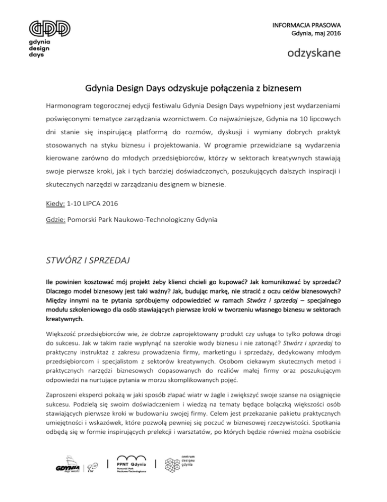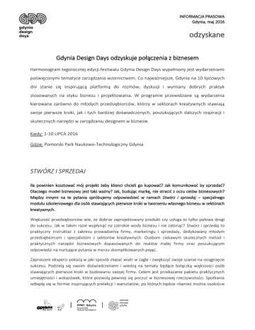 INFORMACJA PRASOWA Gdynia, maj 2016 odzyskane Gdynia Design Days odzyskuje połączenia z biznesem Harmonogram tegorocznej edycji festiwalu Gdynia Design Days wypełniony jest wydarzeniami poświęconymi tematyce zarządzania wzornictwem. Co najważniejsze, Gdynia na 10 lipcowych dni stanie się inspirującą platformą do rozmów, dyskusji i wymiany dobrych praktyk stosowanych na styku biznesu i projektowania. W programie przewidziane są wydarzenia kierowane zarówno do młodych przedsiębiorców, którzy w sektorach kreatywnych stawiają swoje pierwsze kroki, jak i tych bardziej doświadczonych, poszukujących dalszych inspiracji i skutecznych narzędzi w zarządzaniu designem w biznesie. Kiedy: 1-10 LIPCA 2016 Gdzie: Pomorski Park Naukowo-Technologiczny Gdynia STWÓRZ I SPRZEDAJ Ile powinien kosztować mój projekt żeby klienci chcieli go kupować? Jak komunikować by sprzedać? Dlaczego model biznesowy jest taki ważny? Jak, budując markę, nie stracić z oczu celów biznesowych? Między innymi na te pytania spróbujemy odpowiedzieć w ramach Stwórz i sprzedaj – specjalnego modułu szkoleniowego dla osób stawiających pierwsze kroki w tworzeniu własnego biznesu w sektorach kreatywnych. Większość przedsiębiorców wie, że dobrze zaprojektowany produkt czy usługa to tylko połowa drogi do sukcesu. Jak w takim razie wypłynąć na szerokie wody biznesu i nie zatonąć? Stwórz i sprzedaj to praktyczny instruktaż z zakresu prowadzenia firmy, marketingu i sprzedaży, dedykowany młodym przedsiębiorcom i specjalistom z sektorów kreatywnych. Osobom ciekawym skutecznych metod i praktycznych narzędzi biznesowych dopasowanych do realiów małej firmy oraz poszukującym odpowiedzi na nurtujące pytania w morzu skomplikowanych pojęć. Zaproszeni eksperci pokażą w jaki sposób złapać wiatr w żagle i zwiększyć swoje szanse na osiągnięcie sukcesu. Podzielą się swoim doświadczeniem i wiedzą na tematy będące bolączką większości osób stawiających pierwsze kroki w budowaniu swojej firmy. Celem jest przekazanie pakietu praktycznych umiejętności i wskazówek, które pozwolą pewniej się poczuć w biznesowej rzeczywistości. Spotkania odbędą się w formie inspirujących prelekcji i warsztatów, po których będzie również można osobiście INFORMACJA PRASOWA Gdynia, maj 2016 odzyskane porozmawiać z prowadzącymi. ”Stwórz i Sprzedaj” to także okazja do networkingu w swobodnej atmosferze. KIEDY 4 – 8 lipca PROGRAM 4.07 (poniedziałek), godz. 9:30-16:00 Relacje z mediami w branży kreatywnej – indywidualne konsultacje prowadzący: Małgorzata Szczepańska | Elle Decoration 4.07 (poniedziałek), godz. 18:00-19:30 Firma w budowie vs. marka w budowie – 10 najważniejszych elementów - wykład prowadzący: Tomasz Szymański | beginning|creative collaboration agency 5.07 (wtorek), godz. 10:00-16:00 Stephen Hawking i muszka owocówka. Jak komunikować projekty biznesowe – warsztat z możliwością indywidualnych konsultacji prowadzący: Piotr Bucki 6.07 (środa), godz. 10:00-16:00 DESIGNuj swój pomysł na biznes!– warsztat z projektowania modeli biznesowych prowadząca: Ewa Ropela | Strefa Startup PPNT Gdynia 7.07 (czwartek), godz. 18:00-19:30 Jak wypromować projekty w sieci? – wykład prowadzący: Michał Bachowski | F5 8.07 (piątek), godz. 18:00-19:30 Jak wyceniać pracę w branży kreatywnej? – wykład prowadzący: Jacek Kłosiński | Studio Engram Na wydarzenia wymagana jest wcześniejsza rejestracja. Szczegóły na stronie gdyniadesigndays.eu INFORMACJA PRASOWA Gdynia, maj 2016 odzyskane DESIGN JĘZYKIEM BIZNESU | spotkania&warsztaty Poznaj, jak tworzyć przewagę konkurencyjną w oparciu o design. Stale zmieniające się światowe rynki i społeczeństwo przynoszą ze sobą nowe potrzeby, wyzwania i standardy w produkcji oraz zarządzaniu usługami, informacją i interakcjami. Ci, którzy wprowadzają nowe rozwiązania, lub szybko reagują na zmianę, wyróżniają się przez to jak łączą kreatywność z myśleniem strategicznym. W ekonomii przesytu, gdzie zmiany mierzone są w miesiącach, najsilniejsza przewaga konkurencyjna przychodzi w postaci rozwiązań biznesowych tworzonych w oparciu o design. Aktualnie przedstawiciele każdego z przemysłów korzystają z potencjału design thinking uzyskując lepsze wyniki i wyróżniając się na tle konkurencji. Design w biznesie nie jest tylko formą i kolorem. Jest świadomym scenariuszem na przyszłość, a kreatywni przedsiębiorcy nowymi liderami zmian i menedżerami biznesu odważnie tworzącymi poza ograniczeniami współczesnych rozwiązań. Celem wydarzenia jest dostarczenie inspiracji i rzeczywistych przykładów ze świata biznesu oraz stworzenie przestrzeni do networkingu, wymiany oraz zdobycia praktycznych narzędzi. KIEDY 8 lipca, 9:00 - 22:00 DLA KOGO? Wydarzenie skierowane jest do przedsiębiorców chcących zgłębić temat roli designu w rozwoju i wzmacnianiu biznesu. Dla projektantów jest to przestrzeń spotkań z biznesem i rozmów we wspólnym języku. PROGRAM 09:00 - 09:50 - rejestracja + kawa & rozmowy 10:00 - 12:40 - inspiracje + studium przypadku wprowadzenie: Przemysław Powalacz (Prezes zarządu Geberit Sp. z o. o.) Bartosz Stodulski (Współzałożyciel i CEO Laboratorium EE) Zuzanna Skalska (Badaczka trendów z 360°inspiration) Agata Nowotny (Socjolożka, red. naczelna Futu) Studium Przypadku I: Bank Millennium S.A. “Service Design w Banku Millennium” Magdalena Macko (Dyrektor Departamentu Jakości, Bank Millennium S.A.) dr Magdalena Kochanowska (Design konsultant, DESIGN ProVision) INFORMACJA PRASOWA Gdynia, maj 2016 odzyskane Studium Przypadku II: RAGABA “RAGABA leci w kosmos” Justyna Bielawska (Dyrektor sprzedaży, RAGABA) Magdalena Garncarz (Architekt wnętrz, Hanczar Studio) Szymon Hanczar (Architekt wnętrz, Hanczar Studio) 12:50 - 13:30 - lunch + networking 13:30 - 14:30 - 5x5 świeże idee Pięć pięciominutowych prezentacji świeżych przykła