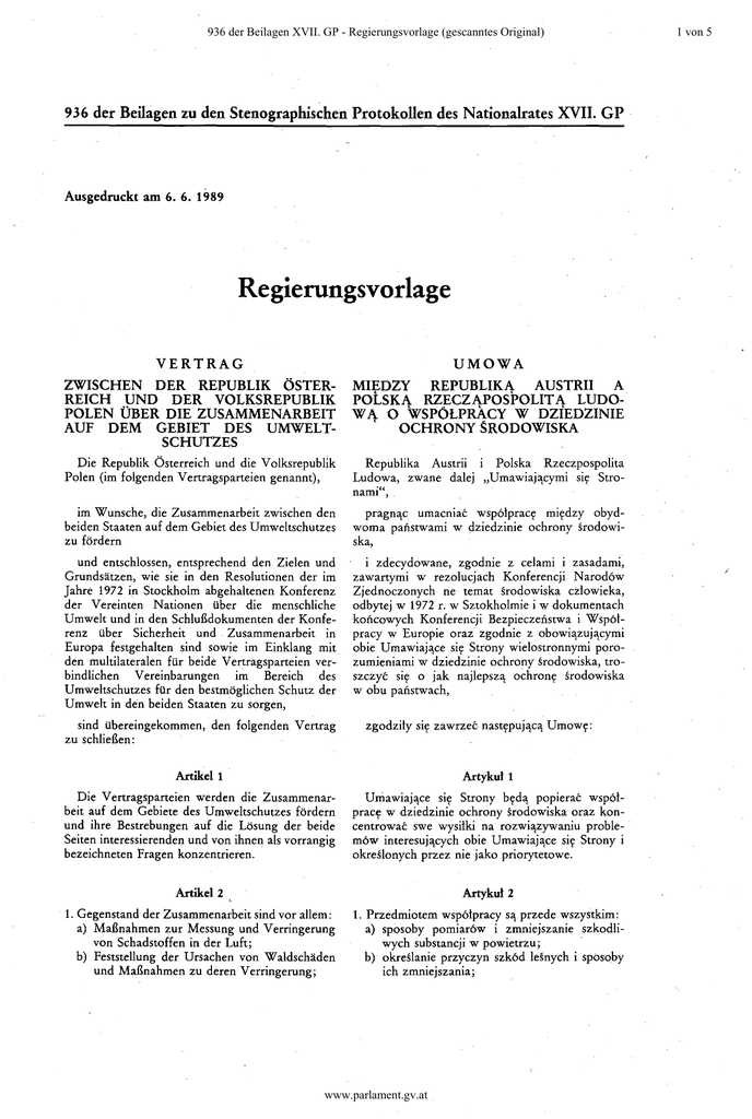 936 der Beilagen XVII. GP - Regierungsvorlage (gescanntes Original) 936 der Beilagen zu den Stenographischen Protokollen des Nationalrates XVII. GP Ausgedruckt am 6. 6. 1989 Regierungsvorlage VERTRAG UMOWA ZWISCHEN DER REPUBLIK ÖSTERREICH UND DER VOLKSREPUBLIK POLEN ÜBER DIE ZUSAMMENARBEIT AUF DEM GEBIET DES UMWELTSCHUTZES MIf,DZY REPUBLIKA AUSTRII A POLSKA RZECZAPOSPOLIT A LUDOW 1\ 0 WSPÖLPRACY W DZIEDZINIE OCHRONY SRODOWISKA Die Republik Österreich und die Volksrepublik Polen (im folgenden Vertragsparteien genannt), Republika Austrii i Polska Rzeczpospolita Ludowa, zwane dalej "Umawiaja,cymi si~ Stronami", im Wunsche, die Zusammenarbeit zwischen den beiden Staaten auf dem Gebiet des Umweltschutzes zu fördern pragna,c umacniac wsp6lprac~ mi~dzy obydwoma pafistwami w dziedzinie ochrony srodowiska, und entschlossen, entsprechend den Zielen und Grundsätzen, wie sie inden Resolutionen der im Jahre 1972 in Stockholm abgehaltenen Konferenz der Vereinten Nationen über die menschliche Umwelt und in den Schlußdokumenten der Konferenz über Sicherheit und Zusammenarbeit in Europa festgehalten sind sowie im Einklang mit. den multilateralen für beide Vertragsparteien verbindlichen Vereinbarungen im Bereich des Umweltschutzes für den bestmöglichen Schutz der Umwelt in den beiden Staaten zu sorgen, i zdecydowane, zgodnie z celami i zasadami, zawartymi w rezolucjach Konferencji Narod6w Zjednoczonych ne temat srodowiska c:lIowieka, odbytej w 1972 r. w Sztokholmie i w dokumentach koficowych Konferencji Bezpieczefistwa i Wsp61pracy w Europie oraz zgodnie z obowia,zuja,cymi obie Umawiaja,ce si~ Strony wielostronnymi porozumieniami w dziedzinie ochrony srodowiska, troszczyc si~ 0 jak najlepsza, ochron~ srodowiska w obu pafistwach, sind übereingekommen, den folgenden Vertrag zu schließen: zgodzily si~ Artikell zawrzec nast~puja,ca, Umow~: Artykull Die Vertragsparteien werden die Zusammenarbeit auf dem Gebiete des Umweltschutzes fördern und ihre Bestrebungen auf die Lösung der beide Seiten interessierenden und von ihnen als vorrangig bezeichneten Fragen konzentrieren. Umawiaja,ce si~ Strony b~da, popierac wsp61w dziedzinie ochrony srodowiska oraz koncentrowac swe wysiiki na rozwia,zywaniu problem6w interesuja,cych obie Umawiaja,ce si~ Strony i okreslonych przez nie jako priorytetowe. prac~ Artikel 2 Artykul2 1. Gegenstand der Zusammenarbeit sind vor allem: a) Maßnahmen zur Messung und Verringerung von Schadstoffen in der Luft; b) Feststellung der Ursachen von Waldschäden und Maßnahmen zu deren Verringerung; 1. Przedmiotem wsp6ipracy sa, przede wszystkim: a) sposoby pomiar6w i zmniejszanie szkodliwych substancji w powietrzu; . b) okreSlanie przyczyn szk6d lesnych i sposoby ich zmniejszania; www.parlament.gv.at 1 von 5 2 von 5 936 der Beilagen XVII. GP - Regierungsvorlage (gescanntes Original) 936 der Beilagen 2 c) Vermeidung, Verwertung und schadlose Beseitigung von Abfällen; d) Erfahrungs- und Informationsaustausch über Maßnahmen zum Schutz des Bodens; e) Erfahrungs- und Informationsaustausch über Maßnahmen zum Schutz der Gewässer; f) Umwelterziehung .. c) eliminacja, utylizacja unieszkodliwianie odpadöw; d) wymiana doswiadczen i informacji na temat srodköw ochrony gleb; e) wymiana doswiadczen i informacji na temat srodk6w ochrony wöd; f) wychowanie w duchu ochrony srodowiska. 2. Die Zusammenarbeit erfolgt in folgenden Formen: a) Austausch von Erfahrungen auf den Gebieten der Planung und Organisation des Umweltschutzes und der Umweltgestaltung sowie der einschlägigen angewandten Forschung; 0) Austausch von Experten und anderen auf dem Gebiet des Umweltschutzes tätigen Personen zum Zwecke der gegenseitigen Information 'und Weiterbildung; c) Austausch von in einer der beiden Vertrags~ parteien erscheinenden wissenschaftlichen Veröffentlichungen, Fachzeitschriften, Gesetzestexten sowie sonstigen für den Umweltschutz maßgebenden Vorschriften und Richtlinien; d) Teilnahme an den von einer der beiden Seiten durchgeführten fachwissenschaftlichen Veranstaltungen. 2. Wsp61praca odbywac sicr bcrdzie w nastcrpuja,cych formach: a) wymiana doswiadczen w dziedzinie planowania i organizacji ochrony i ksztaltowania srodowiska oraz odnosnych stosowanych badan naukowych; b) wymiana ekspert6w i innych osöb, dzialaja,cych w dziedzinie ochrony srodowiska, w celu wzajemnego informowania sicr i rozszerzania wiedzy; c) wymiana wydawanych przez kazda, z obu Umawiaja,cych sicr Stron publikacji naukowych, czasopism fachowych, tekst6w ustaw oraz innych odpowiednich przeplSOW i wytycznych w dziedzinie ochrony srodowiskai d) udzial w organizowanych przez jedna, z Umawiaja,cych sicr Stron fachowych spotkaniach naukowych. 3. Die Vertragsparteien werden ihre staatlichen und privaten auf dem Gebiet des Umweltschutzes tätigen Institutionen zur umfassenden Zusammenarbeit, darunter auch im Bereich der Technologie von Umweltschutzanlagen ermutigen. 3. Umawiaja,ce sicr Strony bcrda, zachcrcac swe panstwowe i prywatne instytucje dzialaja,ce w dziedzinie ochrony srodowiska do wszechstronnej wsp61pracy w dziedzinie technologii urza,dzen sluza,cych do ochrony srodowiska. Artikel 3 Artykul3 Im Falle der Entsendung von Experten und anderen auf dem Gebiet des Umweltschutzes tätigen Personen trägt die entsendende Seite die Reisekosten. Die empfangende Seite trägt die Aufenthaltskosten einschließlich der Kosten für die mit dem Zweck des Aufenthaltes verbundenen Reisen innerhalb des Gastlandes. W przypadku wysylania ekspert6w i innych os6b, dzialaja,cych w dziedzinie ochrony srodowiska, koszty podrözy pokrywa Strona wysylalja,ca. Strona przyjmuja,ca pokrywa koszty pobytu wraz z kosztami przejazd6w na terytorium panstwa przyjmuja,cego zwia,zanych z celem pobytu. Artikel 4 Artykul4 Zur Durchführung dieses Vertrages werden abwechselnd in einer der Vertragsparteien durch die zuständigen Behörden Arbeitspläne mit einer Geltungsdauer von jeweils drei Jahren vereinbart und die Arbeit der abgelaufenen Periode beurteilt.