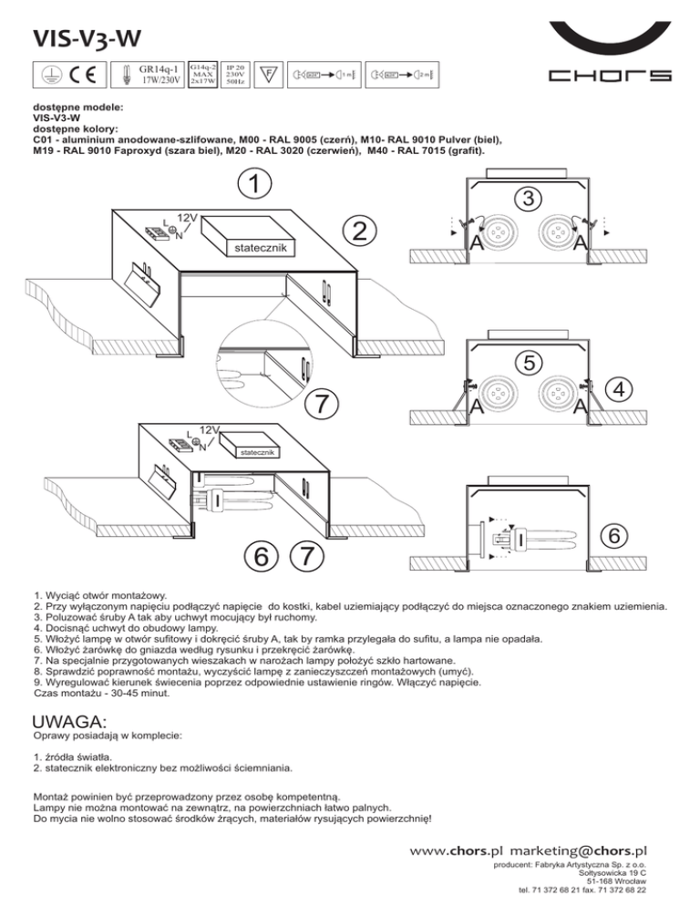 VIS-V3-W GR14q-1 17W/230V G14q-2 MAX 2x17W IP 20 230V 50Hz F 24 1m 24 2m dostępne modele: VIS-V3-W dostępne kolory: C01 - aluminium anodowane-szlifowane, M00 - RAL 9005 (czerń), M10- RAL 9010 Pulver (biel), M19 - RAL 9010 Faproxyd (szara biel), M20 - RAL 3020 (czerwień), M40 - RAL 7015 (grafit). 1 L 3 12V 2 N statecznik A A 5 7 L 12V N A A 4 statecznik 6 6 7 1. Wyciąć otwór montażowy. 2. Przy wyłączonym napięciu podłączyć napięcie do kostki, kabel uziemiający podłączyć do miejsca oznaczonego znakiem uziemienia. 3. Poluzować śruby A tak aby uchwyt mocujący był ruchomy. 4. Docisnąć uchwyt do obudowy lampy. 5. Włożyć lampę w otwór sufitowy i dokręcić śruby A, tak by ramka przylegała do sufitu, a lampa nie opadała. 6. Włożyć żarówkę do gniazda według rysunku i przekręcić żarówkę. 7. Na specjalnie przygotowanych wieszakach w narożach lampy położyć szkło hartowane. 8. Sprawdzić poprawność montażu, wyczyścić lampę z zanieczyszczeń montażowych (umyć). 9. Wyregulować kierunek świecenia poprzez odpowiednie ustawienie ringów. Włączyć napięcie. Czas montażu - 30-45 minut. UWAGA: Oprawy posiadają w komplecie: 1. źródła światła. 2. statecznik elektroniczny bez możliwości ściemniania. Montaż powinien być przeprowadzony przez osobę kompetentną. Lampy nie można montować na zewnątrz, na powierzchniach łatwo palnych. Do mycia nie wolno stosować środków żrących, materiałów rysujących powierzchnię! www.chors.pl [email protected] producent: Fabryka Artystyczna Sp. z o.o. Sołtysowicka 19 C 51-168 Wrocław tel. 71 372 68 21 fax. 71 372 68 22