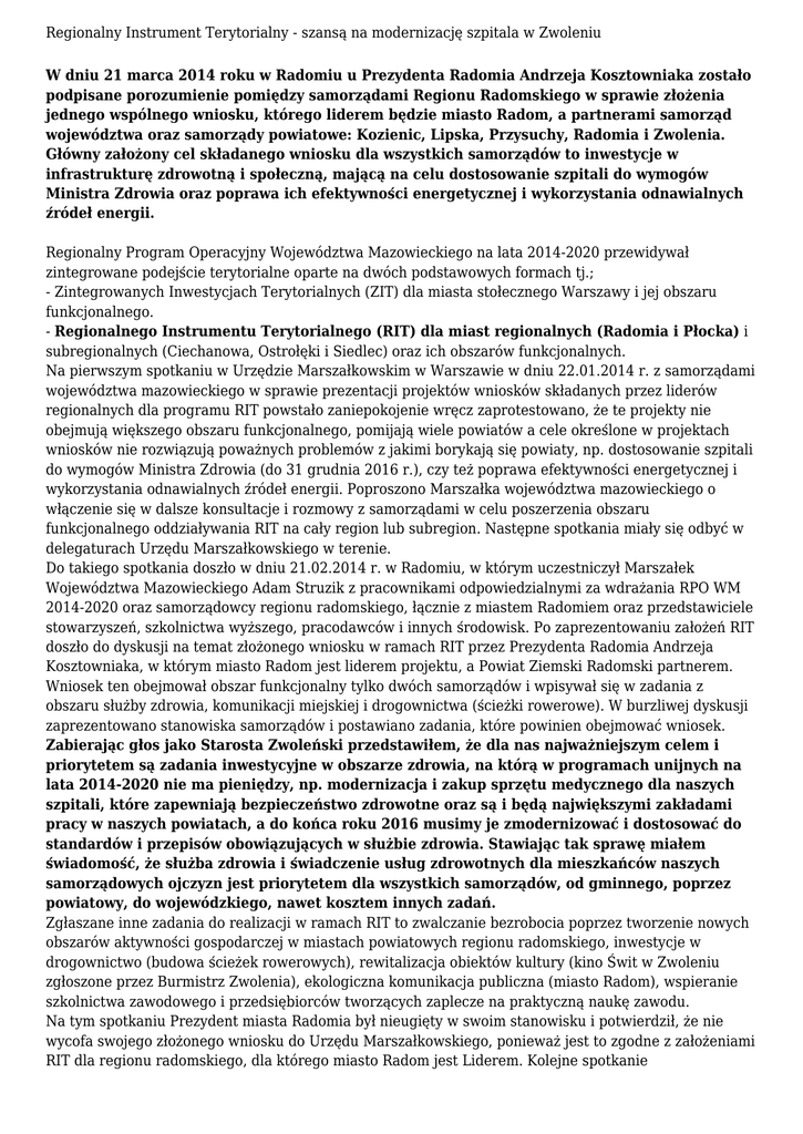 Regionalny Instrument Terytorialny - szansą na modernizację szpitala w Zwoleniu W dniu 21 marca 2014 roku w Radomiu u Prezydenta Radomia Andrzeja Kosztowniaka zostało podpisane porozumienie pomiędzy samorządami Regionu Radomskiego w sprawie złożenia jednego wspólnego wniosku, którego liderem będzie miasto Radom, a partnerami samorząd województwa oraz samorządy powiatowe: Kozienic, Lipska, Przysuchy, Radomia i Zwolenia. Główny założony cel składanego wniosku dla wszystkich samorządów to inwestycje w infrastrukturę zdrowotną i społeczną, mającą na celu dostosowanie szpitali do wymogów Ministra Zdrowia oraz poprawa ich efektywności energetycznej i wykorzystania odnawialnych źródeł energii. Regionalny Program Operacyjny Województwa Mazowieckiego na lata 2014-2020 przewidywał zintegrowane podejście terytorialne oparte na dwóch podstawowych formach tj.; - Zintegrowanych Inwestycjach Terytorialnych (ZIT) dla miasta stołecznego Warszawy i jej obszaru funkcjonalnego. - Regionalnego Instrumentu Terytorialnego (RIT) dla miast regionalnych (Radomia i Płocka) i subregionalnych (Ciechanowa, Ostrołęki i Siedlec) oraz ich obszarów funkcjonalnych. Na pierwszym spotkaniu w Urzędzie Marszałkowskim w Warszawie w dniu 22.01.2014 r. z samorządami województwa mazowieckiego w sprawie prezentacji projektów wniosków składanych przez liderów regionalnych dla programu RIT powstało zaniepokojenie wręcz zaprotestowano, że te projekty nie obejmują większego obszaru funkcjonalnego, pomijają wiele powiatów a cele określone w projektach wniosków nie rozwiązują poważnych problemów z jakimi borykają się powiaty, np. dostosowanie szpitali do wymogów Ministra Zdrowia (do 31 grudnia 2016 r.), czy też poprawa efektywności energetycznej i wykorzystania odnawialnych źródeł energii. Poproszono Marszałka województwa mazowieckiego o włączenie się w dalsze konsultacje i rozmowy z samorządami w celu poszerzenia obszaru funkcjonalnego oddziaływania RIT na cały region lub subregion. Następne spotkania miały się odbyć w delegaturach Urzędu Marszałkowskiego w terenie. Do takiego spotkania doszło w dniu 21.02.2014 r. w Radomiu, w którym uczestniczył Marszałek Województwa Mazowieckiego Adam Struzik z pracownikami odpowiedzialnymi za wdrażania RPO WM 2014-2020 oraz samorządowcy regionu radomskiego, łącznie z miastem Radomiem oraz przedstawiciele stowarzyszeń, szkolnictwa wyższego, pracodawców i innych środowisk. Po zaprezentowaniu założeń RIT doszło do dyskusji na temat złożonego wniosku w ramach RIT przez Prezydenta Radomia Andrzeja Kosztowniaka, w którym miasto Radom jest liderem projektu, a Powiat Ziemski Radomski partnerem. Wniosek ten obejmował obszar funkcjonalny tylko dwóch samorządów i wpisywał się w zadania z obszaru służby zdrowia, komunikacji miejskiej i drogownictwa (ścieżki rowerowe). W burzliwej dyskusji zaprezentowano stanowiska samorządów i postawiano zadania, które powinien obejmować wniosek. Zabierając głos jako Starosta Zwoleński przedstawiłem, że dla nas najważniejszym celem i priorytetem są zadania inwestycyjne w obszarze zdrowia, na którą w programach unijnych na lata 2014-2020 nie ma pieniędzy, np. modernizacja i zakup sprzętu medycznego dla naszych szpitali, które zapewniają bezpieczeństwo zdrowotne oraz są i będą największymi zakładami pracy w naszych powiatach, a do końca roku 2016 musimy je zmodernizować i dostosować do standardów i przepisów obowiązujących w służbie zdrowia. Stawiając tak sprawę miałem świadomość, że służba zdrowia i świadczenie usług zdrowotnych dla mieszkańców naszych samorządowych ojczyzn jest priorytetem dla wszystkich samorządów, od gminnego, poprzez powiatowy, do wojewódzkiego, nawet kosztem innych zadań. Zgłaszane inne zadania do realizacji w ramach RIT to zwalczanie bezrobocia poprzez tworzenie nowych obszarów aktywności gospodarczej w miastach powiatowych regionu radomskiego, inwestycje w drogownictwo (budowa ścieżek rowerowych), rewitalizacja obiektów kultury (kino Świt w Zwoleniu zgłoszone przez Burmistrz Zwolenia), ekologiczna komunikacja publiczna (miasto Radom), wspieranie szkolnictwa zawodowego i przedsiębiorców tworzących zaplecze na praktyczną naukę zawodu. Na tym spotkaniu Prezydent miasta Radomia był nieugięty w swoim stanowisku i potwierdził, że nie wycofa swojego złożonego wniosku do Urzędu Marszałkowskiego, ponieważ jest to zgodne z założeniami RIT dla regionu radomskiego, dla którego miasto Radom jest Liderem. Kolejne spotkanie Regionalny Instrument Terytorialny - szansą na modernizację szpitala w Zwoleniu samorządowców regionu radomskiego w urzędzie marszałkowskim w Warszawie nie zmieniło stanowiska Prezydenta Radomia. Spotkanie zakończyło się wnioskiem, aby Zarząd WM ponownie przeanalizował definicję obszaru funkcjonalnego i poszerzył jego zasięg na cały region, czy subregion, uwzględniając postulaty wnoszone przez samorządy powiatowe i gminne. Na kolejnym spotkaniu w Radomiu w delegaturze urzędu WM Wicemarszałek Leszek Ruszczyk, który przewodniczył naradzie przedstawił nowe założenia dla RIT zatwierdzone przez Zarząd WM w Warszawie. RIT dla WM ma uwzględniać współpracę i partnerstwo dla jak największej grupy samorządów, a realizowane zadanie mają być wypracowanym kompromisem, który ma łączyć samorządy regionu czy subregionu, zdefiniowanego jako obszar funkcjonalny. Na tym spotkaniu podjęto decyzję, że samorządy złożą do Urzędu Miejskiego w Radomiu swoje wnioski z propozycjami zadań inwestycyjnych, ale już była wstępna zgoda, że priorytet to obszar służby zdrowia, co się potwierdziło na następnym spotkaniu w Urzędzie Miejskim w Radomiu w dniu 21 marca br. W dniu 21 marca 2014 roku w Urzędzie Miejskim w Radomiu u Prezydenta Andrzeja Kosztowniaka zostało podpisane porozumienie pomiędzy samorządami Regionu Radomskiego w sprawi