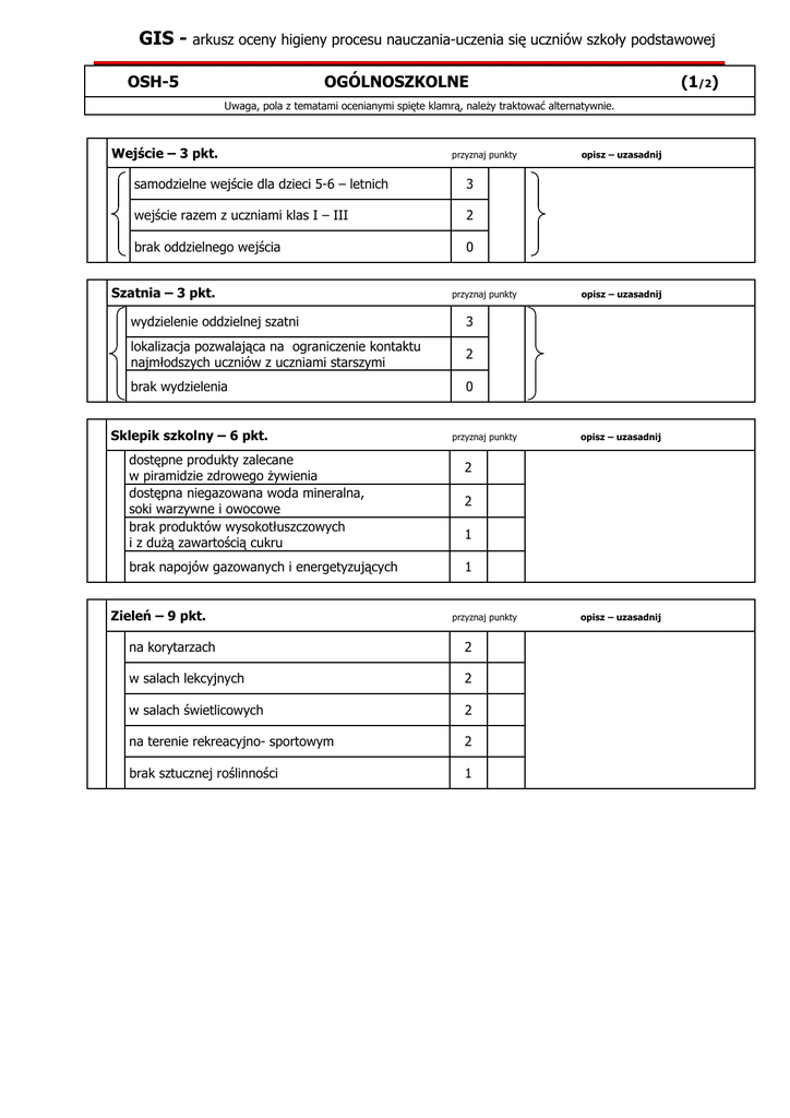 GIS - arkusz oceny higieny procesu nauczania-uczenia się uczniów szkoły podstawowej OSH-5 OGÓLNOSZKOLNE (1/2) Uwaga, pola z tematami ocenianymi spięte klamrą, należy traktować alternatywnie. Wejście – 3 pkt. przyznaj punkty samodzielne wejście dla dzieci 5-6 – letnich 3 wejście razem z uczniami klas I – III 2 brak oddzielnego wejścia 0 Szatnia – 3 pkt. przyznaj punkty wydzielenie oddzielnej szatni 3 lokalizacja pozwalająca na ograniczenie kontaktu najmłodszych uczniów z uczniami starszymi 2 brak wydzielenia 0 Sklepik szkolny – 6 pkt. dostępne produkty zalecane w piramidzie zdrowego żywienia dostępna niegazowana woda mineralna, soki warzywne i owocowe brak produktów wysokotłuszczowych i z dużą zawartością cukru brak napojów gazowanych i energetyzujących Zieleń – 9 pkt. przyznaj punkty opisz – uzasadnij opisz – uzasadnij opisz – uzasadnij 2 2 1 1 przyznaj punkty na korytarzach 2 w salach lekcyjnych 2 w salach świetlicowych 2 na terenie rekreacyjno- sportowym 2 brak sztucznej roślinności 1 opisz – uzasadnij GIS - arkusz oceny higieny procesu nauczania-uczenia się uczniów szkoły podstawowej OSH-5 OGÓLNOSZKOLNE (2/2) Uwaga, pola z tematami ocenianymi spięte klamrą, należy traktować alternatywnie. Świetlica – 11 pkt. zagwarantowanie uczniom pobytu pod opieką pedagogów w godzinach popołudniowych umożliwienie udziału w różnorodnych zajęciach pozalekcyjnych przyznaj punkty 1 1 w świetlicy odbywają się zajęcia ruchowe 1 codzienne zajęcia, gry i zabawy na świeżym powietrzu 3 godziny dostosowane do potrzeb rodziców 1 dostęp do wody niegazowanej 3 lub innych napojów niegazowanych 1 Boisko szkolne – 5 pkt. przyznaj punkty boiska dostosowane do gier zbiorowych 2 plac zabaw 3 Stan higieniczno-sanitarny – 6 pkt. przyznaj punkty toalety czyste, pachnące 1 toalety z ciepłą, bieżącą wodą 1 toalety z mydłem w dozownikach 1 w toaletach ręczniki papierowe lub suszarka 1 czyste podłogi (sprzątane na bieżąco w miarę potrzeb) czyste (bez kurzu i brudu) okna, parapety, meble itp. opisz – uzasadnij 1 1 opisz – uzasadnij opisz – uzasadnij