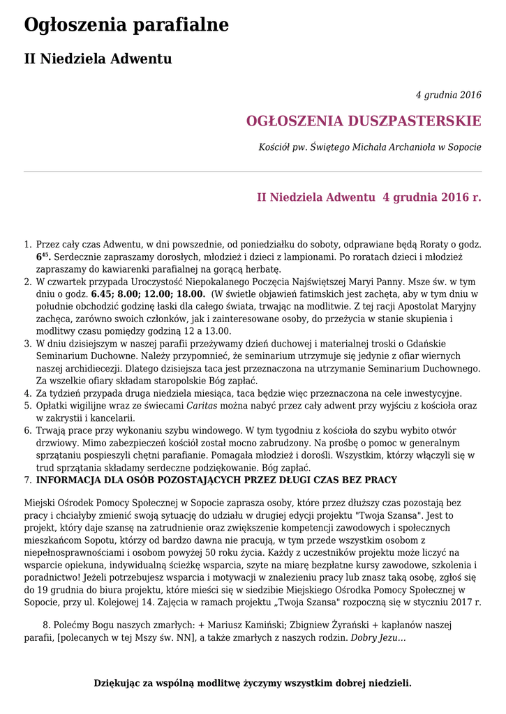 Ogłoszenia parafialne II Niedziela Adwentu 4 grudnia 2016 OGŁOSZENIA DUSZPASTERSKIE Kościół pw. Świętego Michała Archanioła w Sopocie II Niedziela Adwentu 4 grudnia 2016 r. 1. Przez cały czas Adwentu, w dni powszednie, od poniedziałku do soboty, odprawiane będą Roraty o godz. 645. Serdecznie zapraszamy dorosłych, młodzież i dzieci z lampionami. Po roratach dzieci i młodzież zapraszamy do kawiarenki parafialnej na gorącą herbatę. 2. W czwartek przypada Uroczystość Niepokalanego Poczęcia Najświętszej Maryi Panny. Msze św. w tym dniu o godz. 6.45; 8.00; 12.00; 18.00. (W świetle objawień fatimskich jest zachęta, aby w tym dniu w południe obchodzić godzinę łaski dla całego świata, trwając na modlitwie. Z tej racji Apostolat Maryjny zachęca, zarówno swoich członków, jak i zainteresowane osoby, do przeżycia w stanie skupienia i modlitwy czasu pomiędzy godziną 12 a 13.00. 3. W dniu dzisiejszym w naszej parafii przeżywamy dzień duchowej i materialnej troski o Gdańskie Seminarium Duchowne. Należy przypomnieć, że seminarium utrzymuje się jedynie z ofiar wiernych naszej archidiecezji. Dlatego dzisiejsza taca jest przeznaczona na utrzymanie Seminarium Duchownego. Za wszelkie ofiary składam staropolskie Bóg zapłać. 4. Za tydzień przypada druga niedziela miesiąca, taca będzie więc przeznaczona na cele inwestycyjne. 5. Opłatki wigilijne wraz ze świecami Caritas można nabyć przez cały adwent przy wyjściu z kościoła oraz w zakrystii i kancelarii. 6. Trwają prace przy wykonaniu szybu windowego. W tym tygodniu z kościoła do szybu wybito otwór drzwiowy. Mimo zabezpieczeń kościół został mocno zabrudzony. Na prośbę o pomoc w generalnym sprzątaniu pospieszyli chętni parafianie. Pomagała młodzież i dorośli. Wszystkim, którzy włączyli się w trud sprzątania składamy serdeczne podziękowanie. Bóg zapłać. 7. INFORMACJA DLA OSÓB POZOSTAJĄCYCH PRZEZ DŁUGI CZAS BEZ PRACY Miejski Ośrodek Pomocy Społecznej w Sopocie zaprasza osoby, które przez dłuższy czas pozostają bez pracy i chciałyby zmienić swoją sytuację do udziału w drugiej edycji projektu "Twoja Szansa". Jest to projekt, który daje szansę na zatrudnienie oraz zwiększenie kompetencji zawodowych i społecznych mieszkańcom Sopotu, którzy od bardzo dawna nie pracują, w tym przede wszystkim osobom z niepełnosprawnościami i osobom powyżej 50 roku życia. Każdy z uczestników projektu może liczyć na wsparcie opiekuna, indywidualną ścieżkę wsparcia, szyte na miarę bezpłatne kursy zawodowe, szkolenia i poradnictwo! Jeżeli potrzebujesz wsparcia i motywacji w znalezieniu pracy lub znasz taką osobę, zgłoś się do 19 grudnia do biura projektu, które mieści się w siedzibie Miejskiego Ośrodka Pomocy Społecznej w Sopocie, przy ul. Kolejowej 14. Zajęcia w ramach projektu „Twoja Szansa" rozpoczną się w styczniu 2017 r. 8. Polećmy Bogu naszych zmarłych: + Mariusz Kamiński; Zbigniew Żyrański + kapłanów naszej parafii, [polecanych w tej Mszy św. NN], a także zmarłych z naszych rodzin. Dobry Jezu… Dziękując za wspólną modlitwę życzymy wszystkim dobrej niedzieli. Przyjmijmy Boże błogosławieństwo.