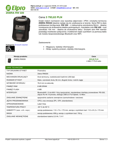 Elpro.com.pl: ul. Legionów 93/95, 91-072 Łódź www: www.elpro.com.pl e-mail: [email protected] tel: (42) 664-06-00 ZEBRA RW 220 Cena 3 793,63 PLN Dzięki małym rozmiarom oraz wysokiej odporności ( IP54 ) drukarka termiczna ZEBRA RW220 idealnie nadaje się do użytkowania w terenie. Seria RW to dwie podstawowe konfiguracje: RW 220 - z maksymalną szerokością 56mm - idealne rozwiązanie do drukowania biletów parkingowych, mandatów oraz RW 420 - czyli szerokość 104 mm - idealna do drukowania faktur. Drukarki serii RW również posiadają możliwości połączenia z kolektorem bądź czytnikiem za pomocą kabla lub modułu bezprzewodowego Bluetooth oraz WiFi. Zastosowanie Kategorie Drukarki etykiet - Magazyny: etykiety informacyjne - Sklep: systemy przecen, etykiety informacyjne. Wersja produktu Cena ZEBRA RW220 855,00 PLN 4 666,17 PLN netto DANE TECHNICZNE TYP DRUKARKI ETYKIET Przenośna NAZWA Zebra RW220 MECHANIZM DRUKUJĄCY Druk termiczny, rozdzielczość 8 pkt/mm (203 dpi) ROZMIAR ETYKIET Maks. szerokość druku 56 mm, długość druku: nośnik ciągły SZYBKOŚĆ WYDRUKU 76,2 mm na sekundę PAMIĘĆ RAM 8 MB SRAM PAMIĘĆ FLASH 4 MB INTERFEJSY Bluetooth® 1.2 lub 802.11b/g (opcjonalnie), standardowe interfejsy przewodowe: RS-232, złącze RJ-45 10-pinowe, obsługa USB 2.0 Full Speed, 12 Mb/s ZASILANIE ZEWNĘTRZNE opcjonalnie zasilanie zewnętrzne (samochodowe i sieciowe) JĘZYK PROGRAMOWANIA CPCL oraz emulacja ZPL i EPL (standardowo) OPROGRAMOWANIE Label Vista TEMPERATURA PRACY -20°C do 55°C GABARYTY (szer. x dł. x wys.) wersja podstawowa: 112 x 74 x 173 mm, wersja z czytnikiem kart: 112 x 81,2 x 173 mm WAGA wersja podstawowa: 658 g, wersja z czytnikiem kart: 703 g ZASILANIE WEWNĘTRZNE standardowo bateria 2,0 Ah, 7,4 V Projekt i wykonanie wydruku: Logisoft Powered by TCPDF (www.tcpdf.org) http://www.logisoft.pl/ +48 42 235 41 51 Strona 1 z 1