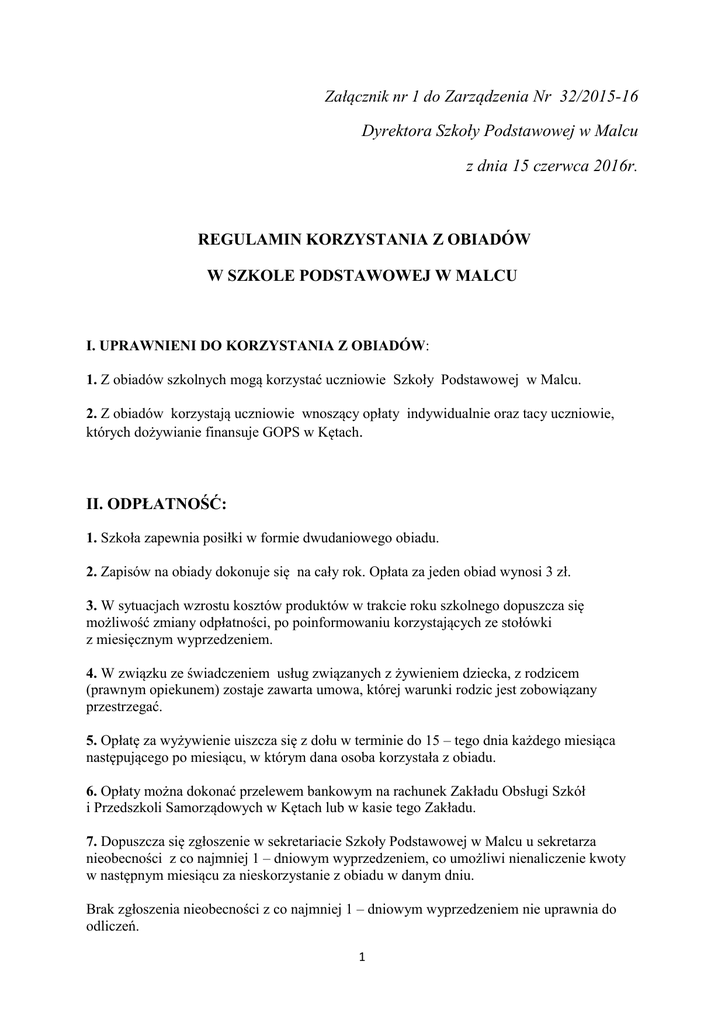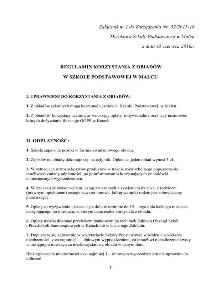 Załącznik nr 1 do Zarządzenia Nr 32/2015-16 Dyrektora Szkoły Podstawowej w Malcu z dnia 15 czerwca 2016r. REGULAMIN KORZYSTANIA Z OBIADÓW W SZKOLE PODSTAWOWEJ W MALCU I. UPRAWNIENI DO KORZYSTANIA Z OBIADÓW: 1. Z obiadów szkolnych mogą korzystać uczniowie Szkoły Podstawowej w Malcu. 2. Z obiadów korzystają uczniowie wnoszący opłaty indywidualnie oraz tacy uczniowie, których dożywianie finansuje GOPS w Kętach. II. ODPŁATNOŚĆ: 1. Szkoła zapewnia posiłki w formie dwudaniowego obiadu. 2. Zapisów na obiady dokonuje się na cały rok. Opłata za jeden obiad wynosi 3 zł. 3. W sytuacjach wzrostu kosztów produktów w trakcie roku szkolnego dopuszcza się możliwość zmiany odpłatności, po poinformowaniu korzystających ze stołówki z miesięcznym wyprzedzeniem. 4. W związku ze świadczeniem usług związanych z żywieniem dziecka, z rodzicem (prawnym opiekunem) zostaje zawarta umowa, której warunki rodzic jest zobowiązany przestrzegać. 5. Opłatę za wyżywienie uiszcza się z dołu w terminie do 15 – tego dnia każdego miesiąca następującego po miesiącu, w którym dana osoba korzystała z obiadu. 6. Opłaty można dokonać przelewem bankowym na rachunek Zakładu Obsługi Szkół i Przedszkoli Samorządowych w Kętach lub w kasie tego Zakładu. 7. Dopuszcza się zgłoszenie w sekretariacie Szkoły Podstawowej w Malcu u sekretarza nieobecności z co najmniej 1 – dniowym wyprzedzeniem, co umożliwi nienaliczenie kwoty w następnym miesiącu za nieskorzystanie z obiadu w danym dniu. Brak zgłoszenia nieobecności z co najmniej 1 – dniowym wyprzedzeniem nie uprawnia do odliczeń. 1 8. Istnieje możliwość zastępstwa koleżeńskiego podczas nieobecności uprawnionego do korzystania z obiadu. W takim przypadku przy odbiorze obiadu uczeń podaje nazwisko tego, który go upoważnił do obiadu oraz przyczynę jego nieobecności. III. ZASADY KORZYSTANIA Z OBIADU: 1. Obiad jest wydawany na przerwie od godz. 11.25 do 11.45 w sali nr 4 na parterze. 2. W tym czasie w sali mogą przebywać tylko uczniowie spożywający obiad. 3. Obiad jest spożywany tylko w w/w sali i zakazuje się wynoszenia posiłku lub jego części poza wyznaczoną salę. 4. Uczeń może spożywać obiad do dzwonka na lekcję – po nim jest zobowiązany opuścić salę i udać się na zajęcia lub do świetlicy. IV. ZASADY KWALIFIKOWANIA UCZNIÓW NA OBIADY: 1.Warunkiem korzystania przez ucznia z obiadów jest złożenie przez rodzica (opiekuna prawnego) „Deklaracji – obiady rok szkolny 201…/…” stanowiącej załącznik nr 1 do niniejszego regulaminu. 2. Deklarację należy złożyć w sekretariacie szkoły w terminie wskazanym przez dyrektora szkoły. 3. Pierwszeństwo w korzystaniu z obiadów mają ci uczniowie, których obiady są refundowane przez GOPS. Rodzice (opiekunowie prawni) tych uczniów nie składają w/w „Deklaracji…”. 4. W dalszej kolejności kwalifikowani do korzystania z obiadów są uczniowie: - korzystający ze świetlicy; - których rodzice dołączą do „Deklaracji…” pisemnie oświadczenie, że oboje pracują zawodowo. 5. W przypadku złożenia większej ilości wniosków niż porcji obiadowych wydawanych w szkole, decyduje data złożenia „Deklaracji” w sekretariacie szkoły. 6. O zakwalifikowaniu ucznia do korzystania z obiadów informuje telefonicznie sekretarz szkoły. V. ZASADY ZACHOWANIA PODCZAS SPOŻYWANIA OBIADU: 1. Podczas spożywania obiadu obowiązują zasady kulturalnego zachowania zarówno wobec pracowników jak i siebie nawzajem. 2 2. Obiad jest spożywany przy stoliku wskazanym przez nauczyciela. 3. Po spożyciu obiadu brudne naczynia należy odnieść w wyznaczone miejsce, posprzątać po sobie i zasunąć krzesło. 4. Nad bezpieczeństwem uczniów przebywających w stołówce czuwa dyżurujący nauczyciel. Traci ważność „Regulamin korzystania z obiadów w Szkole Podstawowej w Malcu” wydany w dniu 29 stycznia 2014r. ………………………………………….. (data, podpis dyrektora) 3