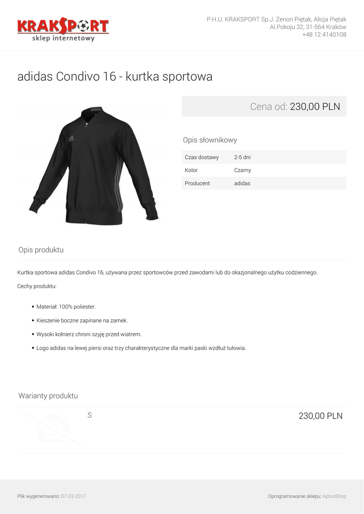 P.H.U. KRAKSPORT Sp.J. Zenon Piętak, Alicja Piętak Al.Pokoju 32, 31-564 Kraków +48 12 4140108 adidas Condivo 16 - kurtka sportowa Cena od: 230,00 PLN Opis słownikowy Czas dostawy 2-5 dni Kolor Czarny Producent adidas Opis produktu Kurtka sportowa adidas Condivo 16, używana przez sportowców przed zawodami lub do okazjonalnego użytku codziennego. Cechy produktu: Materiał: 100% poliester. Kieszenie boczne zapinane na zamek. Wysoki kołnierz chroni szyję przed wiatrem. Logo adidas na lewej piersi oraz trzy charakterystyczne dla marki paski wzdłuż tułowia. Warianty produktu S Plik wygenerowano: 07-03-2017 230,00 PLN Oprogramowanie sklepu: AptusShop P.H.U. KRAKSPORT Sp.J. Zenon Piętak, Alicja Piętak Al.Pokoju 32, 31-564 Kraków +48 12 4140108 M 230,00 PLN L 230,00 PLN XL 230,00 PLN Galeria Plik wygenerowano: 07-03-2017 Powered by TCPDF (www.tcpdf.org) Oprogramowanie sklepu: AptusShop