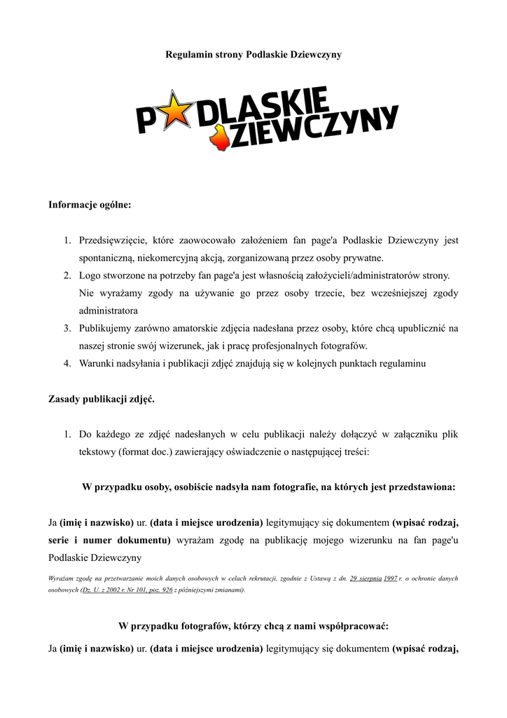 Regulamin strony Podlaskie Dziewczyny Informacje ogólne: 1. Przedsięwzięcie, które zaowocowało założeniem fan page'a Podlaskie Dziewczyny jest spontaniczną, niekomercyjną akcją, zorganizowaną przez osoby prywatne. 2. Logo stworzone na potrzeby fan page'a jest własnością założycieli/administratorów strony. Nie wyrażamy zgody na używanie go przez osoby trzecie, bez wcześniejszej zgody administratora 3. Publikujemy zarówno amatorskie zdjęcia nadesłana przez osoby, które chcą upublicznić na naszej stronie swój wizerunek, jak i pracę profesjonalnych fotografów. 4. Warunki nadsyłania i publikacji zdjęć znajdują się w kolejnych punktach regulaminu Zasady publikacji zdjęć. 1. Do każdego ze zdjęć nadesłanych w celu publikacji należy dołączyć w załączniku plik tekstowy (format doc.) zawierający oświadczenie o następującej treści: W przypadku osoby, osobiście nadsyła nam fotografie, na których jest przedstawiona: Ja (imię i nazwisko) ur. (data i miejsce urodzenia) legitymujący się dokumentem (wpisać rodzaj, serie i numer dokumentu) wyrażam zgodę na publikację mojego wizerunku na fan page'u Podlaskie Dziewczyny Wyrażam zgodę na przetwarzanie moich danych osobowych w celach rekrutacji, zgodnie z Ustawą z dn. 29 sierpnia 1997 r. o ochronie danych osobowych (Dz. U. z 2002 r. Nr 101, poz. 926 z późniejszymi zmianami). W przypadku fotografów, którzy chcą z nami współpracować: Ja (imię i nazwisko) ur. (data i miejsce urodzenia) legitymujący się dokumentem (wpisać rodzaj, serie i numer dokumentu) wyrażam zgodę na publikację zdjęć mojego autorstwa na fan page'u Podlaskie Dziewczyny. Jednocześnie informuję, że osoba, której wizerunek został uwieczniony została przeze mnie poinformowana o tym fakcie, oraz wyraziła zgodę na publikację swojego wizerunku. Wyrażam zgodę na przetwarzanie moich danych osobowych w celach rekrutacji, zgodnie z Ustawą z dn. 29 sierpnia 1997 r. o ochronie danych osobowych (Dz. U. z 2002 r. Nr 101, poz. 926 z późniejszymi zmianami). 2. Zdjęcia należy przesyłać na adres: <[email protected]> w formacie jpg. 3. Na zdjęciu powinna być widoczna twarz, oraz sylwetka modelki. 4. Nie publikujemy treści o charakterze erotycznym 5. Nie płacimy, oraz nie pobieramy opłat za udostępnianie zdjęć 6. Nie publikujemy zdjęć konkursowych (tylko w szczególnych przypadkach) 7. Zastrzegamy sobie prawo do odmowy publikacji zdjęć bez podania przyczyn 8. Admin Karol ma zawsze rację 9. Jeśli uważasz, że Admin Karol nie ma racji patrz punkt. 8 Komentarze: 1. Zastrzegamy sobie prawo do usuwania komentarzy bez podania przyczyny 2. Komentarze obraźliwe, będą natychmiast usuwane a ich użytkownicy z miejsca dostają bana 3. Znasz dziewczynę ze zdjęcia?? Fajnie, ale nie oznaczaj jej w poście