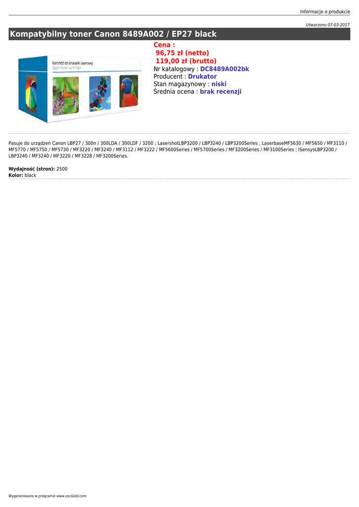 Informacje o produkcie Utworzono 07-03-2017 Kompatybilny toner Canon 8489A002 / EP27 black Cena : 96,75 zł (netto) 119,00 zł (brutto) Nr katalogowy : DC8489A002bk Producent : Drukator Stan magazynowy : niski Średnia ocena : brak recenzji Pasuje do urządzeń Canon LBP27 / 300n / 300LDA / 300LDF / 3200 ; LasershotLBP3200 / LBP3240 / LBP3200Series ; LaserbaseMF5630 / MF5650 / MF3110 / MF5770 / MF5750 / MF5730 / MF3220 / MF3240 / MF3112 / MF3222 / MF5600Series / MF5700Series / MF3200Series / MF3100Series ; ISensysLBP3200 / LBP3240 / MF3240 / MF3220 / MF3228 / MF3200Series. Wydajność (stron): 2500 Kolor: black Wygenerowano w programie www.oscGold.com
