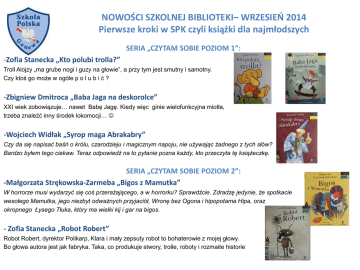NOWOŚCI SZKOLNEJ BIBLIOTEKI– WRZESIEŃ 2014 Pierwsze kroki w SPK czyli książki dla najmłodszych SERIA „CZYTAM SOBIE POZIOM 1”: -Zofia Stanecka „Kto polubi trolla?” Troll Alojzy „ma grube nogi i guzy na głowie”, a przy tym jest smutny i samotny. Czy ktoś go może w ogóle p o l u b i ć ? -Zbigniew Dmitroca „Baba Jaga na deskorolce” XXI wiek zobowiązuje… nawet Babę Jagę. Kiedy więc ginie wielofunkcyjna miotła, trzeba znaleźć inny środek lokomocji… -Wojciech Widłak „Syrop maga Abrakabry” Czy da się napisać baśń o królu, czarodzieju i magicznym napoju, nie używając żadnego z tych słów? Bardzo byłem tego ciekaw. Teraz odpowiedź na to pytanie pozna każdy, kto przeczyta tę książeczkę. SERIA „CZYTAM SOBIE POZIOM 2”: -Małgorzata Strękowska-Zarmeba „Bigos z Mamutka” W horrorze musi wydarzyć się coś przerażającego, a w horrorku? Sprawdźcie. Zdradzę jedynie, że spotkacie wesołego Mamutka, jego niezbyt odważnych przyjaciół, Wronę bez Ogona i hipopotama Hipa, oraz okropnego Łysego Tłuka, który ma wielki kij i gar na bigos. - Zofia Stanecka „Robot Robert” Robot Robert, dyrektor Polikarp, Klara i mały zepsuty robot to bohaterowie z mojej głowy. Bo głowa autora jest jak fabryka. Taka, co produkuje stwory, trolle, roboty i rozmaite historie SERIA „CZYTAM SOBIE POZIOM 3”: - Grzegorz Kasdepke „Kto zamawiał koszmarną przygodę?” Gdy byłem mały, chciałem przeżywać naprawdę straszne przygody, z których wychodziłbym bez szwanku, najchętniej przed podwieczorkiem. Straszne przygody powinny być bezpieczne. Żałowałem, że nikt nie wymyślił firmy, która by to zapewniała. Ludzie dzwoniliby i zamawiali okropne Przygody - a taka firma dostarczałaby je pod drzwi. W każdej chwili można by przygodę przerwać. „A może ja założę taką firmę?” - pomyślałem. I oto jej pierwsze dzieło! ALFABET WIERSZEM - Urszula Kozłowska „Litery” Oto niezwykły alfabet obrazkowy, dzięki któremu dzieci poznają kształt każdej litery. Proste i zabawne ilustracje przedstawiają zwierzę, roślinę albo rzecz, których nazwa rozpoczyna się na daną literę. Dodatkowo element pokazany na obrazku układa się w kształt litery. Dzięki temu dziecko kojarzy obrazek z literą i zapamiętuje jej formę. Wesołe wierszyki towarzyszące ilustracjom zachęcają dzieci do częstego oglądania książki. Alfabet obrazkowy to najlepsza metoda na rozpoczęcie przygody z poznawaniem liter! (tekst z opisu wydawcy)