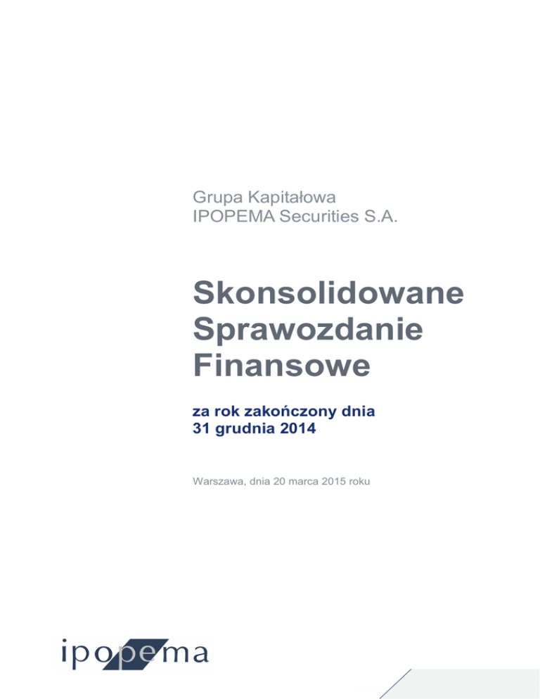 Grupa Kapitałowa IPOPEMA Securities S.A. Skonsolidowane Sprawozdanie Finansowe za rok zakończony dnia 31 grudnia 2014 Warszawa, dnia 20 marca 2015 roku Skonsolidowane sprawozdanie finansowe Grupy IPOPEMA Securities S.A. za rok 2014 SPIS TREŚCI Oświadczenie o zgodności ........................................................................................................................................................... 4 Wybrane dane finansowe ............................................................................................................................................................. 5 Skonsolidowane sprawozdanie z całkowitych dochodów............................................................................................................. 6 Skonsolidowane sprawozdanie z sytuacji finansowej ................................................................................................................... 7 Skonsolidowane sprawozdanie z przepływów pieniężnych .......................................................................................................... 8 Skonsolidowane sprawozdanie ze zmian w kapitale własnym ................................................................................................... 10 Dodatkowe noty objaśniające ..................................................................................................................................................... 11 1. Informacje o Grupie Kapitałowej IPOPEMA Securities S.A. .................................................................................... 11 2. Skład Grupy ........................................................................................................................................................... 12 3. Podstawa sporządzenia skonsolidowanego sprawozdania finansowego ................................................................ 14 3.1. Założenie kontynuacji działalności ......................................................................................................... 14 3.2. Identyfikacja sprawozdania ................................................................................................................... 14 3.3. Oświadczenie o zgodności .................................................................................................................... 14 3.4. Waluta pomiaru i waluta sprawozdań finansowych ................................................................................ 14 3.5. Porównywalność danych ....................................................................................................................... 14 4. Istotne zasady (polityka) rachunkowości ................................................................................................................ 15 5. Nowe standardy i interpretacje, które zostały opublikowane, a nie weszły jeszcze w życie ..................................... 15 6. Standardy przyjęte przez Radę Międzynarodowych Standardów Rachunkowości, ale jeszcze niezatwierdzone przez Unię Europejską ........................................................................................................................................... 16 7. Istotne wartości oparte na profesjonalnym osądzie i szacunkach ........................................................................... 16 4.1. Zmiany zasad rachunkowości wynikłe ze zmiany w MSSF .................................................................... 15 7.1. Profesjonalny osąd ................................................................................................................................ 16 7.2. Niepewność szacunków ........................................................................................................................ 17 8. Zmiana szacunków ................................................................................................................................................ 17 9. Istotne zasady rachunkowości ................................................................................................................................ 17 9.1. Zasady konsolidacji ............................................................................................................................... 17 9.2. Korekta błędu ........................................................................................................................................ 17 9.3. Przeliczanie pozycji wyrażonych w walucie obcej .................................................................................. 17 9.4. Rzeczowe aktywa trwałe ....................................................................................................................... 18 9.5. Wartości niematerialne .......................................................................................................................... 19 9.6. Instrumenty finansowe .......................................................................................................................... 19 9.7. Należności ............................................................................................................................................ 21 9.8. Utrata wartości ...................................................................................................................................... 22 9.9. Środki pieniężne i inne aktywa pieniężne .............................................................................................. 23 9.10. Kapitał własny ....................................................................................................................................... 23 9.11. Zobowiązania ....................................................................................................................................... 23 9.12. Rezerwy i rozliczenia międzyokresowe ...........................................................................................