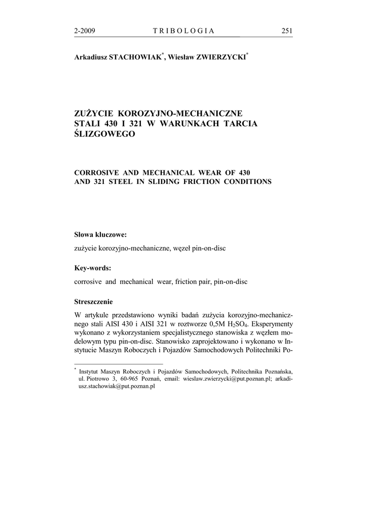 2-2009 TRIBOLOGIA 251 Arkadiusz STACHOWIAK*, Wiesław ZWIERZYCKI* ZUŻYCIE KOROZYJNO-MECHANICZNE STALI 430 I 321 W WARUNKACH TARCIA ŚLIZGOWEGO CORROSIVE AND MECHANICAL WEAR OF 430 AND 321 STEEL IN SLIDING FRICTION CONDITIONS Słowa kluczowe: zużycie korozyjno-mechaniczne, węzeł pin-on-disc Key-words: corrosive and mechanical wear, friction pair, pin-on-disc Streszczenie W artykule przedstawiono wyniki badań zużycia korozyjno-mechanicznego stali AISI 430 i AISI 321 w roztworze 0,5M H2SO4. Eksperymenty wykonano z wykorzystaniem specjalistycznego stanowiska z węzłem modelowym typu pin-on-disc. Stanowisko zaprojektowano i wykonano w Instytucie Maszyn Roboczych i Pojazdów Samochodowych Politechniki Po* Instytut Maszyn Roboczych i Pojazdów Samochodowych, Politechnika Poznańska, ul. Piotrowo 3, 60-965 Poznań, email: [email protected]; [email protected] 252 TRIBOLOGIA 2-2009 znańskiej. W artykule zaprezentowano cząstkowe wyniki badań. Wybrane rezultaty umożliwiają identyfikację zależności między czynnikami wymuszającymi i szybkością zużywania korozyjno-mechanicznego. Dodatkowo wyniki badań posłużyły również do weryfikacji zastosowanej metody badawczej oraz opracowanego wcześniej modelu obliczeniowego. MODEL OBLICZENIOWY PROCESU ZUŻYWANIA KOROZYJNO-MECHANICZNEGO Zużywanie korozyjno-mechaniczne to proces, w którym ubytek materiału jest wynikiem równoczesnych oddziaływań mechanicznych i elektrochemicznych. W przypadku, kiedy znajdujący się w stanie pasywnym materiał ulega zużyciu tarciowemu w środowisku agresywnym, całkowity ubytek materiału różni się od wartości otrzymanej przez zsumowanie zużycia tarciowego zmierzonego w warunkach bez udziału korozji i zużycia korozyjnego obserwowanego przy braku tarcia. Tego rodzaju proces zużywania może stanowić istotny problem eksploatacyjny w węzłach tarciowych maszyn przemysłu chemicznego, naftowego, spożywczego [L. 1, 2]. Autorzy artykułu przyjęli następujący model interpretacyjny zużywania korozyjno-mechanicznego [L. 3, 4]. W czasie, gdy elementy węzła pozostają w spoczynku ich powierzchnia może pokrywać się warstwą pasywnych tlenków. Z chwilą rozpoczęcia ruchu, wskutek względnych przemieszczeń, następuje usuwanie produktów korozji i odsłanianie fizycznie czystej powierzchni metalu. Następnie w obszarze rzeczywistego styku zachodzi odkształcenie powierzchni prowadzące do usunięcia fragmentu materiału podłoża. Na świeżo odsłoniętej powierzchni rozpoczynają się procesy elektrochemiczne. Następuje utlenianie materiału podłoża prowadzące do utworzenia nowej warstwy pasywnych tlenków. Na podstawie zaprezentowanej koncepcji opracowano program komputerowy, który pozwala prognozować ubytek materiału spowodowany jednoczesnymi oddziaływaniami mechanicznymi i korozyjnymi. Program prognozuje zużycie powierzchni próbki w skojarzeniu typu pin-on-disc [L. 3, 4]. STANOWISKO BADAWCZE Eksperyment symulujący zużycie korozyjno-mechaniczne wykonano na stanowisku zaprojektowanym i wykonanym w Instytucie Maszyn Robo- 2-2009 TRIBOLOGIA 253 czych i Pojazdów Samochodowych Politechniki Poznańskiej. W projekcie wykorzystano koncepcję przedstawioną w pracy [L. 5]. Węzeł modelowy stanowi twardy, nieodkształcalny trzpień, który ślizga się ruchem posuwisto-zwrotnym po powierzchni próbki wykonanej ze stali wykazującej skłonność do pasywacji (Rysunek 1). Współpraca obu elementów pary ślizgowej odbywa się w środowisku elektrolitycznym. Do badań wykorzystano: – trzpień wykonany z węglika spiekanego; zakończenie trzpienia ma kształt ściętego stożka o kącie wierzchołkowym 40o; średnica płaskiego końca wynosi około 0,5 mm; średnia chropowatość tej powierzchni kształtuje się na poziomie Ra = 0,32 µm, – próbki w kształcie dysku o średnicy 10 mm i grubości 5 mm; średnia chropowatość powierzchni czołowej próbki kształtuje się na poziomie Ra = 1,1 µm. Rys. 1. Węzeł tarciowy z układem elektrod do pomiarów elektrochemicznych: 1 –komora badawcza, 2 – elektroda badana, 3 – elektroda pomocnicza, 4 – elektroda odniesienia, 5 – dodatkowe naczynko elektrody odniesienia, 6 – klucz elektrolityczny, 7 – trzpień, 8 – tulejka mocowania trzpienia Fig. 1. The friction pair with the system of electrodes for electro-chemical measurements: 1 – test chamber, 2 – working electrode, 3 – counter electrode, 4 – reference electrode, 5 – additional cell of reference electrode, 6 – electrolytic key, 7 – plunger, 8 – plunger fastening bush W celu przeprowadzania badań procesu zużywania korozyjno-mechanicznego w środowiskach elektrolitycznych wykonano komorę 254 TRIBOLOGIA 2-2009 z uchwytem dla próbki. W układzie stanowiska komora podtrzymywana jest przez statyw wyposażony w czujniki tensometryczne przeznaczone do pomiaru siły normalnej i siły tarcia w miejscu styku trzpienia z próbką. Ruch posuwisto zwrotny trzpienia uzyskiwany jest za pomocą mechanizmu mimośrodowego. Zastosowane rozwiązanie umożliwia przemieszczania trzpienia z częstotliwością 1–10 Hz. Do monitorowania zjawisk elektrochemicznych wykorzystano układ trójelektrodowy z precyzyjnym czterokanałowym potencjostatem ATLAS 9833 (Rysunek 1). Jako elektrodę odniesienia wykorzystano elektrodę kalomelową. Funkcję elektrody pomocniczej pełni siatka platynowa o wymiarach 20 × 140 mm. METODA BADAŃ Przeprowadzone badania miały na celu: – weryfikację zastosowanej metody badań poprzez porównanie wyników własnych eksperymentów z danymi literaturowymi [L. 5], – identyfikację zależności między czynnikami wymuszającymi i szybkością zużywania korozyjno-mechanicznego, – weryfikację modelu obliczeniowego poprzez porównanie wyników badań i obliczeń. Eksperymenty przeprowadzono dla stali AISI 430 (16-18% Cr, 0,08% C) oraz AISI 321 (17-19% Cr, 9-12% Ni, 0,4-0,7% Ti, 0,08% C). Stal AISI 430 wybrano z uwagi na możliwość porównania w