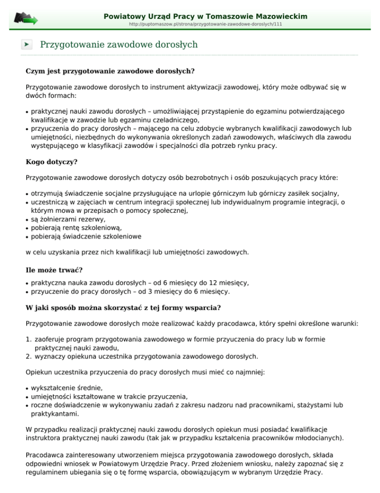 Powiatowy Urząd Pracy w Tomaszowie Mazowieckim http://puptomaszow.pl/strona/przygotowanie-zawodowe-doroslych/111 Przygotowanie zawodowe dorosłych Czym jest przygotowanie zawodowe dorosłych? Przygotowanie zawodowe dorosłych to instrument aktywizacji zawodowej, który może odbywać się w dwóch formach: ● ● praktycznej nauki zawodu dorosłych – umożliwiającej przystąpienie do egzaminu potwierdzającego kwalifikacje w zawodzie lub egzaminu czeladniczego, przyuczenia do pracy dorosłych – mającego na celu zdobycie wybranych kwalifikacji zawodowych lub umiejętności, niezbędnych do wykonywania określonych zadań zawodowych, właściwych dla zawodu występującego w klasyfikacji zawodów i specjalności dla potrzeb rynku pracy. Kogo dotyczy? Przygotowanie zawodowe dorosłych dotyczy osób bezrobotnych i osób poszukujących pracy które: ● ● ● ● ● otrzymują świadczenie socjalne przysługujące na urlopie górniczym lub górniczy zasiłek socjalny, uczestniczą w zajęciach w centrum integracji społecznej lub indywidualnym programie integracji, o którym mowa w przepisach o pomocy społecznej, są żołnierzami rezerwy, pobierają rentę szkoleniową, pobierają świadczenie szkoleniowe w celu uzyskania przez nich kwalifikacji lub umiejętności zawodowych. Ile może trwać? ● ● praktyczna nauka zawodu dorosłych – od 6 miesięcy do 12 miesięcy, przyuczenie do pracy dorosłych – od 3 miesięcy do 6 miesięcy. W jaki sposób można skorzystać z tej formy wsparcia? Przygotowanie zawodowe dorosłych może realizować każdy pracodawca, który spełni określone warunki: 1. zaoferuje program przygotowania zawodowego w formie przyuczenia do pracy lub w formie praktycznej nauki zawodu, 2. wyznaczy opiekuna uczestnika przygotowania zawodowego dorosłych. Opiekun uczestnika przyuczenia do pracy dorosłych musi mieć co najmniej: ● ● ● wykształcenie średnie, umiejętności kształtowane w trakcie przyuczenia, roczne doświadczenie w wykonywaniu zadań z zakresu nadzoru nad pracownikami, stażystami lub praktykantami. W przypadku realizacji praktycznej nauki zawodu dorosłych opiekun musi posiadać kwalifikacje instruktora praktycznej nauki zawodu (tak jak w przypadku kształcenia pracowników młodocianych). Pracodawca zainteresowany utworzeniem miejsca przygotowania zawodowego dorosłych, składa odpowiedni wniosek w Powiatowym Urzędzie Pracy. Przed złożeniem wniosku, należy zapoznać się z regulaminem ubiegania się o tę formę wsparcia, obowiązującym w wybranym Urzędzie Pracy. W przypadku pozytywnego rozpatrzenia wniosku przez Powiatowy Urząd Pracy, następuje podpisanie umowy w sprawie realizacji przygotowania zawodowego dorosłych zawieranej między starostą a pracodawcą lub między starostą, pracodawcą i instytucją szkoleniową, wpisaną do rejestru prowadzonego przez wojewódzki urząd pracy w której zawarte będą informacje dotyczące programu, według którego będzie realizowane przygotowanie zawodowe dorosłych. Jakich korzyści dostarcza? Pracodawca może otrzymać refundację wydatków poniesionych na każdego uczestnika w wysokości określonej w umowie, maksymalnie do wysokości 2% przeciętnego wynagrodzenia za każdy pełny miesiąc realizacji programu, głównie na: ● ● ● ● materiały i surowce, eksploatację maszyn i urządzeń, odzież roboczą, posiłki regeneracyjne i inne środki niezbędne do realizacji programu przygotowania zawodowego dorosłych. Na podstawie zawartej umowy, Pracodawcy przysługuje jednorazowa premia za każdy pełny miesiąc przygotowania zawodowego dorosłych każdego uczestnika, jeżeli ukończy program pomyślnie zdanym egzaminem. Podstawa prawna ● ● ustawa z dnia 20 kwietnia 2004 roku o promocji zatrudnienia i instytucjach rynku pracy (Dz. U. z 2015 r. poz. 149) – art. 53a – h rozporządzenie Ministra Pracy i Polityki Społecznej z dnia z dnia 11 kwietnia 2014 r. w sprawie przygotowania zawodowego dorosłych (Dz. U. poz. 497)