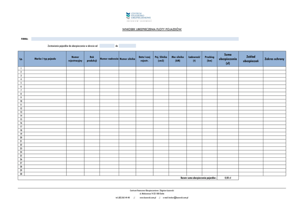 WNIOSEK UBEZPIECZENIA FLOTY POJAZDÓW FIRMA: Zestawienie pojazdów do ubezpieczenia w okresie od Lp. Marka i typ pojazdu Numer rejestracyjny Rok produkcji do Numer nadwozia Numer silnika Data I-szej rejestr. Poj. Silnika (cm3) Moc silnika (kM) Ładowność (t) Przebieg (km) Suma ubezpieczenia (zł) 1 2 3 4 5 6 7 8 9 10 11 12 13 14 15 16 17 18 19 20 21 22 23 24 25 26 27 28 29 30 Razem suma ubezpieczenia pojazdów : Centrum Finansowo-Ubezpieczeniowe Zbigniew Łazowski ul. Mickiewicza 14 22-100 Chełm tel. (82) 565-44-40 // www.lazowski.com.pl // e-mail: [email protected] 0,00 zł Zakład ubezpieczeń Zakres ochrony