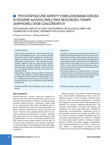 PSYCHOSPOŁECZNE ASPEKTY FUNKCJONOWANIA DZIECKA W RODZINIE ALKOHOLOWEJ ORAZ MOŻLIWOŚCI TERAPII ODWYKOWEJ OSÓB UZALEŻNIONYCH PSYCHOSOCIAL ASPECTS OF CHILD FUNCTIONING IN THE ALCOHOLIC FAMILY AND POSSIBILITIES OF ALCOHOL TREATMENT FOR ALCOHOL ADDICTS Grzegorz Konieczny1, Renata Rasińska2 1 Zakład Pedagogiki Akademia Wychowania Fizycznego im. Eugeniusza Piaseckiego w Poznaniu 2 Zakład Organizacji i Zarządzania w Opiece Zdrowotnej Uniwersytet Medyczny im. Karola Marcinkowskiego w Poznaniu STRESZCZENIE ABSTRACT Problem choroby alkoholowej coraz silniej dotyka współczesnej rodziny, która doświadcza kryzysu. Jest on wynikiem niezwykle dynamicznych zmian nie zawsze pożądanych i korzystnie wpływających na strukturę rodziny. Alkoholizm był i jest zjawiskiem niepożądanym, stanowi przejaw i formę niedostosowania społecznego. Negatywne skutki tego zjawiska przede wszystkim odczuwają dzieci, dla których środowisko rodzinne stanowić powinno początek egzystencji społecznej, poprzez którą styka się z rzeczywistością społeczną i wchodzi w nią właśnie przez wspólnotę rodzinną. Podsumowując rozważania dotyczące problemu alkoholowego w rodzinie, należy stwierdzić, że choroba alkoholowa destrukcyjnie oddziałuje na rodzinę. Odciska ona wyraźne piętno nie tylko na uzależnionej od alkoholu osobie, ale też jej bliskich oraz wszystkich obszarach życia i funkcjonowania rodziny dotkniętej tym problemem. The problem of alcoholism stronger and stronger afflicts the contemporary family that experiences the crisis. It is the result of unusually dynamic changes, not always desired and influencing the family structure in a negative way. Alcoholism has always been an undesirable phenomenon, expressing the social maladjustment. Adverse effects of this disease are, first of all, experienced by children for whom home should be the beginning of social existence, through which they encounter the social reality and which they enter by means of the family. Summarizing reflections on the alcoholic problem in the family, a destructive influence of alcoholism on the family should be stated. It leaves a clear imprint on not only the alcohol addict and his/ her relatives, but all walks of life affected by this problem. SŁOWA KLUCZOWE: choroba alkoholowa, rodzina, terapia odwykowa. KEYWORDS: alcoholism, family, alcohol treatment. Wprowadzenie Środki chemiczne – używki – stały się w ostatnich latach dla wielu ludzi nieomal sposobem na życie. Za ich pomocą człowiek walczy ze stresem, próbuje podnosić poczucie własnej wartości i sprawstwa, często sięga po nie, aby poprawić sobie nastrój. Szczególną rolę odgrywa tu alkohol, który poprzez swoje właściwości „iluzyjne” dostarcza złudzenia siły, mocy czy kontroli nad innymi. Pomimo wielu podejmowanych prób nie znaleziono dotychczas odpowiedzi na pytanie, dlaczego jedni ludzie piją mniej, inni więcej, dlaczego jedni stają się alkoholikami, a inni nie, chociaż piją w podobny sposób. Jednak wszyscy badacze zgodni są co do tego, że rozwój choroby alkoholowej, jako zjawisko niepożądane, stanowi przejaw i formę niedostosowania społecznego i zależne jest od splotu wielu czynników natury bio-psycho-społecznej. 98 PIELĘGNIARSTWO POLSKIE NR 1 (59) 2016 Należy zauważyć, że problem choroby alkoholowej coraz silniej dotyka współczesnej rodziny, która doświadcza kryzysu. Jest on wynikiem niezwykle dynamicznych zmian nie zawsze pożądanych i korzystnie wpływających na strukturę rodziny. Siłą napędową tych konwersji są procesy społeczno-ekonomiczne oraz kulturowe zachodzące w wymiarze tak lokalnym, jak i globalnym (np. zanik więzi rodzinnych i sąsiedzkich, powszechny konsumpcjonizm, akceleracja życia czy anonimowość). Dotyczą one przede wszystkim struktury rodziny, hierarchii, porządku aksjologicznego, roli i znaczenia poszczególnych jej członków, a szczególnie funkcji, jakie spełni rodzina w obecnym stadium ewolucji. Niektóre jej funkcje ulegają przeobrażeniu, inne zostają ograniczone do minimum, a wręcz zanikają. Jednym z niepokojących wymiarów przemian w rodzinie jest wzrost filozofii antypedagogicznej, która PRACA POGLĄDOWA otwiera przestrzeń do samostanowienia oraz znaczącej autonomii jej członków, jak też indywidualności, która często przeradza się w egoizm i interes osobisty. Socjologiczne analizy wskazują, iż powyższe zmiany prowadzą do osłabienia wzajemnych relacji rodzinnych, więzi uczuciowych i emocjonalnych. Taki stan rzeczy, jak wykazują badania literaturowe, m.in. pogłębia już istniejący kryzys rodziny. Wszystko to sprzyja m.in. rozwojowi choroby alkoholowej, niszcząc nie tylko uzależnionego, ale też jego bliskich oraz wszystkie obszary ich życia i funkcjonowania. Alkoholizm był i jest zjawiskiem niepożądanym, stanowi przejaw i formę niedostosowania społecznego. Zjawisko to w szczególności w sposób niezmiernie destrukcyjny wpływa na rodzinę, odciskając piętno na wszystkich jej członkach oraz każdej z rudymentarnych funkcji rodziny. Negatywne skutki tego zjawiska przede wszystkim odczuwają dzieci, dla których środowisko rodzinne stanowić powinno początek egzystencji społecznej, poprzez którą styka się z rzeczywistością społeczną i wchodzi w nią właśnie przez wspólnotę rodzinną. W rodzinie młody człowiek kształtuje swoje potrzeby, prospołeczne postawy i zachowania oraz wyrabia pożądane umiejętności i nawyki [1]. Ponadto dziecko potrzebuje dowodów uczucia miłości ze strony odpowiedzialnych rodziców, przejawów doceniania go i uznania. Bez tego nie ma ono żadnej pewności, że jest dobre, potrzebne, kochane i chciane. Dziecko musi mieć poczucie, że jest akceptowane jako jednostka, której cały indeks cech jest uznawany, która ma możność działania i prawo do osobistych doświadczeń. Analiza literatury Jak wynika z analizy literaturowej, stosunkowo duży odsetek dzieci i młodzi