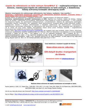 Łopata do odśnieżania na kole nośnym SnowWOLF ® - najbezpieczniejsza na świecie, rewolucyjna łopata do odśnieżania na kole nośnym, z dodatkową listwą ochronną krawędzi zbierającej szufli Idealne rozwiązanie do codziennego odśnieżania, bez hałasu, wydajnie i bez wysiłku ! Najlepsze i najbardziej bezpieczne narzędzie do odśnieżania płaskich dachów, zrzucamy śnieg z dachu będąc min 1,5 m od krawędzi dachu…..!!!! Produkt lepszy niż odśnieżarka z napędem silnikowym i bezpieczniejszy niż klasyczna łopata ! Genialny, opatentowany produkt wytwarzany w USA. Spełnia trzy funkcje; łopaty do śniegu, małego pługu do śniegu i odśnieżarki wy rzucającej. Odśnieżanie naszą łopatą to czysta przyjemność – 3 razy szybciej niż klasyczną łopatą. Do zastosowań profesjonalnych i prz ydomowych. Idealny do odśnieżania parkingów, podjazdów, placów, chodników, ulic, deptaków, stacji benzynowych, wszędzie gdzie trzeba odśnieżać szybko i ekologicznie. Koniec z drogimi odśnieżarkami z napędem spalinowym lub elektrycznym. Innowacyjna, opatentowana technologia powoduje, że odśnieżanie jest dziecinnie proste. Nasz kręgosłup jest obciążany o 75 % mniej niż przy pracy łopatą, oszczędzamy nasze serce przez mniejszy wysiłek – ergonomiczna konstrukcja jest wyjątkowo przyjazna dla użytkownika. Zobacz filmy http://www.youtube.com/watch?v=Qzd5i9AUsRc jak wydajny jest nasz produkt. Kolor czarny, kolorowe, atrakcyjne opakowanie, pudełko wysyłkowe 86,4 cm x 19,0 cm x 49,5 cm, kierownica z rury stalowej o śr. 2,2 cm malowana proszkowo o wadze 0,9 kg, rama – rura stalowa o śr. 3,2 cm malowana proszkowo, koło o średnicy 86 cm – z copolymeru/polipropylenu waga 1, 9 kg, ogumienie bezdętkowe waga 0,8 kg, szufla zbierająca z copolymeru/polipropylenu ze stalowym elementem zbierającym - waga 1,1 kg , szerokość szufli 66 cm, oś i części metalowe – ze stali waga 0,4 kg, waga razem 8,6 kg, długość razem ok. 183,1 cm. Do montażu potrzebny tylko jeden klucz 11 mm ! Cena detaliczna z kosztami wysyłki do klienta; Nowa niższa cena na całą zimę.. 320 złotych brutto z transportem do klienta Zamówienia mailem na [email protected] . Stalowa listwa ochronna do łopaty montowana na krawędzi w cenie. Numer patentu w USA; U.S. Patent Nos. 7,669,404; 7,631,443; 7,111,418; 7,681,336; D568,122; EU Patent Nos. 000729942-0001, 000729942-0002; and other U.S. and Foreign Patents Pending Link do you tube jak pracuje nasz Snowwolf: http://www.youtube.com/watch?v=Qzd5i9AUsRc Kup na Allegro http://allegro.pl/lopata-do-sniegu-na-kole-snowwolf-patent-z-usa-i6615405341.html Wyłączny Importer w Polsce: INPRODUCTS, ul. Rzemieślnicza 8, 24-300 Opole Lubelskie Tel: +48 509 506 544, + 48 691 090 413, Fax: +48 81 8274141 NIP: 717-10-03-078 e-mail: [email protected] www.inproducts.pl