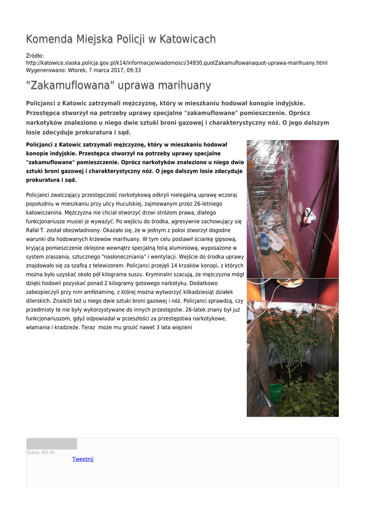 Komenda Miejska Policji w Katowicach Źródło: http://katowice.slaska.policja.gov.pl/k14/informacje/wiadomosci/34930,quotZakamuflowanaquot-uprawa-marihuany.html Wygenerowano: Wtorek, 7 marca 2017, 09:33 "Zakamuflowana" uprawa marihuany Policjanci z Katowic zatrzymali mężczyznę, który w mieszkaniu hodował konopie indyjskie. Przestępca stworzył na potrzeby uprawy specjalne "zakamuflowane" pomieszczenie. Oprócz narkotyków znaleziono u niego dwie sztuki broni gazowej i charakterystyczny nóż. O jego dalszym losie zdecyduje prokuratura i sąd. Policjanci z Katowic zatrzymali mężczyznę, który w mieszkaniu hodował konopie indyjskie. Przestępca stworzył na potrzeby uprawy specjalne "zakamuflowane" pomieszczenie. Oprócz narkotyków znaleziono u niego dwie sztuki broni gazowej i charakterystyczny nóż. O jego dalszym losie zdecyduje prokuratura i sąd. Policjanci zwalczający przestępczość narkotykową odkryli nielegalną uprawę wczoraj popołudniu w mieszkaniu przy ulicy Huculskiej, zajmowanym przez 26-letniego katowiczanina. Mężczyzna nie chciał otworzyć drzwi stróżom prawa, dlatego funkcjonariusze musiei je wyważyć. Po wejściu do środka, agresywnie zachowujący się Rafał T. został obezwładniony. Okazało się, że w jednym z pokoi stworzył dogodne warunki dla hodowanych krzewów marihuany. W tym celu postawił ściankę gipsową, kryjącą pomieszczenie oklejone wewnątrz specjalną folią aluminiową, wyposażone w system zraszania, sztucznego "nasłoneczniania" i wentylacji. Wejście do środka uprawy znajdowało się za szafką z telewizorem. Policjanci przejęli 14 krzaków konopi, z których można było uzyskać około pół kilograma suszu. Kryminalni szacują, że mężczyzna mógł dzięki hodowli pozyskać ponad 2 kilogramy gotowego narkotyku. Dodatkowo zabezpieczyli przy nim amfetaminę, z której można wytworzyć kilkadziesiąt działek dilerskich. Znaleźli też u niego dwie sztuki broni gazowej i nóż. Policjanci sprawdzą, czy przedmioty te nie były wykorzystywane do innych przestępstw. 26-latek znany był już funkcjonariuszom, gdyż odpowiadał w przeszłości za przestępstwa narkotykowe, włamania i kradzieże. Teraz może mu grozić nawet 3 lata więzieni Ocena: 0/5 (0) Tweetnij