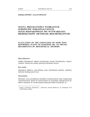 6-2014 TRIBOLOGIA 151 Elżbieta SIWIEC*, Ewa PAWELEC* OCENA PRZYDATNOŚCI WYBRANYCH SUROWCÓW PORAFINACYJNYCH OLEJU RZEPAKOWEGO DO WYTWARZANIA BIODODATKÓW METODAMI BIOCHEMICZNYMI EVALUATION OF THE USEFULNESS OF SOME POST REFORMING WASTE OF RAPESEED OIL TO OBTAIN BIOADDITIVES BY BIOCHEMICAL METHODS Słowa kluczowe: dodatki tribologiczne, odpady porafinacyjne, metody biochemiczne, rozpuszczalność, właściwości smarne, graniczne obciążenie zużycia Key words: tribological additives, post-refining waste, biochemical methods, solubility, lubricity, limiting load of wear Streszczenie: Dokonano oceny przydatności produktów porafinacyjnych oleju rzepakowego i biochemicznych metod ich przetwarzania do otrzymania ekologicznych dodatków smarnych. W wyniku przeprowadzonych badań stwierdzono, że: * Instytut Technologii Eksploatacji – Państwowy Instytut Badawczy, ul. Pułaskiego 6/10, 26-600 Radom, Polska. 152 TRIBOLOGIA 6-2014 • w syntetycznym oleju estrowym PRIOLUBE żaden z otrzymanych produk- tów nie wykazywał wystarczającej efektywności smarnej, • w szlamach pohydratacyjnych z powodu dużej zawartości wody (sprzyja rozwojowi mikroorganizmów) następowało skażenie mikrobiologiczne nawet podczas przechowywania w warunkach chłodniczych, • produkty otrzymane metodami biochemicznymi z tłuszczu kanałowego nie wykazywały wystarczającej efektywności smarnej, • produkty otrzymane w wyniku oddziaływania na surowce porafinacyjne oleju rzepakowego szczepami pleśni Mucor racemosus TB75231W nie wykazywały wystarczającej efektywności smarnej. WPROWADZENIE Podstawowymi składnikami środków smarowych są: olej bazowy i dodatki uszlachetniające [L. 1–4]. Ze względu na zawartość 75–99% oleju bazowego w materiałach smarowych to on głównie decyduje o biodegradowalności środka smarowego. Pozostała część to dodatki uszlachetniające, często zawierające szkodliwe dla środowiska pochodne chloru, fosforu i metali ciężkich, dlatego w celu poprawy walorów ekologicznych olejów smarowych dąży się do minimalizacji ich zawartości w kompozycji smarowej, a także poszukuje się nowych, bezpopiołowych, nietoksycznych i biorozkładalnych substancji mogących zastąpić dotychczas stosowane dodatki uszlachetniające. Od dodatków nowej generacji wymaga się, aby poprawiały podstawowe właściwości oleju bazowego, nie zwiększając emisji zanieczyszczeń do środowiska. Ponadto wymaga się, aby nie zawierały one składników niepożądanych dla środka smarowego (np. związków siarki, chloru). Kryteriom takim odpowiadają związki zawierające aktywne grupy funkcyjne: estrową, hydroksylową, karboksylową i in. Najczęściej są to estry wyższych kwasów karboksylowych (często z alkoholami wielowodorotlenowymi) lub kwasy hydroksykarboksylowe. Potencjalnymi dodatkami tego typu, zbudowanymi wyłącznie ze składników przyjaznych ekologicznie (węgiel, tlen, wodór), mogą być produkty pozyskane z surowców porafinacyjnych olejów roślinnych. Oleje roślinne, obok triglicerydów, zawierają ok. 3% innych składników (m.in. fosfolipidy, witaminy, wolne kwasy tłuszczowe, sterole, tokoferole, węglowodory), które pomimo niewielkiej ilości decydują o jego barwie, smaku i zapachu. Powoduje to, że są oddzielane od olejów w kolejnych, następujących po sobie operacjach: hydratacji (usuwane fosfatydy i substancje śluzowate), odkwaszania (usuwane wolne kwasy tłuszczowe), odbarwiania (usuwane barwniki: karoteny, chlorofile, sterole) oraz dezodoryzacji (usuwane ketony, aldehydy). Obecność tych substancji wskazuje, że odpad może stanowić źródło wielu cennych surowców. Wyizolowanie tych substancji z odpadów stwarza możliwość zastąpienia nimi klasycznych dodatków uszlachetniających w ekologicznych środkach smarowych. Za- 6-2014 TRIBOLOGIA 153 stosowanie do ich otrzymania metod biochemicznych, które w porównaniu z metodami chemicznymi charakteryzują się wieloma zaletami, w tym m.in. prowadzeniem procesu w warunkach energooszczędnych (temp. 30÷40°C), wysoką efektywnością reakcji (reakcje przebiegają 108–1015 razy szybciej, reakcje mogą przebiegać w wodzie i w rozpuszczalnikach organicznych) oraz czystością ekologiczną procesu (brak produktów ubocznych dodatkowo zwiększa walor ekologiczny biododatków) [L. 10–11]. Celem pracy była ocena przydatności surowców porafinacyjnych oleju rzepakowego oraz metod biotechnologicznych do wytwarzania ekologicznych dodatków smarnych do biodegradowalnych olejów bazowych. OBIEKTY I METODY BADAŃ Do otrzymania substancji triboaktywnych wykorzystano: szlamy pohydratacyjna, techniczne kwasy tłuszczowe oraz tłuszcz kanałowy. Surowce porafinacyjne oleju rzepakowego otrzymano z Zakładów Tłuszczowych „Kruszwica”, Zakład Produkcyjny w Brzegu. Podstawowe właściwości fizykochemiczne odpadów porafinacyjnych przedstawiono w Tab. 1. Tabela 1. Podstawowe właściwości fizykochemiczne odpadów porafinacyjnych Table 1. Basic physicochemical properties of post-refining waste Szlamy pohydratacyjne Kwasy tłuszczowe Tłuszcz kanałowy 1,48480 1,47272 1,474760 Liczba kwasowa [mg KOH/g oleju] 66,9 90,6 39,4 Liczba jodowa [mg KJ/g oleju] 120 112 129 Właściwości fizykochemiczne Współczynnik załamania światła Surowce te poddano procesom biochemicznym i chemicznym. Otrzymano ponad 60 produktów w wyniku: • biokonwersji tłuszczów odpadowych przez szczepy: Mucor circinelloidesTB80300A i Mucor racemosus TB75231W w hodowli mikrobiologicznej (wyizolowane z grzybni lipidy różniące się składem od wyjściowych odpadów) (15), • reakcji chemoenzymatycznych – enzymatycznej trans/estryfikacji wyższych kwasów tłuszczowych zawartych w odpadach po produkcji oleju rzepakowego, w obecności biokatalizatora – lipazy Mucor circinelloides TB80300A i Mucor racemosus TB75231W różnymi alkoholami (42), • ozonowania (10), • sterylizacji (2), • reakcji Dielsa-Aldera (4). 154 TRIBOLOGI