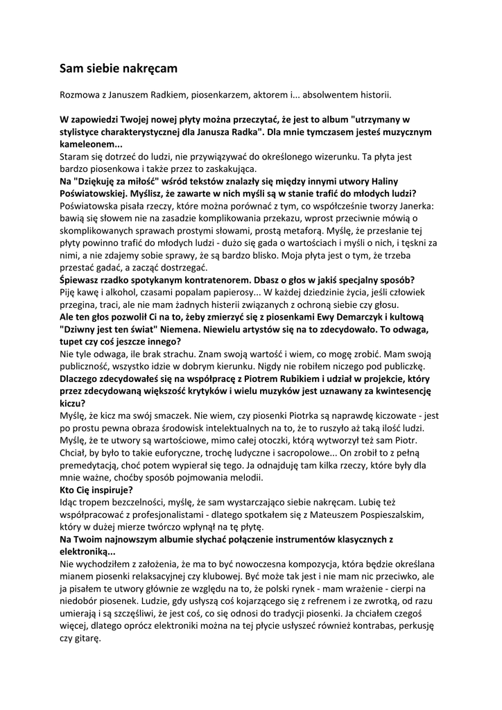 Sam siebie nakręcam Rozmowa z Januszem Radkiem, piosenkarzem, aktorem i... absolwentem historii. W zapowiedzi Twojej nowej płyty można przeczytać, że jest to album "utrzymany w stylistyce charakterystycznej dla Janusza Radka". Dla mnie tymczasem jesteś muzycznym kameleonem... Staram się dotrzeć do ludzi, nie przywiązywać do określonego wizerunku. Ta płyta jest bardzo piosenkowa i także przez to zaskakująca. Na "Dziękuję za miłość" wśród tekstów znalazły się między innymi utwory Haliny Poświatowskiej. Myślisz, że zawarte w nich myśli są w stanie trafić do młodych ludzi? Poświatowska pisała rzeczy, które można porównać z tym, co współcześnie tworzy Janerka: bawią się słowem nie na zasadzie komplikowania przekazu, wprost przeciwnie mówią o skomplikowanych sprawach prostymi słowami, prostą metaforą. Myślę, że przesłanie tej płyty powinno trafić do młodych ludzi ‐ dużo się gada o wartościach i myśli o nich, i tęskni za nimi, a nie zdajemy sobie sprawy, że są bardzo blisko. Moja płyta jest o tym, że trzeba przestać gadać, a zacząć dostrzegać. Śpiewasz rzadko spotykanym kontratenorem. Dbasz o głos w jakiś specjalny sposób? Piję kawę i alkohol, czasami popalam papierosy... W każdej dziedzinie życia, jeśli człowiek przegina, traci, ale nie mam żadnych histerii związanych z ochroną siebie czy głosu. Ale ten głos pozwolił Ci na to, żeby zmierzyć się z piosenkami Ewy Demarczyk i kultową "Dziwny jest ten świat" Niemena. Niewielu artystów się na to zdecydowało. To odwaga, tupet czy coś jeszcze innego? Nie tyle odwaga, ile brak strachu. Znam swoją wartość i wiem, co mogę zrobić. Mam swoją publiczność, wszystko idzie w dobrym kierunku. Nigdy nie robiłem niczego pod publiczkę. Dlaczego zdecydowałeś się na współpracę z Piotrem Rubikiem i udział w projekcie, który przez zdecydowaną większość krytyków i wielu muzyków jest uznawany za kwintesencję kiczu? Myślę, że kicz ma swój smaczek. Nie wiem, czy piosenki Piotrka są naprawdę kiczowate ‐ jest po prostu pewna obraza środowisk intelektualnych na to, że to ruszyło aż taką ilość ludzi. Myślę, że te utwory są wartościowe, mimo całej otoczki, którą wytworzył też sam Piotr. Chciał, by było to takie euforyczne, trochę ludyczne i sacropolowe... On zrobił to z pełną premedytacją, choć potem wypierał się tego. Ja odnajduję tam kilka rzeczy, które były dla mnie ważne, choćby sposób pojmowania melodii. Kto Cię inspiruje? Idąc tropem bezczelności, myślę, że sam wystarczająco siebie nakręcam. Lubię też współpracować z profesjonalistami ‐ dlatego spotkałem się z Mateuszem Pospieszalskim, który w dużej mierze twórczo wpłynął na tę płytę. Na Twoim najnowszym albumie słychać połączenie instrumentów klasycznych z elektroniką... Nie wychodziłem z założenia, że ma to być nowoczesna kompozycja, która będzie określana mianem piosenki relaksacyjnej czy klubowej. Być może tak jest i nie mam nic przeciwko, ale ja pisałem te utwory głównie ze względu na to, że polski rynek ‐ mam wrażenie ‐ cierpi na niedobór piosenek. Ludzie, gdy usłyszą coś kojarzącego się z refrenem i ze zwrotką, od razu umierają i są szczęśliwi, że jest coś, co się odnosi do tradycji piosenki. Ja chciałem czegoś więcej, dlatego oprócz elektroniki można na tej płycie usłyszeć również kontrabas, perkusję czy gitarę. W jednym z wywiadów powiedziałeś, że artysta nie powinien dawać z siebie wszystkiego podczas występu. Dlaczego tak uważasz? Kiedy artysta daje z siebie wszystko, jest histeria, która potrafi nawet zażenować. To słuchacze mają się wzruszać, płakać czy śmiać się, a artyści o tym opowiadać, nie tracąc kontroli nad sobą. Inaczej staniemy się śmieszni, przekroczymy granicę dobrego smaku. Rozmawiała Marta Sarnecka