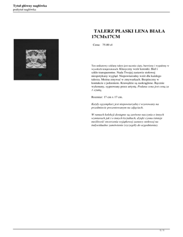 Tytuł główny nagłówka podtytuł nagłówka TALERZ PŁASKI LENA BIAŁA 17CMx17CM Cena: 75.00 zł Ten unikatowy szklany talerz jest ręcznie cięty, barwiony i wypalony w wysokich temperaturach. Klasyczny wzór koronki. Biel i szkło transparentne. Nada Twojej zastawie stołowej niespotykany wygląd. Niepowtarzalny wzór dla każdego talerza. Można zmywać w zmywarkach. Bezpieczny w kontakcie z jedzeniem. Krawędzie są zaokrąglone. Ręcznie wykonany, sygnowany przez artystę. Podana cena jest ceną za 1 sztukę. Rozmiar: 17 cm x 17 cm. Każdy egzemplarz jest niepowtarzalny i wzorowany na przedmiocie prezentowanym na zdjęciach. W ramach kolekcji dostępne są zarówno naczynia o innych wymiarach jak i o innych kształtach, dzięki czemu istnieje możliwość stworzenia wyjątkowej zastawy stołowej na indywidualne zamówienie (szczegóły do uzgodnienia). 1/1 Powered by TCPDF (www.tcpdf.org)