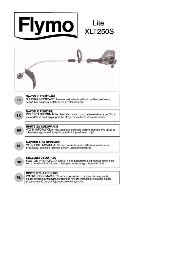 CZ NÁVOD K POUŽÍVÁNÍ DŮLEŽITÁ INFORMACE: Prosíme, než začnete zařízení používat, přečtěte si pečlivě tyto pokyny a ujistěte se, že jim plně rozumíte. SK NÁVOD K POUŽITIU DÔLEŽITÁ INFORMÁCIA: Prečítajte, prosím. pozorne tento návod k použitiu a HR UPUTE ZA RUKOVANJE VAŽNA INFORMACIJA: Prije upotrebe proizvoda pažljivo pročitajte ove upute za SI HU PL presvedčte sa pred prvým použitím strojja, že všetkému dobre rozumiete. rukovanje i siguran rad, i uvjerite se jeste li ih pravilno razumjeli. NAVODILA ZA UPORABO VAŽNA INFORMACIJA: Skrbno preberite ta navodila za uporabo in se prepričajte, da ste jih razumeli preden uporabite proizvod. KEZELÉSI ÚTMUTATÓ FONTOS INFORMÁCIO: Kérjük, a gép használata előtt olvassa el figyelme- sen az utasításokat, míg nem bizonyos benne, hogy megértette őket. INSTRUKCJA OBSŁUGI WAZNE INFORMACJE: Przed rozpoczęciem użytkowania urządzenia, należy uważnie przeczytać i zrozumieć ninijszą instrukcją. Instrukcje należy przechowywać do późniejszego z niej korzystania. IDENTYFIKACJA (CO JEST CO?) Instrukcja obsługi Wał Uchwyt roboczy Tuleja blokująca Głowica kosy Pompka rozruchowa Osłona Tłumik Przepustnica Świeca Przełącznik ZAŁ/WYŁ Rączka rozrusznika Dzwignia ssania Klucz Zbiornik paliwa OZNACZENIA SYMBOLI A. B. C. D. E. F. G. H. I. J. K. L. OSTRZEżENIE! Kosa może byc niebezpieczna! Nieostrożne lub nieodpowiednie użycie może prowadzić do poważnych, a nawet śmiertelnych obrażeń ciała. Przed przystąpieniem do eksploatacji kosy należy dokładnie zapoznać się z niniejszą instrukcją. Z tym uchwytem można stosować wyłącznie głowicę koszącą. Do urządzenia nigdy nie wolno montować noży tnących lub urządzeń młócących. OSTRZEŻENIE! Podczas pracy, żyłka może powodować dynamiczne wyrzucanie przedmiotów. Może to spowodować obrażenia oczu lub innych części ciała. Należy zawsze stosować środki ochrony wzroku. Podczas pracy należy zawsze stosować: Środki ochrony słuchu Okulary ochronne lub przesłonę na oczy Uchwyt roboczy należy umieścić poniżej strzałki. Należy zwrócić uwagę, aby nikt nie znajdował się podczas pracy kosiarki w promieniu 15 metrów. Wymóg ten ma również zastosowanie w przypadku, gdy kilku operatorów pracuje w tym samym miejscu. Jako paliwo należy stosować benzynę bezołowiową lub wysokiej jakości benzynę z zawartością ołowiu wymieszaną z olejem silnikowym w proporcji 2,5%. Przełącznik ZAŁ/WYŁ silnika. Poziom mocy akustycznej (zgodnie z Dyrektywy 2000/14/EC) Maksymalna częstotliwość obrotów trzpienia, obr/min Ciśnienie akustyczne w odłeglości 7,5 metra 66 ZASADY BEZPIECZEŃSTWA OSTRZEŻENIE: Aby ograniczyć ry- zyko pożaru i poważnych obrażeń ciała, w czasie stosowania sprzętu ogrodniczego należy stosować się do podstawowych zasad bezpieczeństwa. Należy zapoznać się ze wszystkimi poleceniami i stosować się do nich. Glowica napędowa może być niebezpieczna! Operator powinien stosować się do instrukcji i ostrzeżeń znajdujących się na kosie oraz w instrukcji obsługi. Przed przystąpieniem do pracy należy zapoznać się z instrukcją! Należy dobrze poznać zasady pracy i obsługi urządzenia. Kosę mogą obsługiwać wyłącznie osoby, które zapoznały się i rozumieją polecenia i ostrzeżenia umieszczone na kosie oraz te znajdujące się w instrukcji obsługi. Zabronione jest używanie kosy przez dzieci. INSTRUKCJA OBSŁUGI ZALECENIA BEZPIECZEŃSTWA ZNAJDUJĄCE SIĘ NA URZĄDZENIU UWAGA: Do kosy nie wolno montować noży tnących, drutu lub urządzeń młócących. Kosa przeznaczona jest wyłącznie do użytku z żyłką tnącą. Dołączanie innych akcesoriów lub końcówek zwiększa ryzyko doznania obrażeń. OSTRZEŻENIE: Żyłka powoduje nagłe wyrzucanie obiektów spod kosy. Może to spowodować uszkodzenie wzroku lub obrażenia operatora lub innych osób. Stosować okulary ochronne oraz spodnie ochronne. Obracająca się żyłka nie może dotykać części ciała. BEZPIECZEŃSTWO OPERATORA S Należy być odpowiednio ubranym. Podczas pracy i konserwacji kosy należy zawsze stosować okulary ochronne lub podobne środki ochrony wzroku (o okulary ochronne należy zapytać sprzedawcę). Środki ochrony wzroku powinny nosić oznaczenie Z87. S W przypadku pracy w zakurzonych warunkach należy zawsze stosować maskę na twarz lub maskę przeciwpyłową. S Należy zawsze stosować mocne, długie spodnie, długie rękawy, obuwie robocze oraz rękawice. Zaleca się stosowanie osłon na nogi. S Należy zawsze nosić odpowiednie obuwie robocze. Nie wolno pracować bez obuwia lub w sandałach. Nie należy zbliżać się do wirującej żyłki. S Długie włosy należy spiąć powyżej ramion. Upiąć lub zdjąć luźne części ubrań lub ubrania z luźno zwisającymi paskami, frędzlami, itp. Mogą się one dostać w ruchome części kosy. S Ubranie robocze w pełni zakrywające ciało zabezpiecza operatora przed odłamkami i fragmentami toksycznych roślin, które są wyrzucane przez obracającą się żyłkę. S W czasie pracy należy zachować ostrożność i przezorność. Kosy nie należy obsługiwać w stanie zmęczenia, choroby, zdenerwowania lub po spożyciu alkoholu, narkotyków lub leków. Należy zwracać uwagę na to, co się robi i kierować się zdrowym rozsądkiem. S Należy stosować środki ochrony słuchu. S Tłumik z katalizatorem jest bardzo gorący zarówno podczas pracy, jak i zaraz po jej ukończeniu. Dotyczy to również pracy na biegu jałowym. Dotknięcie może spowodować oparzenie skóry. Należy pamiętać o zagrożeniu pożarowym! S Kosy nigdy nie należy uruchamiać ani obsługiwać w zamkniętych pomieszczeniach lub budynkach. Wdychanie spalin może spowodować śmiertelne zaczadzenie. S Rączki nie powinny być zabrudzone olejem lub paliwem. BEZPIECZNA EKSPLOATACJA KOSY / KONSERWACJA Dzieci, osoby postronne oraz zwierzęta powinny znajdować