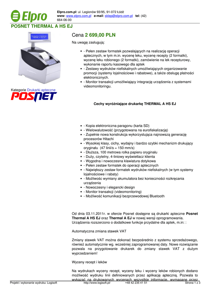Elpro.com.pl: ul. Legionów 93/95, 91-072 Łódź www: www.elpro.com.pl e-mail: [email protected] tel: (42) 664-06-00 POSNET THERMAL A HS EJ Cena 2 699,00 PLN Na uwagę zasługują: Kategorie Drukarki apteczne - Pełen zestaw formatek pozwalających na realizację operacji aptecznych, w tym m.in. wycenę leku, wycenę recepty (2 formatki), wycenę leku robionego (2 formatki), zamówienie na lek recepturowy, wykonanie raportu kasowego dla aptek - Zestawy wydruków niefiskalnych umożliwiających organizowanie promocji (systemy lojalnościowe i rabatowe), a także obsługę płatności elektronicznych. - Monitor transakcji umożliwiający integrację urządzenia z systemami videomonitoringu. Cechy wyróżniające drukarkę THERMAL A HS EJ - Kopia elektroniczna paragonu (karta SD) - Wielowalutowość (przygotowana na eurofiskalizację) - Zupełnie nowa konstrukcja wykorzystująca najnowszą generację procesorów Hitachi - Wysokiej klasy, cichy, wydajny i bardzo szybki mechanizm drukujący oryginału (47 linii/s = 150 mm/s) - Dłuższa, 100 metrowa rolka papieru oryginału - Duży, czytelny, 4-liniowy wyświetlacz klienta - Wygodna i nowoczesna klawiatura dotykowa - Pełen zestaw formatek do operacji aptecznych - Największy zestaw formatek wydruków niefiskalnych (w tym systemy lojalnościowe i rabaty) - Możliwośc wymiany akumulatora bez konieczności rozkręcania urządzenia - Nowoczesny i elegancki design - Monitor transakcji (videomonitoring) - Możliwość komunikacji bezprzewodowej Bluetooth Od dnia 03.11.2011r. w ofercie Posnet dostępne są drukarki apteczne Posnet Thermal A HS EJ oraz Thermal A EJ w nowej wersji oprogramowania. Urządzenia rozszerzono o dodatkowe funkcje przydatne dla aptek, m.in: : Automatyczna zmiana stawek VAT Zmiany stawek VAT można dokonać bezpośrednio z systemu sprzedażowego, również automatycznie wg. wcześniej zaprogramowanej daty. Nowe rozwiązanie pozwala na przygotowanie drukarek do zmiany stawek VAT z dużym wyprzedzeniem! Wyceny recept i leków Projekt i wykonanie wydruku: Logisoft Na wydrukach wyceny recept, wyceny leku i wyceny leków robionych dodano możliwość wydruku linii definiowanych przez aplikację apteczną. Pozwala to wykazać na drukowanych wycenach wszystkie informacje, wymagane przez http://www.logisoft.pl/ +48 42 235 41 51 Strona 1 z 3 Narodowy Fundusz Zdrowia. Rabaty i narzuty Dodano możliwość udzielenia rabatów/narzutów do całego paragonu oraz do towarów w wybranej stawce podatkowej. Towary apteczne podlegają rabatowi/narzutowi, jeżeli cena jest równa opłacie jednostkowej (kwocie płaconej przez pacjenta za dany lek). Drukarka daje możliwość wydrukowania na paragonie informacji o łącznej kwocie udzielonych rabatów i/lub narzutów (oddzielna pozycja) Opłaty wg stawek VAT na raporcie dobowym Na raportach dobowych oraz okresowych dodano rozliczenie opłat w poszczególnych stawkach podatkowych. Wykonanie raportu dobowego skutkuje zapisem do pamięci fiskalnej informacji o pobranych opłatach. Ułatwia to podatnikowi rozliczenie należnego podatku VAT w danym miesiącu. Na podstawie drukowanych raportów potwierdzimy również należną aptece kwotę refundacji. Wersja produktu Cena POSNET THERMAL A HS EJ Pokrywa czarna 2 699,00 PLN 3 319,77 PLN netto POSNET THERMAL A HS EJ Pokrywa półprzezroczysta 2 699,00 PLN 3 319,77 PLN netto DANE TECHNICZNE NAZWA Posnet Thermal-A HS EJ TYP DRUKARKI FISKALNEJ Z kopią elektroniczną PRZEZNACZENIE Apteki LICZBA PROGRAMOWANYCH TOWARÓW 250 000 STAWKI PODATKOWE 7 LICZBA ZNAKÓW W NAZWIE TOWARU 40 + dodatkowa linia opisu NOŚNIK KOPII ELEKTRONICZNEJ Karta SD/SDHC MECHANIZM DRUKUJĄCY Jeden mechanizm termiczny SZEROKOŚĆ PAPIERU 57 mm WYŚWIETLACZ OBSŁUGI Wspólny z wyświetlaczem klienta WYŚWIETLACZ KLIENTA Alfanumeryczny LCD 4 x 20 znaków z podświetleniem INTERFEJSY 1 x RS232, 1 x USB, Bluetooth po dołączeniu modułu RSBT2 (opcjonalnie) URZĄDZENIA WSPÓŁPRACUJĄCE Szuflada (interfejs napięciowy 6V) ZASILANIE ZEWNĘTRZNE Zasilacz zewnętrzny 230V / 24V / 2A ZASILANIE WEWNĘTRZNE Wbudowany akumulator zapewniający wydruk min. 6000 linii GABARYTY (szer. x dł. x wys.) 162 x 272 x 295 mm WAGA 3,5 kg (z papierem) Projekt i wykonanie wydruku: Logisoft http://www.logisoft.pl/ +48 42 235 41 51 Strona 2 z 3 Galeria Produkty powiązane Rolki termiczne EMERSON ROLKI TERMICZNE 57/30 10SZT 19,83 PLN EMERSON ROLKI TERMICZNE 57/45 10SZT 29,36 PLN Projekt i wykonanie wydruku: Logisoft Powered by TCPDF (www.tcpdf.org) http://www.logisoft.pl/ +48 42 235 41 51 Strona 3 z 3