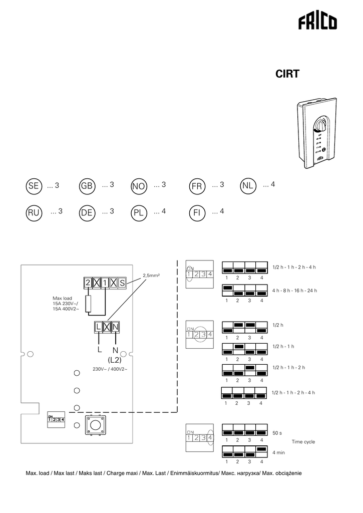 CIRT kW 4h 2h 1h 1/2 CIRT SE .... 3 RU .... 3 GB .... 3 NO .... 3 FR .... 3 DE .... 3 PL .... 4 FI NL .... 4 .... 4 1/2 h - 1 h - 2 h - 4 h 2 1 S Max load 15A 230V~/ 15A 400V2~ 2,5mm² 1 4 2 3 4 N 1/2 h 1 L 3 4 h - 8 h - 16 h - 24 h 1 L 2 N (L2) 2 3 4 1/2 h - 1 h 1 2 3 4 1/2 h - 1 h - 2 h 230V~ / 400V2~ 1 2 3 4 1/2 h - 1 h - 2 h - 4 h 1 2 3 4 1 2 3 4 50 s Time cycle 4 min 1 2 3 4 Max. load / Max last / Maks last / Charge maxi / Max. Last / Enimmäiskuormitus/ Макс. нагрузка/ Max. obciążenie h CIRT (4 x) 48,1 126,6 155 86,7 montowany na nieuziemionej, przewodzącej ścianie FI: Toimii kiinnitysruuvien eristeenä, kun CIRT asennetaan maadoittamattomalle, johtavall pinnalle, esim. ohutlevyseinälle (1 x) 43 Ø5,2 SE: Isolerar fästskruvar då CIRT monteras på en ojordad ledande yta, t.ex. en plåtvägg GB: Isolates the fixing screws when CIRT is mounted on an ungrounded conducting surface such as a sheet metal wall NO: Isolere festeskruer ved montering på ikke jordet ledende overflate. FR: Cette pièce assure l’isolation des vis de fixation lors d’un montage sur une surface conductrice, par exemple une tôle métallique. RU: Изолирует крепежные элементы, если CIRT устанавливается на токопроводящую незаземленную поверхность, DE: Isoliert die Befestigungsschrauben, wenn CIRT auf einer nicht geerdeten, leitenden Oberfläche wie z.B. einer Metallwand montiert wird. PL: Należy zaizolować śruby mocujące, wtedy gdy regulator CIRT jest Knockout Ø21 32 (2 x) SE: För vidarekoppling av jordanslutning (CIRT saknar jordplint) GB: For serial earth connection (CIRT does not have an earth terminal) NO: For viderekobling av jord. ( CIRT har ikke plint for jord ). FR: Pour un raccordement à la terre (le CIRT n’a pas de borne terre) RU: Для серийного подключения (CIRT не имеет клеммы заземления) DE: Für serielle Erdung (CIRT hat keine Klemme für Erdung) PL: 24 h 4h 16 h 2h 8h 1h 4h 1/2 h W przypadku łączenia kilku regulatorów (CIRT nie posiada stałego podłączenia uziemienia) CIRT 1x = 1/2 h ( 4 h) 2x = 1 h (8 h) 3x = 2 h (16 h) 4x = 4 h (24 h) 5x = 0 h FI: Maadoituskytkimen edelleen kytkentää varten (CIRT:ssä ei ole maadoitusliitintä) E-nr EL-nr (SE) (NO) 85 702 92 543 25 39 HxWxD*1 [mm] 155x87x43 Voltage*2 [V] 230V~/400V2~ Load*3 [W] 3500/6000W Kräver min. last 200 W / Minimum load 200 W / Min. last 200W / Charge mini 200 W / Мин. нагрузка 200Вт / Minimum Last 200W / Vähimmäiskuormitus 200 W / Minimalne obciążenie 200W SE / NO / FR / RU / DE / PL / FI ) HxBxD / HxBxD / HxLxP / Габариты / HxBxT / wysokość x szerokość x głębokość / KxLxS ) Spänning / Spenning / Tension / Напряжение / Spannung / Napięcie pracy / Jännite *3 ) Belastning / Belastning / Charge / Макс. нагрузка / Last / obciążenie / Kuormitus *1 *2 2 CIRT SE CIRT är en steglös effektregulator med timer främst avsedd för infravärmare och andra värmestrålare. Speciellt lämplig för punkt- eller zonuppvärmning. Värmetillskottet regleras för bästa komfort (25-100%). Inbyggd timer som kan ställas in på 30 minuter till 4 timmar respektive 4 till 24 timmar. Installationen, som ska föregås av en allpolig brytare med ett brytavstånd om minst 3mm, ska utföras av behörig installatör och i enlighet med gällande föreskrifter. Standardcykeltid är 50 sekunder. Vid strömstyrka över 8 A kan störningar på nätdrivna apparater uppstå. Detta löses genom en cykeltid på 4 minuter. Cykeltider på 50 sekunder är oftast att föredra för en jämnare temperatur, särskilt för snabbverkande värmare såsom CIR. Timerfunktionen kan tas bort genom en förregling mellan N och S via exv. extern brytare, varvid effektregleringen är inkopplad kontinuerligt. IP44. FR Le CIRT est un régulateur à sortie variable équipé d’une minuterie, conçu pour les émetteurs à infrarouge et d’autres produits rayonnants. Convient particulièrement pour le chauffage de poste ou de zone. La puissance de chauffage est régulée pour un meilleur confort (25-100%). La minuterie intégrée permet une réglage de 30 minutes-4 heures ou de 4-24 heures. La durée d’un cycle standard est de 50 secondes. Une intensité supérieure à 8A peut perturber des appareils connectés sur le même réseau. Ceci peut être résolu en sélectionnant un cycle de 4 minutes. Des cycles de 50 secondes sont préférables pour une température stable, surtout pour des appareils à mise en température rapide tels que le CIR. La fonction minuterie peut être supprimée en mettant un shunt entre N et S, ainsi la régulation de la puissance reste continue. GB RU CIRT is a variable output regulator with timer, primarily intended for infrared heaters and other radiant heaters. Especially suited for spot and zone heating. The heat contribution is regulated for best comfort (25-100%). Builtin timer that can be set on 30 minutes to 4 hours or 4 to 24 hours respectively. The standard time cycle is 50 seconds. At amperages above 8 A disturbances on mains-operated devices might occur. This can be solved by choosing a time cycle of 4 minutes. Time cycle of 50 seconds is preferable for an even temperature, especially for fast response heaters such as CIR The timer function may be removed by a linking between N and S via for example external switch, the output regulation is then on continously. IP44. Контроллер CIRT представляет собой безшаговый регулятор со встроенным таймером, предназначенный для управления работой обогревательных (преимущественно инфракрасных) приборов. Уровень мощности регулируется в пределах 25-100%. Максимальная нагрузка 2300/5000Вт при