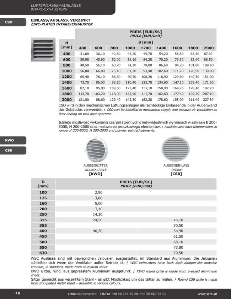 LUFTEINLÄSSE/-AUSLÄSSE INTAKE/EXHAUSTERS EINLASS/AUSLASS, VERzINKT CSO zINC-PLATED INTAKE/EXHAUSTER PREIS [EUR/St.] PRICE [EUR/unit] H [mm] b [mm] 400 600 800 1000 1200 1400 1600 1800 2000 400 31,60 36,10 40,60 45,20 49,70 54,20 58,80 63,30 67,80 600 39,90 45,90 52,00 58,10 64,20 70,20 76,30 82,40 88,50 800 48,50 56,10 63,70 71,30 79,00 86,60 94,20 101,80 109,40 1000 56,80 66,00 75,10 84,30 93,40 102,60 111,70 120,90 130,00 1200 65,40 76,10 86,80 97,50 108,20 118,90 129,60 140,30 151,00 1400 73,70 86,00 98,20 110,40 122,70 134,90 147,10 159,40 171,60 1600 82,10 95,80 109,60 123,40 137,10 150,90 164,70 178,40 192,20 1800 112,70 103,20 118,00 132,90 147,70 162,60 177,40 192,30 207,10 2000 121,00 88,60 129,40 145,80 162,20 178,60 195,00 211,40 227,80 cso wird in den mechanischen lüftungsanlagen als rechteckige Einlassende in der außenwand des Gebäudes verwendet. / cso can be installed in mechanical supply and exhaust air ventilation as duct ending on wall duct aperture. istnieje możliwość wykonania czerpni ściennych o indywidualnych wymiarach w zakresie b 2005000, h 200-2000 oraz malowania proszkowego elementów. / availabe also inter dimmensions in range of 200-5000, h 200-2000 and powder painted elements. KWO CSb aussEnGittEr aussEnEinlass round GrillE intakE [KWO] D [mm] [CSb] PREIS [EUR/St.] PRICE [EUR/unit] 100 2,90 125 3,80 160 5,00 200 7,40 250 14,30 315 24,50 355 400 46,10 50,50 46,20 54,90 450 61,50 500 68,10 550 73,80 630 79,50 wsc auslässe sind mit beweglichen Jalousien ausgestattet, im standard aus aluminium. die Jalousien schließen sich wenn der Ventilator außer betrieb ist. / wsc exhausters have back draft damper-like movable lamellas, in standard, made from aluminum sheet. kwo Gitter, rund, aus gepresstem aluminium ausgeführt. / kwo round grille is made from pressed aluminium sheet. Gitter gemacht aus verzinktem stahl - es gibt möglichkeit um das Gitter zu malen. / round csb grille is made from zinc-plated metal sheet – available in various colours. 18 E-mail [email protected] Tel/Fax +48 58 661 35 28, +48 58 667 81 92 www.scrol.pl