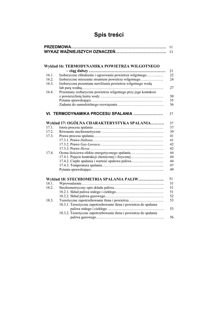Spis treści PRZEDMOWA…………………………………………………………….. 11 WYKAZ WAśNIEJSZYCH OZNACZEŃ……………………………….. 13 Wykład 16: TERMODYNAMIKA POWIETRZA WILGOTNEGO – ciąg dalszy ………………………………………………… 16.1. 16.2. 16.3. 16.4. Izobaryczne chłodzenie i ogrzewanie powietrza wilgotnego………..… Izobaryczne mieszanie strumieni powietrza wilgotnego………………. Izobaryczna przemiana nawilŜania powietrza wilgotnego wodą lub parą wodną…………………………………………………………. Przemiany izobaryczne powietrza wilgotnego przy jego kontakcie z powierzchnią lustra wody …………………………………………… Pytania sprawdzające………………………………………………….. Zadania do samodzielnego rozwiązania ……………………………….. 21 22 24 27 30 35 36 VI. TERMODYNAMIKA PROCESU SPALANIA …………………. 37 Wykład 17: OGÓLNA CHARAKTERYSTYKA SPALANIA………. 37 37 39 41 41 42 42 44 44 44 47 49 17.1. 17.2. 17.3. 17.4. Istota procesu spalania ………………………………………………… Równanie stechiometryczne …………………………………………… Prawa procesu spalania………………………………………………… 17.3.1. Prawo Daltona…………………………………………………. 17.3.2. Prawo Gay-Lussaca……………………………………………. 17.3.3. Prawo Hessa …………………………………………………… Ocena ilościowa efektu energetycznego spalania……………………… 17.4.1. Pojęcie kontrakcji chemicznej i fizycznej……………………… 17.4.2. Ciepło spalania i wartość opałowa paliwa……………………... 17.4.3. Temperatura spalania…………………………………………... Pytania sprawdzające…………………………………………………... Wykład 18: STECHIOMETRIA SPALANIA PALIW………………. 18.1. 18.2. 18.3. Wprowadzenie………………………………………………………….. Stechiometryczny opis składu paliwa………………………………….. 18.2.1. Skład paliwa stałego i ciekłego………………………………… 18.2.2. Skład paliwa gazowego………………………………………… Teoretyczne zapotrzebowanie tlenu i powietrza ………………………. 18.3.1. Teoretyczne zapotrzebowanie tlenu i powietrza do spalania paliwa stałego i ciekłego ………………………………………. 18.3.2. Teoretyczne zapotrzebowanie tlenu i powietrza do spalania paliwa gazowego……………………………………………….. 51 51 51 51 52 53 53 56 6 Spis treści 18.4. 18.5. 18.6. 18.7. Rzeczywiste zapotrzebowanie powietrza do spalania………………….. Obliczenie ilości spalin………………………………………………… 18.5.1. Ilość spalin podczas spalania paliwa stałego i ciekłego………... 18.5.2. Ilość spalin podczas spalania paliwa gazowego……………….. Przykłady obliczeniowe………………………………………………... Uzupełnienie …………………………………………………………… Pytania sprawdzające…………………………………………………... Zadania do samodzielnego rozwiązania………………………………... Wykład 19: METODY KONTROLI SPALANIA I OCENA JEGO WPŁYWU NA ŚRODOWISKO ………………….. 19.1 59 60 60 63 64 66 66 67 69 69 69 72 Metody kontroli procesu spalania……………………………………… 19.1.1. Ocena spalania niezupełnego i niecałkowitego………………… 19.1.2. Sposoby określania współczynnika nadmiaru powietrza λ…….. Ocena wpływu i kontrola szkodliwych dla środowiska produktów spalania paliw …………………………………………………………. Pytania sprawdzające ………………………………………………….. 75 82 VIII. TERMODYNAMIKA PRZEPŁYWU CZYNNIKA ……………. 83 19.2. Wykład 20: PODSTAWOWE PRAWA I PARAMETRY OPISUJĄCE PRZEPŁYW CZYNNIKA TERMODYNAMICZNEGO 83 20.1. 20.2. 20.3. 20.4. Wprowadzenie …………………………………………………………. Pojęcia podstawowe …………………………………………………… 20.2.1. NatęŜenie przepływu płynu …………………………………… 20.2.2. Prędkość przepływu …………………………………………… Prawa opisujące przepływ płynu ……………………………………… 20.3.1. Zasada zachowania materii (masy) ……………………………. 20.3.2. Zasada zachowania energii……………………………………... 20.3.3. Zasada zachowania ilości ruchu ……………………………….. Parametry przepływu adiabatycznego …………………………………. 20.4.1. Parametry spiętrzenia (spoczynkowe) …………………………. 20.4.2. Parametry w przekroju wypływowym ………………………… 20.4.3. Parametry krytyczne …………………………………………… Pytania sprawdzające ………………………………………………….. 83 84 85 86 86 86 87 89 89 89 92 96 103 Wykład 21: ADIABATYCZNY PRZEPŁYW CZYNNIKA W KANAŁACH O ZMIENNYM PRZEKROJU ………… 105 21.1. 21.2. 21.3. 21.4. Wprowadzenie ………………………………………………………… Przepływ adiabatyczny w dyszy prostej Bendemanna…………………… Przepływ adiabatyczny w dyszy de Lavala ……………………………. Zastosowanie praw przepływu płynów ściśliwych w miernictwie…….. 21.4.1. Zasada działania zwęŜek pomiarowych………………………... 21.4.2. Zasada pomiaru prędkości rurką Prandtla……………………….. 105 106 111 113 115 119 Spis treści 21.5. Przykłady obliczeniowe ……………………………………………….. Pytania sprawdzają