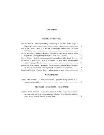 SPIS TREŚCI ROZPRAWY I STUDIA EDWARD RYMAR – Prałatura kapituły kamieńskiej w XII–XVI wieku. Część I: Prepozyci ................................................................................................................... 5 ALICJA BIRANOWSKA-KURTZ – Rozwój przestrzenny miasta Płoty do końca XX wieku ................................................................................................................... 31 MIŁOSZ STĘPIŃSKI – XI Letnie Igrzyska Olimpijskie w Berlinie w polskiej historiografii i w „Przeglądzie Sportowym” z 1936 roku. Część II ........................ 63 STEFAN DUDRA – Kościół prawosławny na Pomorzu Zachodnim. Część II ..................... 85 EUGENIUSZ Z. ZDROJEWSKI, KINGA KIJEWSKA – Coraz lepsze wykorzystanie zasobów pracy w Polsce ............................................................................................ 101 KRZYSZTOF KOWALCZYK – Kampania Platformy Obywatelskiej Rzeczypospolitej Polskiej w wyborach samorządowych w 2006 roku w Szczecinie ....................... 130 EUGENIUSZ MAZUR – Puszcza Bukowa jako rejon turystyczny ................................ 149 WSPOMNIENIA URSZULA KOZŁOWSKA – Z pamiętnika lekarza – początki słuŜby zdrowia w powojennym Szczecinie ................................................................................................ 167 RECENZJE W OMÓWIENIA W POLEMIKI DARIUSZ WYBRANOWSKI – Maria Rosa Menocal, Ozdoba świata. Jak muzułmanie, Ŝydzi i chrześcijanie tworzyli kulturę tolerancji w średniowiecznej Hiszpanii. Przeł. Tomasz Tesznar. Kraków 2006 ............................................................. 179 4 Spis treści – Inhalt INHALT ABHANDLUNGEN UND STUDIEN EDWARD RYMAR – Die Prälaten des Kamminer Domkapitels im 12.–16. Jahrhundert. Teil I: Die Propste ....................................................................................... 5 ALICJA BIRANOWSKA-KURTZ – Die räumliche Entwicklung der Stadt Płoty/Plathe bis zum Ende des 20. Jahrhundert ............................................................................. 31 MIŁOSZ STĘPIŃSKI – Die XI. Olympischen Spiele Berlin in polnischer Geschichtsschreibung und in „Przegląd Sportowy” [„Sportrundschau”] 1936. Teil II ........................................................................................................................ 63 STEFAN DUDRA – Die Orthodoxe Kirche in Westpommern. Teil II................................85 EUGENIUSZ Z. ZDROJEWSKI, KINGA KIJEWSKA – Die immer bessere Nutzung der Arbeitsressourcen in Polen ........................................................................................ 101 KRZYSZTOF KOWALCZYK – Die Wahlkampagne der Platforma Obywatelska Rzeczypospolitej Polskiej [Bürgerplattform der Republik Polen] bei Selbstverwaltungswahlen Szczecin 2006 ............................................................................ 130 EUGENIUSZ MAZUR – Puszcza Bukowa [Buchheide] als ein touristisches Gebiet ............ 149 ERINNERUNGEN URSZULA KOZŁOWSKA – Aus dem Tagebuch eines Arztes. Über die Anfänge des Gesundheitswesens im Nachkriegs-Stettin ................................................................ 167 REZENSIONEN W BESPRECHUNGEN W POLEMIKEN DARIUSZ WYBRANOWSKI – Maria Rosa Menocal, Ozdoba świata. Jak muzułmanie, Ŝydzi i chrześcijanie tworzyli kulturę tolerancji w średniowiecznej Hiszpanii [Die Zierde der Welt. Wie die Muslims, die Juden und die Christen die Toleranzkultur im mittelalterlichen Spanien bildeten]. Übers. v. Tomasz Tesznar. Kraków 2006 ............................................................................................... 179 P R Z E G L Ą D Z A C H O D N I O P O M O R S K I TOM XXIV (LIII) ROK 2009 ZESZYT 1 R O Z P R A W Y I S T U D I A EDWARD RYMAR Pyrzyce PRAŁATURA KAPITUŁY KAMIEŃSKIEJ W XII–XVI WIEKU Część I: Prepozyci Kapituły katedralne w średniowiecznej Europie zostały ostatecznie ukształtowane jako instytucje kościelne, mające osobowość prawną, w przeciągu XII– XIII wieku. Ich genezę naleŜy łączyć z rozwojem prezbiteriów biskupich – kolegiów duchownych skupionych wokół biskupa, które swoimi korzeniami sięgają czasów staroŜytnych. Kapituły były instytucjami o charakterze korporacyjnym, z prawem swobodnego decydowania o własnym majątku, składzie wewnętrznym, moŜliwością wystawiania dokumentów, które uwierzytelniały własną pieczęcią. Te cechy określały niezaleŜność prawną w stosunku do innych instytucji i osób prawnych. Kapituły składały się z duchownych, sprawujących uroczystą słuŜbę boŜą w katedrze oraz biorących czynny udział w administrowaniu diecezją1. Zarząd diecezji kamieńskiej i jej majątku pozostawał zrazu, po 1140 r., w ręku biskupa. Z czasem, wobec wzrostu tego majątku i dochodów, konieczne było otoczenie się w mieście biskupim grupą kleru, zwaną prezbiterium, która występuje stale – w świetle coraz liczniejszych dokumentów – wokół biskupa, ale i przy czynnościach prawnych ksiąŜąt pomorskich. Do tego dochodziła grupa duchownych (notariuszy) z kancelarii biskupiej – z czasem pod przewodnictwem kanclerza dobieranego spośród kanoników – zwykle wikariuszy przy ołtarzach kościoła katedralnego. Jednocześnie postępował proces emancypacji 1 Określenie wprowadzone przez W. Abrahama, Organizacja Kościoła w Polsce do połowy wieku XII. Wyd. 2. Lwów 1893, s. 141 i n. 6 Edward Rymar biskupstwa spod władzy ksiąŜąt. Powstanie w połowie XIII w. dominium biskupiego najpierw w ziemi stargardzkiej (1240), a po 1248 r. w kołobrzeskiej, absorbowało biskupa na tyle, Ŝe dobrami biskupstwa z ośrodkiem w Kamieniu Pomorskim zajmowała się stale grupa kanoników. W Kamieniu wspólnota kleru, zwana kanonikatem, istniała w 1175 r., kiedy wystąpił pierwszy jej prepozyt stojący na czele kapituły. Skład i uszeregowanie prałatów poznajemy coraz lepiej w XIII