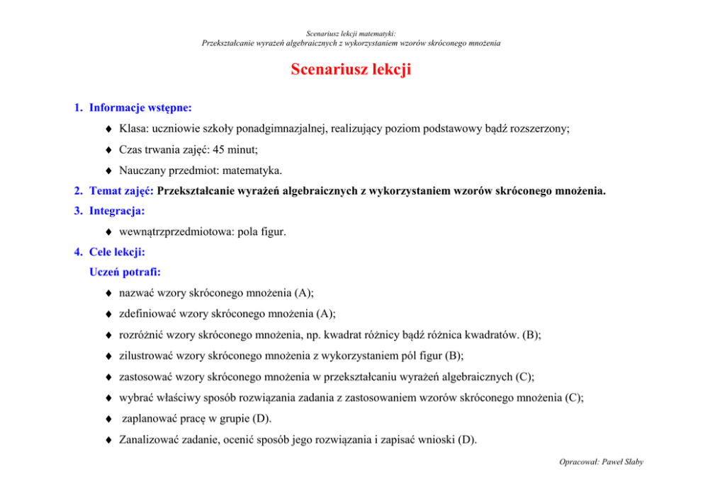 Scenariusz lekcji matematyki: Przekształcanie wyrażeń algebraicznych z wykorzystaniem wzorów skróconego mnożenia Scenariusz lekcji 1. Informacje wstępne: ♦ Klasa: uczniowie szkoły ponadgimnazjalnej, realizujący poziom podstawowy bądź rozszerzony; ♦ Czas trwania zajęć: 45 minut; ♦ Nauczany przedmiot: matematyka. 2. Temat zajęć: Przekształcanie wyrażeń algebraicznych z wykorzystaniem wzorów skróconego mnożenia. 3. Integracja: ♦ wewnątrzprzedmiotowa: pola figur. 4. Cele lekcji: Uczeń potrafi: ♦ nazwać wzory skróconego mnożenia (A); ♦ zdefiniować wzory skróconego mnożenia (A); ♦ rozróżnić wzory skróconego mnożenia, np. kwadrat różnicy bądź różnica kwadratów. (B); ♦ zilustrować wzory skróconego mnożenia z wykorzystaniem pól figur (B); ♦ zastosować wzory skróconego mnożenia w przekształcaniu wyrażeń algebraicznych (C); ♦ wybrać właściwy sposób rozwiązania zadania z zastosowaniem wzorów skróconego mnożenia (C); ♦ zaplanować pracę w grupie (D). ♦ Zanalizować zadanie, ocenić sposób jego rozwiązania i zapisać wnioski (D). Opracował: Paweł Słaby Scenariusz lekcji matematyki: Przekształcanie wyrażeń algebraicznych z wykorzystaniem wzorów skróconego mnożenia 5. Postawy i zainteresowania: ♦ kształtowanie umiejętności pracy w grupie; ♦ kształtowanie samodzielności, inicjatywy, systematyczności i odpowiedzialność za uzyskany wynik; ♦ kształtowanie krytycyzmu w stosunku do wypowiedzi kolegi; ♦ dbanie o estetykę pracy. 6. Strategie nauczania: operacyjna. 7. Metody nauczania: ♦ pogadanka; ♦ gra dydaktyczna; ♦ metaplanu. 8. Zasady nauczania: ♦ świadomego i aktywnego udziału ucznia w lekcji; ♦ wyrabianie pewności siebie u ucznia przez pracę i rolę w grupie; ♦ systematyczności i logicznej kolejności. ♦ stopniowania trudności; ♦ trwałości wiedzy. Opracował: Paweł Słaby Scenariusz lekcji matematyki: Przekształcanie wyrażeń algebraicznych z wykorzystaniem wzorów skróconego mnożenia 9. Formy pracy uczniów: ♦ indywidualna; ♦ grupowa. 10.Środki dydaktyczne: ♦ Zestaw 15kostek domina (załącznik nr 1). 11.Wykaz piśmiennictwa: ♦ dla ucznia i nauczyciela: - zasady gry (załącznik nr 2) - karta pracy z zadaniami dla grup (załącznik nr 3) 12.Struktura lekcji: Kolejne etapy Zaangażowanie Badanie Przebieg lekcji Nauczyciel: • dzieli uczniów na grupy 4-5osobowe ; • zadaje pytania, mające na celu przypomnienie wzorów skróconego mnożenia; Uczniowie: • słuchają nauczyciela; • odpowiadają na pytania. Nauczyciel: • rozdaje kostki domina i objaśnia zasady gry (załącznik nr 1 oraz 2); Czas 5 minut Umiejętności kształtowane na lekcji • komunikacja uczeń-nauczyciel • współpraca w grupie; Opracował: Paweł Słaby Scenariusz lekcji matematyki: Przekształcanie wyrażeń algebraicznych z wykorzystaniem wzorów skróconego mnożenia Przekształcanie Prezentacja Badanie Uczniowie: • czytają instrukcję gry; • organizują pracę w grupie; Uczniowie: • przystępują do gry zgodnie z instrukcją; Nauczyciel: • obserwuje pracę w grupie i w razie wątpliwości udziela wyjaśnień. Nauczyciel: • po upływie czasu prosi uczniów o wspólne wykonanie działań i ułożenie domina • w przypadku błędnych rozwiązań prosi innych uczniów o podanie prawidłowej odpowiedzi lub sam wyjaśnia; • obserwuje sposób prezentacji. Uczniowie: • śledzą rozwiązanie zadania; • porównują sposób rozwiązania kolegów z własnymi sposobami. Nauczyciel: • prosi łącznika każdej grupy, by pobrał zestaw kartek z zadaniami oraz instrukcję do zadań (załącznik nr 3); • omawia metodę pracy uczniów zwaną metaplanem. Uczniowie: • zapoznają się z kartą pracy i przystępują do 3 minuty • komunikacja uczeń-uczeń; 8 minut • komunikacja uczeń-uczeń; • wzajemne uczenie się; 6 minut • komunikacja uczeń- nauczyciel; • autoprezentacja; • dbałość o przejrzystość rozwiązania. • 3 minuty • skuteczne porozumiewanie się; organizowanie i planowanie wspólnej pracy; Opracował: Paweł Słaby Scenariusz lekcji matematyki: Przekształcanie wyrażeń algebraicznych z wykorzystaniem wzorów skróconego mnożenia Przekształcanie Prezentacja Refleksja rozwiązywania zadania. Nauczyciel: • obserwuje pracę uczniów i w razie potrzeby udziela wyjaśnień. Uczniowie: • rozwiązują zadania zgodnie z instrukcją. Nauczyciel: • po upływie wyznaczonego czasu zaprasza kolejno sprawozdawców grup do prezentacji swoich rozwiązań. • w przypadku błędnych rozwiązań prosi innych uczniów o podanie prawidłowej odpowiedzi lub sam wyjaśnia. Uczniowie: • słuchają prezentacji i w razie potrzeby proszą o wyjaśnienie. Uczniowie: • wyciągają wnioski do dalszej pracy; • oceniają przebieg lekcji, Nauczyciel: • ocenia pracę zespołów; • wyraża opinię na temat osiągniętych efektów. • 8 minut • • • 8 minut 4 minuty • współpraca w grupie; wzajemne uczenie się; pełnienie powierzonych funkcji komunikacja (mówienie i słuchanie); weryfikacja błędnych rozwiązań. • pogłębianie procesów uczenia się; • komunikacja nauczyciel – uczeń Opracował: Paweł Słaby Scenariusz lekcji matematyki: Przekształcanie wyrażeń algebraicznych z wykorzystaniem wzorów skróconego mnożenia Załącznik nr 1 Start 4 x 2 + 4xy + y 2 x 2 + 4x + 4 2x + y 2 Pole kwadratu o boku x+2 (x + y )2 − 2 xy + 3x 2 x2 − y 2 Kwadrat różnicy liczb x i 2 x 2 − 4x + 4 x 2 + 6xy + 9 y 2 x + 3y x + 3y 4x2 + y 2 (x − y )(x + y ) 2x2 + y P=... .... Suma podwojonego kwadratu liczby x i liczby y 4x2 − 9 y 2 Opracował: Paweł Słaby Scenariusz lekcji matematyki: Przekształcanie wyrażeń algebraicznych z wykorzystaniem wzorów skróconego mnożenia 2x 2 x − 3 y 2 x + 3 y x x y y 2x 2 + y 2 4x + 2 y (x − 3y )2 P=... ........ x + 2 − x 2 + 2 y − 4 2 Kwadrat różnicy pewnych wyrażeń y 2 − 2x2 x 2 + 3x 