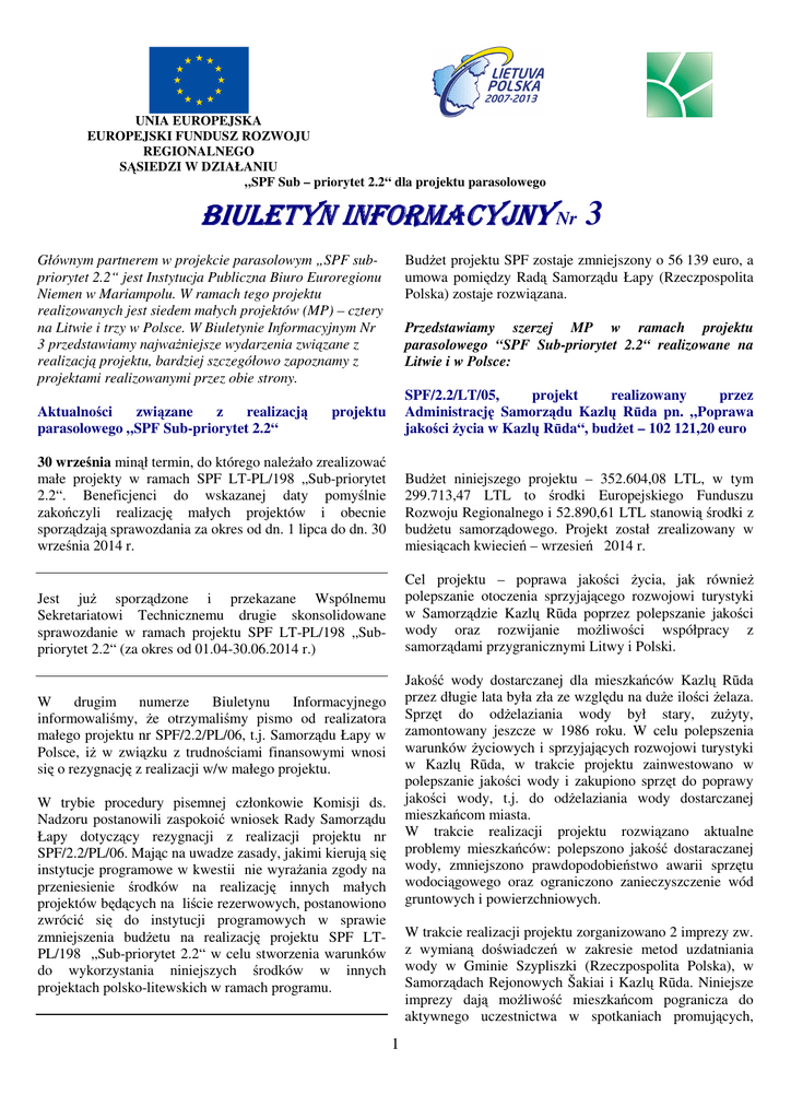 UNIA EUROPEJSKA EUROPEJSKI FUNDUSZ ROZWOJU REGIONALNEGO SĄSIEDZI W DZIAŁANIU „SPF Sub – priorytet 2.2“ dla projektu parasolowego BIULETYN INFORMACYJNY Nr 3 Budżet projektu SPF zostaje zmniejszony o 56 139 euro, a umowa pomiędzy Radą Samorządu Łapy (Rzeczpospolita Polska) zostaje rozwiązana. Głównym partnerem w projekcie parasolowym „SPF subpriorytet 2.2“ jest Instytucja Publiczna Biuro Euroregionu Niemen w Mariampolu. W ramach tego projektu realizowanych jest siedem małych projektów (MP) – cztery na Litwie i trzy w Polsce. W Biuletynie Informacyjnym Nr 3 przedstawiamy najważniejsze wydarzenia związane z realizacją projektu, bardziej szczegółowo zapoznamy z projektami realizowanymi przez obie strony. Aktualności związane z realizacją parasolowego „SPF Sub-priorytet 2.2“ Przedstawiamy szerzej MP w ramach projektu parasolowego “SPF Sub-priorytet 2.2“ realizowane na Litwie i w Polsce: SPF/2.2/LT/05, projekt realizowany przez Administrację Samorządu Kazlų Rūda pn. „Poprawa jakości życia w Kazlų Rūda“, budżet – 102 121,20 euro projektu 30 września minął termin, do którego należało zrealizować małe projekty w ramach SPF LT-PL/198 „Sub-priorytet 2.2“. Beneficjenci do wskazanej daty pomyślnie zakończyli realizację małych projektów i obecnie sporządzają sprawozdania za okres od dn. 1 lipca do dn. 30 września 2014 r. Budżet niniejszego projektu – 352.604,08 LTL, w tym 299.713,47 LTL to środki Europejskiego Funduszu Rozwoju Regionalnego i 52.890,61 LTL stanowią środki z budżetu samorządowego. Projekt został zrealizowany w miesiącach kwiecień – wrzesień 2014 r. Jest już sporządzone i przekazane Wspólnemu Sekretariatowi Technicznemu drugie skonsolidowane sprawozdanie w ramach projektu SPF LT-PL/198 „Subpriorytet 2.2“ (za okres od 01.04-30.06.2014 r.) Cel projektu – poprawa jakości życia, jak również polepszanie otoczenia sprzyjającego rozwojowi turystyki w Samorządzie Kazlų Rūda poprzez polepszanie jakości wody oraz rozwijanie możliwości współpracy z samorządami przygranicznymi Litwy i Polski. Jakość wody dostarczanej dla mieszkańców Kazlų Rūda przez długie lata była zła ze względu na duże ilości żelaza. Sprzęt do odżelaziania wody był stary, zużyty, zamontowany jeszcze w 1986 roku. W celu polepszenia warunków życiowych i sprzyjających rozwojowi turystyki w Kazlų Rūda, w trakcie projektu zainwestowano w polepszanie jakości wody i zakupiono sprzęt do poprawy jakości wody, t.j. do odżelaziania wody dostarczanej mieszkańcom miasta. W trakcie realizacji projektu rozwiązano aktualne problemy mieszkańców: polepszono jakość dostaraczanej wody, zmniejszono prawdopodobieństwo awarii sprzętu wodociągowego oraz ograniczono zanieczyszczenie wód gruntowych i powierzchniowych. W drugim numerze Biuletynu Informacyjnego informowaliśmy, że otrzymaliśmy pismo od realizatora małego projektu nr SPF/2.2/PL/06, t.j. Samorządu Łapy w Polsce, iż w związku z trudnościami finansowymi wnosi się o rezygnację z realizacji w/w małego projektu. W trybie procedury pisemnej członkowie Komisji ds. Nadzoru postanowili zaspokoić wniosek Rady Samorządu Łapy dotyczący rezygnacji z realizacji projektu nr SPF/2.2/PL/06. Mając na uwadze zasady, jakimi kierują się instytucje programowe w kwestii nie wyrażania zgody na przeniesienie środków na realizację innych małych projektów będących na liście rezerwowych, postanowiono zwrócić się do instytucji programowych w sprawie zmniejszenia budżetu na realizację projektu SPF LTPL/198 „Sub-priorytet 2.2“ w celu stworzenia warunków do wykorzystania niniejszych środków w innych projektach polsko-litewskich w ramach programu. W trakcie realizacji projektu zorganizowano 2 imprezy zw. z wymianą doświadczeń w zakresie metod uzdatniania wody w Gminie Szypliszki (Rzeczpospolita Polska), w Samorządach Rejonowych Šakiai i Kazlų Rūda. Niniejsze imprezy dają możliwość mieszkańcom pogranicza do aktywnego uczestnictwa w spotkaniach promujących, 1 UNIA EUROPEJSKA EUROPEJSKI FUNDUSZ ROZWOJU REGIONALNEGO SĄSIEDZI W DZIAŁANIU „SPF Sub – priorytet 2.2“ dla projektu parasolowego dzielenia się doświadczeniami oraz jej pozyskania z instytucji zarządzajacych projektami. Projekt został uwieńczony konferencją podsumowującą, na której przedstawiono osiągnięte wyniki, omówiono sytuację ekologiczną w Samorządach Kazlų Rūda, Rejonu Šakiai oraz Gminy Szypliszki. Po zrealizowaniu działań przewidzianych w projekcie poprawie uległo środowisko i jakość życia mieszkańców Kazlų Rūda, warunki do świadczenia usług hotelarskich. To ma pozytywne bezpośrednie oddziaływanie w promowaniu spójności społecznej. W dn. 17-18 września odbyło się ostatnie spotkanie partnerskie, tj. konferencja na temat dzielenia się dobrą praktyką w zakresie umiejętności rodzicielskich. W konferencji udział wzięło kierownictwo Szkół Podstawowych Nr 4, Nr 6 i Nr 7 w Giżycku, Poradni Psychologiczno-Pedagogicznej, Gimnazjum Nr 1 i Nr 2, Miejski Zespół Obsługi Szkół i Przedszkoli w Giżycku, Filii Biblioteki Pedagogicznej w Giżycku oraz przedstawiciele Szkół Ogólnokształcących Rejonu Varėna, partnerów projektu. Partnerzy z Giżycka i Rejonu Varėna przedstawili zasady partnerstwa między rodziną i szkołą, problemy w zakresie współpracy z rodzicami, osiągnięcia i doświadczenie. Omówiono problemy ogólne w zakresie partnerstwa rodziny i szkoły w obu państwach. SPF/2.2/LT/07, Projekt pn. „Rozwijanie umiejetności rodzicielskich: poszukiwanie dobrych praktyk na Litwie i w Polsce“ realizowany przez Centrum Edukacji w Varėna, budżet - 25 142,74 euro Na konferencji przedstawiono podczas trwania projektu, jest www.pozityvitevyste-projektas.lt. internetowa została utworzona w przez obydwu partnerów oraz własnego doświadczenia. Realizatorem niniejszego projektu jest Centrum Edukacji w Varėna