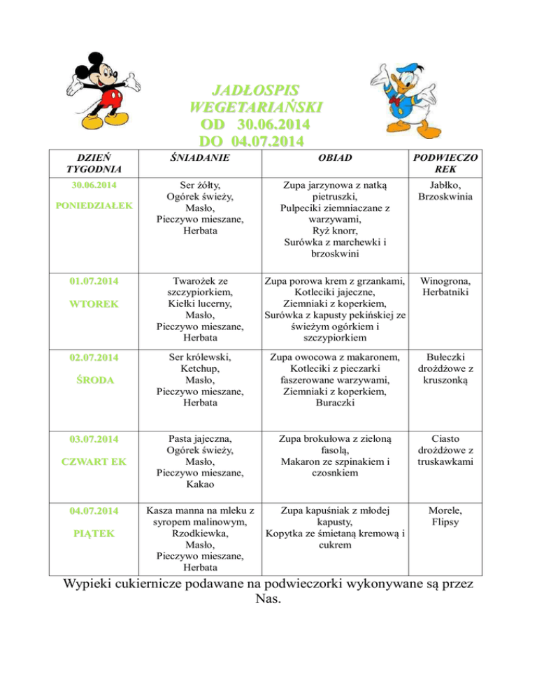 JADŁOSPIS WEGETARIAŃSKI OD 30.06.2014 DO 04.07.2014 DZIEŃ TYGODNIA ŚNIADANIE OBIAD PODWIECZO REK 30.06.2014 Ser żółty, Ogórek świeży, Masło, Pieczywo mieszane, Herbata Zupa jarzynowa z natką pietruszki, Pulpeciki ziemniaczane z warzywami, Ryż knorr, Surówka z marchewki i brzoskwini Jabłko, Brzoskwinia Twarożek ze szczypiorkiem, Kiełki lucerny, Masło, Pieczywo mieszane, Herbata Zupa porowa krem z grzankami, Kotleciki jajeczne, Ziemniaki z koperkiem, Surówka z kapusty pekińskiej ze świeżym ogórkiem i szczypiorkiem Winogrona, Herbatniki Ser królewski, Ketchup, Masło, Pieczywo mieszane, Herbata Zupa owocowa z makaronem, Kotleciki z pieczarki faszerowane warzywami, Ziemniaki z koperkiem, Buraczki Bułeczki drożdżowe z kruszonką Pasta jajeczna, Ogórek świeży, Masło, Pieczywo mieszane, Kakao Zupa brokułowa z zieloną fasolą, Makaron ze szpinakiem i czosnkiem Ciasto drożdżowe z truskawkami Kasza manna na mleku z syropem malinowym, Rzodkiewka, Masło, Pieczywo mieszane, Herbata Zupa kapuśniak z młodej kapusty, Kopytka ze śmietaną kremową i cukrem Morele, Flipsy PONIEDZIAŁEK 01.07.2014 WTOREK 02.07.2014 ŚRODA 03.07.2014 CZWART EK 04.07.2014 PIĄTEK Wypieki cukiernicze podawane na podwieczorki wykonywane są przez Nas.