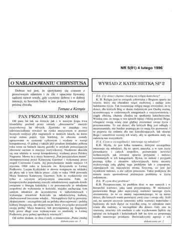 NR 5(91)/1 5(91)/1 PO GÓRACH, DOLINACH... 4 lutego 1996 r. NR 5(91) 4 lutego 1996 O NAŚLADOWANIU NA LADOWANIU CHRYSTUSA Dobrze teŜ jest, Ŝe spotykamy się czasem z przeciwnym zdaniem i Ŝe źle i opacznie bywamy sądzeni nawet wtedy, gdy czynimy dobrze i w dobrej intencji, to bowiem budzi w nas pokorę i broni przed próŜną chwałą. Tomasz a Kempis PAN PRZYJACIELEM MOIM Od paru lat tak na świecie jak i w naszym kraju trwa triumfalny pochód przez estrady „dinozaurów” muzyki rozrywkowej lat 60-tych. Zjawisko to znajduje swe odzwierciedlenie równieŜ na rynku muzycznym w postaci licznych reedycji płyt nagranych w tamtych latach, na które wciąŜ rośnie popyt, tym bardziej, Ŝe obecnie zostały opracowane w systemie cyfrowym i wydane w wersji kompaktowej. O jednej z takich płyt pisałem dokładnie półtora roku temu na łamach naszej gazetki w artykule poruszającym obecność sacrum w muzyce rozrywkowej. Niedawno ukazała się ona właśnie w wersji kompaktowej, wydanej przez Polskie Nagrania. Mowa tu o mszy beatowej „Pan przyjacielem moim” skomponowanej przez Katarzynę Gaertner i wykonanej przez zespół Czerwono Czarni. Jej prawykonanie miało miejsce 14 stycznia 1968 roku w kościele św. Krzysztofa w Leśnej Podkowie. Lucjan Kydryński w słowie wstępnym na wkładce do płyty tak o tym fakcie pisze: „Gdy w roku 1968 powstała Msza beatowa Katarzyny Gaertner, było to wydarzenie nie tylko o czystym artystycznym znaczeniu. Fakt, Ŝe kompozytorka popularnej muzyki młodzieŜowej napisała dzieło związane z liturgią katolicką i Ŝe przeznaczyła je młodemu zespołowi do wykonania w kościele, niejako zachęcając tym samym młodzieŜ do uczestnictwa w naboŜeństwach i wykazując otwartość Kościoła na młodzieŜową kulturę, zbulwersował ówczesne władze... Niewątpliwie był to powaŜny eksperyment - szczególnie jak na polską obyczajowość i polską kulturę liturgiczną, ale eksperyment, który zwycięsko przeszedł swoją próbę: Msza beatowa, lub przynajmniej jej fragmenty były przez długi czas wykonywane co niedzielę w Leśnej Podkowie, przy pełnej aprobacie wiernych”. Od siebie dodam, Ŝe dwa z nich, a mianowicie „Panie zmiłuj dokończenie str. 3 WYWIAD Z KATECHETKĄ SP 2 D.Ł. Czy dzieci chętnie chodzą na religię-katechezę? K. B. Religia jest to związek człowieka z Bogiem oparty na wierze, który ma charakter więzi osobowej i nadaje sens ludzkiemu Ŝyciu. Tak rozumiejąc religię mogę stwierdzić, Ŝe te dzieci, dla których Bóg w domu rodzinnym jest Osobą waŜną, uczestniczącą w codziennych zmaganiach z rzeczywistością i ciągle obecną, chętnie chodzą na spotkania katechetyczne. Wiedzą one, Ŝe mogą w ten sposób lepiej i bliŜej poznać Boga, wbogacić swoją wiarę oraz głębiej zrozumieć swoje Ŝycie i przeznaczenie. Te zaś dzieci, dla których Bóg jest odległy i niezrozumiały, nie bardzo pojmują po co mają Go poznawać. I tu pojawia się zadanie dla nas katechizujących, tak ukazać Boga i umoŜliwić rozwój ich wiary, aby te spotkania stały się radością nas wszystkich. D. Ł. Czym w szczególności interesuje się młodzieŜ? K.B. Myślę, Ŝe jest kilka tematów, którymi szczególnie interesuje się młodzieŜ. Są to: sport, muzyka, a w tym Ŝycie piosenkarzy i całych zespołów, poznawanie nowości technicznych, jak równieŜ sprawa przyjaźni i miłości rozumianych w ich kategoriach. Bywa, Ŝe miłość i przyjaźń poznają tylko z ekranów telewizyjnych, które niestety wykrzywiają całą głębię tego problemu lub z czasopism, zajmujących się najczęściej stroną fizyczną, co jest juŜ wynikiem miłości, a nie całym procesem. Takie podejście do tematu moŜe spowodować późniejsze problemy w Ŝyciu rodzinnym. D.Ł. W czym tkwi problem? K.B. Przypuszczam, Ŝe problem tkwi w nas samych i w hierarchii wartości, jaką sami przyjmujemy. W momencie postawienia Boga jako najwyŜszej wartości naszego Ŝycia zrozumiemy, Ŝe to co mamy najcenniejszego, to są nasze dzieci, dla których warto poświęcić swój czas i swoje siły. Jeśli zaś, na samym szczycie ustawimy sobie wartości materialne i będziemy do nich dąŜyć za wszelką cenę, to zabraknie nam czasu dla rodziny, a szczególnie dla dzieci. Gdy one to zauwaŜą, stracimy ich zaufanie a całe wychowanie będzie się opierać na kolegach i koleŜankach lub na tym co proponują środki masowego przekazu. Doświadczymy agresji z ich dokończenie str. 2 4 lutego 1996 r. PO GÓRACH, DOLINACH... GENEZA POLSKIEGO HARCERSTWA W USTRONIU CZ. II Po tej pierwszej prezentacji chętnych do wstąpienia w szeregi harcerstwa było coraz więcej. KaŜda zbiórka gromadziła coraz to nowych poglądaczyochotników. KaŜdy z naszej grupy ukończył jakiś kurs lub nawet kilka. Wykładowcami byli instruktorzy z Ośrodka Szkolenia Kadr Harcerskich na Buczu koło Górek, z Cieszyna, Bielska a nawet z Komendy Chorągwi w Katowicach. I tak z małego zaląŜka powstała „I DruŜyna Harcerska im. Tadeusza Kościuszki”. Kadra złoŜyła przyrzeczenie harcerskie na wierność Ojczyźnie i Prawu Harcerskiemu. Była to chwila do dziś nie zapomniana. W kręgu złączonych rąk na leśnej polanie pod Małą Czantorią, przy blasku płonącego ogniska śpiewaliśmy „Wszystko, co nasze, Polsce oddamy...” Przez całą noc okupacji i hitlerowskiego terroru wymowa tych słów nabrała szczególnego znaczenia. Garnęli się do nas chłopcy w wieku od lat 8 do 14, rozrastały się nasze szeregi. Byliśmy oszołomieni i mile zaskoczeni. Czy zadowolimy ich marzenia? Kształcmy przede wszystkim samych siebie. Jedźmy na kursy, rajdy, zloty, obozy. Wysyłamy młodych na coraz to nowe zajęcia szkoleniowe. Powstaje zuchowa druŜyna dla najmłodszych, krąg starszoharcerski i druga druŜyna. Nad całością sprawuje pieczę samorzutnie zorganizowana przez rodziców i opiekunów, moŜniejszych mecenasów „ Koło Przyjaciół Harcerstwa”, któremu przewo