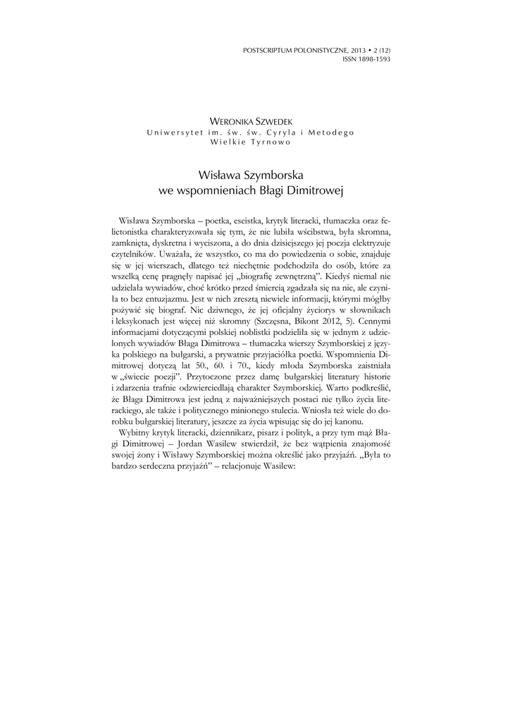 POSTSCRIPTUM POLONISTYCZNE, 2013 • 2 (12) ISSN 1898-1593 WERONIKA SZWEDEK Uniwersytet im. św. św. Cyryla i Metodego Wielkie Tyrnowo Wisława Szymborska we wspomnieniach Błagi Dimitrowej Wisława Szymborska – poetka, eseistka, krytyk literacki, tłumaczka oraz felietonistka charakteryzowała się tym, że nie lubiła wścibstwa, była skromna, zamknięta, dyskretna i wyciszona, a do dnia dzisiejszego jej poezja elektryzuje czytelników. Uważała, że wszystko, co ma do powiedzenia o sobie, znajduje się w jej wierszach, dlatego też niechętnie podchodziła do osób, które za wszelką cenę pragnęły napisać jej „biografię zewnętrzną”. Kiedyś niemal nie udzielała wywiadów, choć krótko przed śmiercią zgadzała się na nie, ale czyniła to bez entuzjazmu. Jest w nich zresztą niewiele informacji, którymi mógłby pożywić się biograf. Nic dziwnego, że jej oficjalny życiorys w słownikach i leksykonach jest więcej niż skromny (Szczęsna, Bikont 2012, 5). Cennymi informacjami dotyczącymi polskiej noblistki podzieliła się w jednym z udzielonych wywiadów Błaga Dimitrowa – tłumaczka wierszy Szymborskiej z języka polskiego na bułgarski, a prywatnie przyjaciółka poetki. Wspomnienia Dimitrowej dotyczą lat 50., 60. i 70., kiedy młoda Szymborska zaistniała w „świecie poezji”. Przytoczone przez damę bułgarskiej literatury historie i zdarzenia trafnie odzwierciedlają charakter Szymborskiej. Warto podkreślić, że Błaga Dimitrowa jest jedną z najważniejszych postaci nie tylko życia literackiego, ale także i politycznego minionego stulecia. Wniosła też wiele do dorobku bułgarskiej literatury, jeszcze za życia wpisując się do jej kanonu. Wybitny krytyk literacki, dziennikarz, pisarz i polityk, a przy tym mąż Błagi Dimitrowej – Jordan Wasilew stwierdził, że bez wątpienia znajomość swojej żony i Wisławy Szymborskiej można określić jako przyjaźń. „Była to bardzo serdeczna przyjaźń” – relacjonuje Wasilew: 280 POSTSCRIPTUM POLONISTYCZNE, 2013 • 2 (12) Poetki miały ze sobą stały kontakt, tłumaczyły swoje utwory. Pamiętam, że wysyłały wzajemnie do siebie swoje dzieła. Błaga powieści, a Wisława nowe tomiki literackie. Z tym, że Błaga najczęściej prosiła Szymborską o przesłanie jej nowego dzieła. Po przeczytaniu utworów pisarek można zauważyć, jak bardzo się różniły. Jednak to nie przeszkadzało w ich relacjach. (…) Styl pisania Szymborskiej był uproszczony i skonkretyzowany, co nie oznacza, że jej utwory są łatwe do analizy. Proszę pamiętać, że uproszczony a łatwy są to dwa różne pojęcia. Z kolei Błaga pisała w sposób nieco bardziej złożony. (…) Poznały się w Polsce, bo tam bardzo często jeździła moja żona. I ja również jeden raz byłem z nią w Krakowie. Wtedy poznałem Wisławę, siedzieliśmy przy stoliku, piliśmy kawę, tak jak my teraz. Pamiętam, że była bardzo cicha, spokojna, wręcz małomówna (materiały własne). Sama Dimitrowa wspomina, że na początku lat 50. poznała w Polsce młodą poetkę, która właśnie wydała swój pierwszy tomik poezji Dlatego żyjemy. Nie wiedziała wtedy, że znajdzie się ona w gronie największych poetów naszych czasów. Po powrocie do kraju zainteresowała się twórczością Szymborskiej i przetłumaczyła kilka z jej wczesnych wierszy. Wkrótce na zaproszenie bułgarskiej poetki Wisława przyjechała do Bułgarii. Zgodnie z ówczesnym zwyczajem odwiedzający nasz kraj goście zagraniczni musieli jak najwięcej zobaczyć (…), co ich kompletnie wycieńczało – relacjonuje Dimitrowa. Uprzejmie podporządkowywali się przygotowanemu programowi, słuchali i kiwali głowami, nie bardzo w końcu zdając sobie sprawę, dokąd ich wieziemy i co im każemy oglądać. Wisława z rozbrajającą szczerością przeciwstawiła się temu, wywracając do góry nogami cały scenariusz. Najczęściej podróżowałyśmy samochodem, nocą, pokonując wąskie, wyboiste szosy. Pamiętam, jak zanosiła się śmiechem, utyskując na owe nocne przygody: „Kto mnie okłamał, że Bułgaria jest małym krajem? Jedziemy i jedziemy, a końca nie widać!” I ciągle pytała: „Jeszcze nie przyjechaliśmy? A może w tych ciemnościach minęliśmy granicę i teraz nas niesie Bóg wie dokąd?” Po całonocnym trzęsieniu się w samochodzie zatrzymywałyśmy się w jakimś prowincjonalnym sennym hoteliku. Szybkie śniadanie i oczywiście kawa po turecku. Wówczas ja, prowokowana figlarnym uśmiechem Wisławy, zaczynałam jej wróżyć z fusów: sukcesy, nagrody za poezję ale to jej wcale nie interesowało. Z ciekawością wpatrywała się w hieroglify na dnie filiżanki. Przypadkowo wtrącone ogólnikowe sformułowanie „zmiana w życiu” rozbawiło ją do łez, ale zarazem zaintrygowało. Potem aż do końca pobytu w Bułgarii powtarzała jak zaklęcie: „Zmiana w życiu, zmiana w życiu”, niby to żartem, ale tak, jakby rzeczywiście oczekiwała jakiejś decydującej zmiany (Dimitrowa 2000, 18). WERONIKA SZWEDEK: Wisława Szymborska we wspomnieniach Błagi Dimitrowej 281 Szymborska, odlatując z Bułgarii, z lotniska w Sofii i żegnając się z Błagą, zawołała: „Zmiana w życiu!” (Dimitrowa 2000, 18). Przepowiednia Dimitrowej, choć wypowiedziana żartem, spełniła się. Po czterdziestu latach, dokładnie 3 października 1996 r., w pierwszy czwartek miesiąca, jak nakazuje tradycja, Akademia Szwedzka przyznała Wisławie Szymborskiej Nagrodę Nobla w dziedzinie literatury. W uzasadnieniu tej decyzji napisano, że nagrodzono „poezję, która z ironiczną precyzją pozwala wydobyć historyczny i biologiczny kontekst fragmentów ludzkiej rzeczywistości” (Zeler 1996, 7). Szymborska jako poetka była realistką, rzeczową i antymetafizyczną. Niezwykle ostrożna i dyskretna, nieskładająca łatwych deklaracji. Unikała patosu jak ognia, wybierała przeważnie buffo niż serio, lubiła żart oraz ironię. Była osobą do