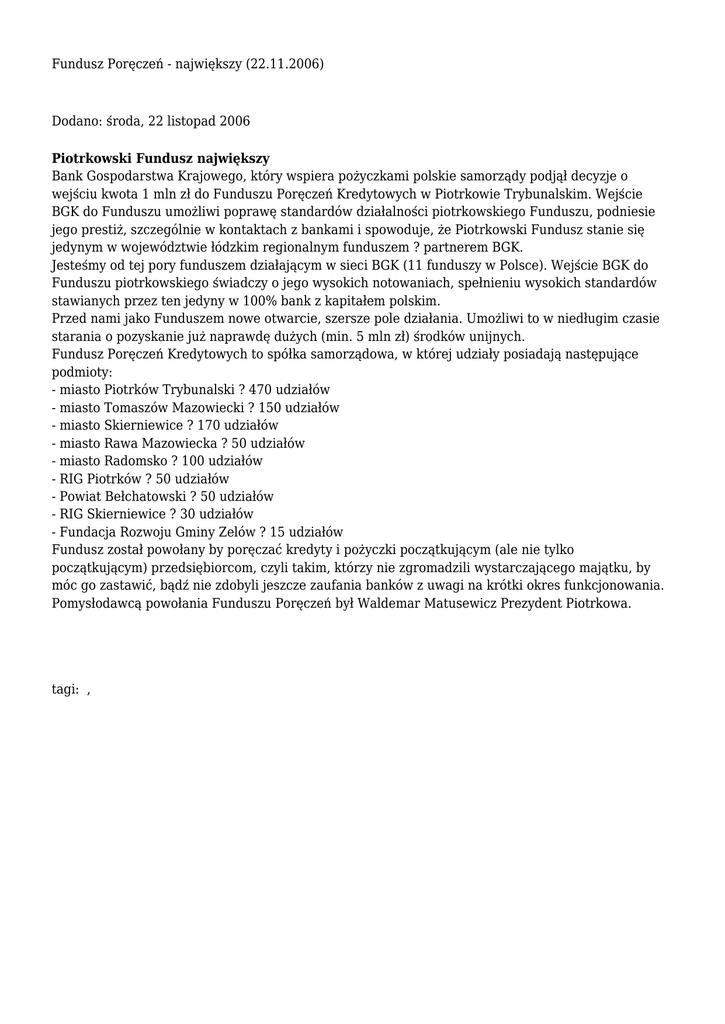 Fundusz Poręczeń - największy (22.11.2006) Dodano: środa, 22 listopad 2006 Piotrkowski Fundusz największy Bank Gospodarstwa Krajowego, który wspiera pożyczkami polskie samorządy podjął decyzje o wejściu kwota 1 mln zł do Funduszu Poręczeń Kredytowych w Piotrkowie Trybunalskim. Wejście BGK do Funduszu umożliwi poprawę standardów działalności piotrkowskiego Funduszu, podniesie jego prestiż, szczególnie w kontaktach z bankami i spowoduje, że Piotrkowski Fundusz stanie się jedynym w województwie łódzkim regionalnym funduszem ? partnerem BGK. Jesteśmy od tej pory funduszem działającym w sieci BGK (11 funduszy w Polsce). Wejście BGK do Funduszu piotrkowskiego świadczy o jego wysokich notowaniach, spełnieniu wysokich standardów stawianych przez ten jedyny w 100% bank z kapitałem polskim. Przed nami jako Funduszem nowe otwarcie, szersze pole działania. Umożliwi to w niedługim czasie starania o pozyskanie już naprawdę dużych (min. 5 mln zł) środków unijnych. Fundusz Poręczeń Kredytowych to spółka samorządowa, w której udziały posiadają następujące podmioty: - miasto Piotrków Trybunalski ? 470 udziałów - miasto Tomaszów Mazowiecki ? 150 udziałów - miasto Skierniewice ? 170 udziałów - miasto Rawa Mazowiecka ? 50 udziałów - miasto Radomsko ? 100 udziałów - RIG Piotrków ? 50 udziałów - Powiat Bełchatowski ? 50 udziałów - RIG Skierniewice ? 30 udziałów - Fundacja Rozwoju Gminy Zelów ? 15 udziałów Fundusz został powołany by poręczać kredyty i pożyczki początkującym (ale nie tylko początkującym) przedsiębiorcom, czyli takim, którzy nie zgromadzili wystarczającego majątku, by móc go zastawić, bądź nie zdobyli jeszcze zaufania banków z uwagi na krótki okres funkcjonowania. Pomysłodawcą powołania Funduszu Poręczeń był Waldemar Matusewicz Prezydent Piotrkowa. tagi: ,