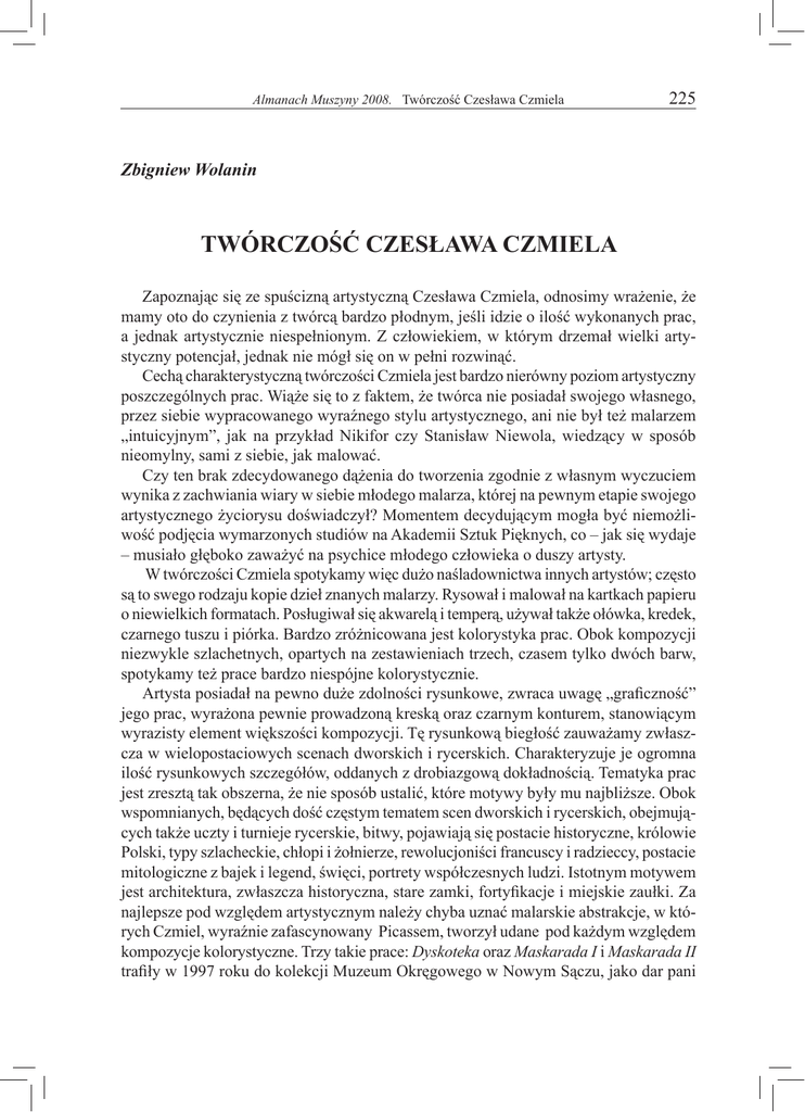 Almanach Muszyny 2008. Twórczość Czesława Czmiela 225 Zbigniew Wolanin TWÓRCZOŚĆ CZESŁAWA CZMIELA Zapoznając się ze spuścizną artystyczną Czesława Czmiela, odnosimy wrażenie, że mamy oto do czynienia z twórcą bardzo płodnym, jeśli idzie o ilość wykonanych prac, a jednak artystycznie niespełnionym. Z człowiekiem, w którym drzemał wielki artystyczny potencjał, jednak nie mógł się on w pełni rozwinąć. Cechą charakterystyczną twórczości Czmiela jest bardzo nierówny poziom artystyczny poszczególnych prac. Wiąże się to z faktem, że twórca nie posiadał swojego własnego, przez siebie wypracowanego wyraźnego stylu artystycznego, ani nie był też malarzem „intuicyjnym”, jak na przykład Nikifor czy Stanisław Niewola, wiedzący w sposób nieomylny, sami z siebie, jak malować. Czy ten brak zdecydowanego dążenia do tworzenia zgodnie z własnym wyczuciem wynika z zachwiania wiary w siebie młodego malarza, której na pewnym etapie swojego artystycznego życiorysu doświadczył? Momentem decydującym mogła być niemożliwość podjęcia wymarzonych studiów na Akademii Sztuk Pięknych, co – jak się wydaje – musiało głęboko zaważyć na psychice młodego człowieka o duszy artysty. W twórczości Czmiela spotykamy więc dużo naśladownictwa innych artystów; często są to swego rodzaju kopie dzieł znanych malarzy. Rysował i malował na kartkach papieru o niewielkich formatach. Posługiwał się akwarelą i temperą, używał także ołówka, kredek, czarnego tuszu i piórka. Bardzo zróżnicowana jest kolorystyka prac. Obok kompozycji niezwykle szlachetnych, opartych na zestawieniach trzech, czasem tylko dwóch barw, spotykamy też prace bardzo niespójne kolorystycznie. Artysta posiadał na pewno duże zdolności rysunkowe, zwraca uwagę „graficzność” jego prac, wyrażona pewnie prowadzoną kreską oraz czarnym konturem, stanowiącym wyrazisty element większości kompozycji. Tę rysunkową biegłość zauważamy zwłaszcza w wielopostaciowych scenach dworskich i rycerskich. Charakteryzuje je ogromna ilość rysunkowych szczegółów, oddanych z drobiazgową dokładnością. Tematyka prac jest zresztą tak obszerna, że nie sposób ustalić, które motywy były mu najbliższe. Obok wspomnianych, będących dość częstym tematem scen dworskich i rycerskich, obejmujących także uczty i turnieje rycerskie, bitwy, pojawiają się postacie historyczne, królowie Polski, typy szlacheckie, chłopi i żołnierze, rewolucjoniści francuscy i radzieccy, postacie mitologiczne z bajek i legend, święci, portrety współczesnych ludzi. Istotnym motywem jest architektura, zwłaszcza historyczna, stare zamki, fortyfikacje i miejskie zaułki. Za najlepsze pod względem artystycznym należy chyba uznać malarskie abstrakcje, w których Czmiel, wyraźnie zafascynowany Picassem, tworzył udane pod każdym względem kompozycje kolorystyczne. Trzy takie prace: Dyskoteka oraz Maskarada I i Maskarada II trafiły w 1997 roku do kolekcji Muzeum Okręgowego w Nowym Sączu, jako dar pani 226 Zbigniew Wolanin Heleny Jarosz z Muszyny. Prace te zaprezentowane zostały na wielkiej wystawie „Talent Pasja Intuicja II – polskie malarstwo nieprofesjonalne 1945–2005”, w części ekspozycji prezentowanej w Muzeum Nikifora w Krynicy od grudnia 2005 do marca 2006. Należy żałować, że okoliczności życiowe uniemożliwiły pełną artystyczną ewolucję Czesława Czmiela w dojrzałego, świadomego twórcę, do czego z pewnością predysponował go posiadany wrodzony talent, jaki dostrzegamy w wielu obrazach, które pozostawił. Autoportret Czesława Czmiela (1989 r.) Almanach Muszyny 2008. Twórczość Czesława Czmiela 1 2 4 1. Scena dworska 2. Huzar z koniem 3. Portrecik 4. Król Zygmunt Stary 5. Scena szlachecka – kolor 6. Scena szlachecka – czarno-biała 7. Rycerz w zbroi 3 5 6 7 227 228 Zbigniew Wolanin 9 8 10 11 12 8. Kościół w Muszynie 9. Barbakan i Brama Floriańska 10. Wiśnicz 11. Cerkiew w Powroźniku 12. Fortyfikacje 13. Cerkiewka 13 Almanach Muszyny 2008. Twórczość Czesława Czmiela 229 14 15 14. ÷ 18. Obrazki abstrakcyjne 19. Jednorożec 20. Dzbanek 16 17 19 20 18 230 Zbigniew Wolanin 21 21. Pejzaż morski ze statkiem 22. Wietnamska dziewczyna 23. Ptaki 24. Święta Rodzina (ołówek, na wzór drzeworytu) 25. Kot na parapecie i ptak 22 26. Kwiaty 24 23 25 Wszystkie prezentowane prace są własnością rodziny Cz. Czmiela. Reprodukcje: Juliusz Jarończyk, Renata Kopacz, Jarosław Hans 26