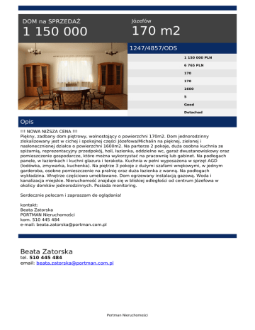 Józefów DOM na SPRZEDAŻ 170 m2 1 150 000 1247/4857/ODS 1 150 000 PLN 6 765 PLN 170 170 1600 5 Good Detached Opis !!! NOWA NIŻSZA CENA !!! Piękny, zadbany dom piętrowy, wolnostojący o powierzchni 170m2. Dom jednorodzinny zlokalizowany jest w cichej i spokojnej części Józefowa/Michalin na pięknej, zielonej i nasłonecznionej działce o powierzchni 1600m2. Na parterze 2 pokoje, duża osobna kuchnia ze spiżarnią, reprezentacyjny przedpokój, holl, łazienka, oddzielne wc, garaż dwustanowiskowy oraz pomieszczenie gospodarcze, które można wykorzystać na pracownię lub gabinet. Na podłogach panele, w łazienkach i kuchni glazura i terakota. Kuchnia w pełni wyposażona w sprzęt AGD (lodówka, zmywarka, kuchenka). Na piętrze 3 pokoje z dużymi szafami wnękowymi, w jednym garderoba, osobne pomieszczenie na pralnię oraz duża łazienka z wanną. Na podłogach wykładzina. Wnętrze częściowo umeblowane. Dom ogrzewany instalacją gazową. Woda i kanalizacja miejskie. Nieruchomość znajduje się w bliskiej odległości od centrum Józefowa w okolicy domków jednorodzinnych. Posiada monitoring. Serdecznie polecam i zapraszam do oglądania! kontakt: Beata Zatorska PORTMAN Nieruchomości kom. 510 445 484 e-mail: [email protected] Beata Zatorska tel. 510 445 484 email: [email protected] Portman Nieruchomości Powered by TCPDF (www.tcpdf.org)
