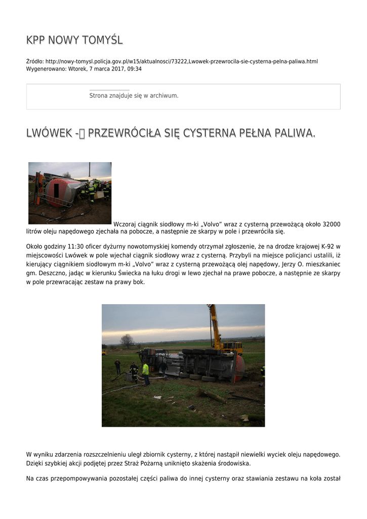 KPP NOWY TOMYŚL Źródło: http://nowy-tomysl.policja.gov.pl/w15/aktualnosci/73222,Lwowek-przewrocila-sie-cysterna-pelna-paliwa.html Wygenerowano: Wtorek, 7 marca 2017, 09:34 Strona znajduje się w archiwum. LWÓWEK - PRZEWRÓCIŁA SIĘ CYSTERNA PEŁNA PALIWA. Wczoraj ciągnik siodłowy m-ki „Volvo” wraz z cysterną przewożącą około 32000 litrów oleju napędowego zjechała na pobocze, a następnie ze skarpy w pole i przewróciła się. Około godziny 11:30 oficer dyżurny nowotomyskiej komendy otrzymał zgłoszenie, że na drodze krajowej K-92 w miejscowości Lwówek w pole wjechał ciągnik siodłowy wraz z cysterną. Przybyli na miejsce policjanci ustalili, iż kierujący ciągnikiem siodłowym m-ki „Volvo” wraz z cysterną przewożącą olej napędowy, Jerzy O. mieszkaniec gm. Deszczno, jadąc w kierunku Świecka na łuku drogi w lewo zjechał na prawe pobocze, a następnie ze skarpy w pole przewracając zestaw na prawy bok. W wyniku zdarzenia rozszczelnieniu uległ zbiornik cysterny, z której nastąpił niewielki wyciek oleju napędowego. Dzięki szybkiej akcji podjętej przez Straż Pożarną uniknięto skażenia środowiska. Na czas przepompowywania pozostałej części paliwa do innej cysterny oraz stawiania zestawu na koła został wstrzymany ruch na tym odcinku. Funkcjonariusze Sekcji Ruchu Drogowego nowotomyskiej komendy, wyznaczyli objazd na który kierowali pojazdy. Badanie na zawartość alkoholu w wydychanym powietrzu u kierującego dało wynik negatywny. Sprawcę tego zdarzenia Jerzego O. ukarano mandatem karnym. Z uwagi na ciężar zestawu i przewożone paliwo akcja trwała do późnych godzin wieczornych. Ocena: 0/5 (0) Tweetnij