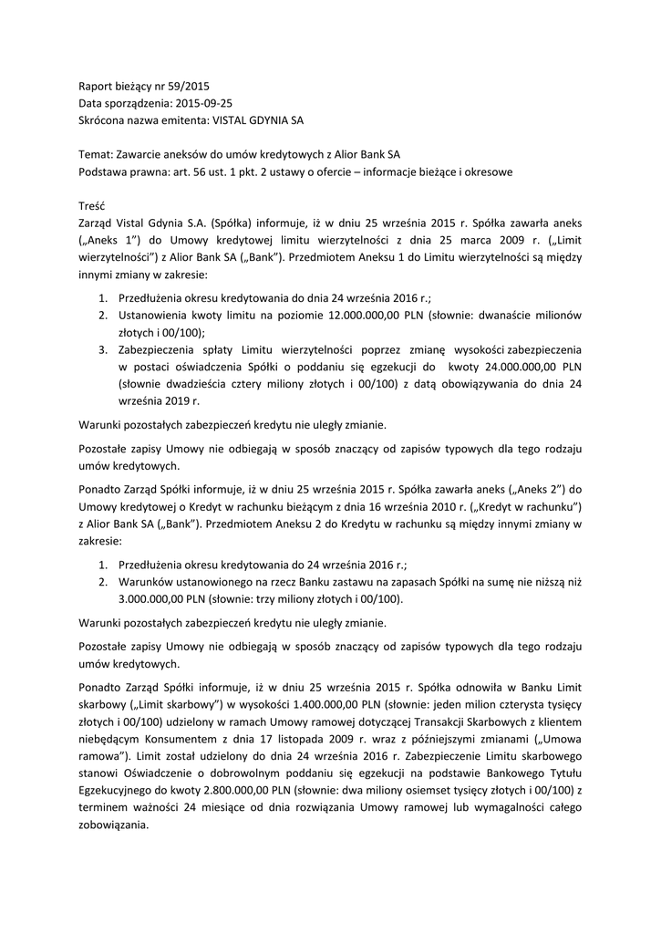 Raport bieżący nr 59/2015 Data sporządzenia: 2015-09-25 Skrócona nazwa emitenta: VISTAL GDYNIA SA Temat: Zawarcie aneksów do umów kredytowych z Alior Bank SA Podstawa prawna: art. 56 ust. 1 pkt. 2 ustawy o ofercie – informacje bieżące i okresowe Treść Zarząd Vistal Gdynia S.A. (Spółka) informuje, iż w dniu 25 września 2015 r. Spółka zawarła aneks („Aneks 1”) do Umowy kredytowej limitu wierzytelności z dnia 25 marca 2009 r. („Limit wierzytelności”) z Alior Bank SA („Bank”). Przedmiotem Aneksu 1 do Limitu wierzytelności są między innymi zmiany w zakresie: 1. Przedłużenia okresu kredytowania do dnia 24 września 2016 r.; 2. Ustanowienia kwoty limitu na poziomie 12.000.000,00 PLN (słownie: dwanaście milionów złotych i 00/100); 3. Zabezpieczenia spłaty Limitu wierzytelności poprzez zmianę wysokości zabezpieczenia w postaci oświadczenia Spółki o poddaniu się egzekucji do kwoty 24.000.000,00 PLN (słownie dwadzieścia cztery miliony złotych i 00/100) z datą obowiązywania do dnia 24 września 2019 r. Warunki pozostałych zabezpieczeń kredytu nie uległy zmianie. Pozostałe zapisy Umowy nie odbiegają w sposób znaczący od zapisów typowych dla tego rodzaju umów kredytowych. Ponadto Zarząd Spółki informuje, iż w dniu 25 września 2015 r. Spółka zawarła aneks („Aneks 2”) do Umowy kredytowej o Kredyt w rachunku bieżącym z dnia 16 września 2010 r. („Kredyt w rachunku”) z Alior Bank SA („Bank”). Przedmiotem Aneksu 2 do Kredytu w rachunku są między innymi zmiany w zakresie: 1. Przedłużenia okresu kredytowania do 24 września 2016 r.; 2. Warunków ustanowionego na rzecz Banku zastawu na zapasach Spółki na sumę nie niższą niż 3.000.000,00 PLN (słownie: trzy miliony złotych i 00/100). Warunki pozostałych zabezpieczeń kredytu nie uległy zmianie. Pozostałe zapisy Umowy nie odbiegają w sposób znaczący od zapisów typowych dla tego rodzaju umów kredytowych. Ponadto Zarząd Spółki informuje, iż w dniu 25 września 2015 r. Spółka odnowiła w Banku Limit skarbowy („Limit skarbowy”) w wysokości 1.400.000,00 PLN (słownie: jeden milion czterysta tysięcy złotych i 00/100) udzielony w ramach Umowy ramowej dotyczącej Transakcji Skarbowych z klientem niebędącym Konsumentem z dnia 17 listopada 2009 r. wraz z późniejszymi zmianami („Umowa ramowa”). Limit został udzielony do dnia 24 września 2016 r. Zabezpieczenie Limitu skarbowego stanowi Oświadczenie o dobrowolnym poddaniu się egzekucji na podstawie Bankowego Tytułu Egzekucyjnego do kwoty 2.800.000,00 PLN (słownie: dwa miliony osiemset tysięcy złotych i 00/100) z terminem ważności 24 miesiące od dnia rozwiązania Umowy ramowej lub wymagalności całego zobowiązania. Pozostałe zapisy Umowy nie odbiegają w sposób znaczący od zapisów typowych dla tego dla tego rodzaju umów. Wartość zawartych umów z Bankiem przekracza 10% kapitałów własnych Emitenta i tym samym spełnia kryterium umowy znaczącej.