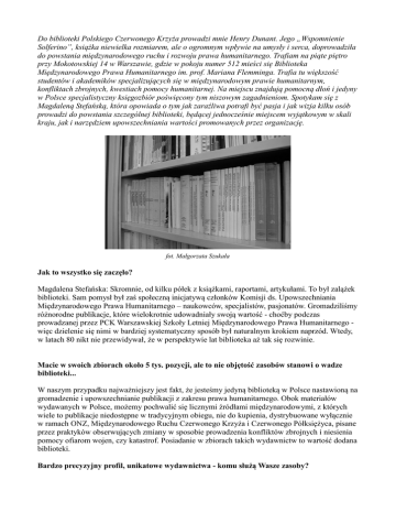 Do biblioteki Polskiego Czerwonego Krzyża prowadzi mnie Henry Dunant. Jego „Wspomnienie Solferino”, książka niewielka rozmiarem, ale o ogromnym wpływie na umysły i serca, doprowadziła do powstania międzynarodowego ruchu i rozwoju prawa humanitarnego. Trafiam na piąte piętro przy Mokotowskiej 14 w Warszawie, gdzie w pokoju numer 512 mieści się Biblioteka Międzynarodowego Prawa Humanitarnego im. prof. Mariana Flemminga. Trafia tu większość studentów i akademików specjalizujących się w międzynarodowym prawie humanitarnym, konfliktach zbrojnych, kwestiach pomocy humanitarnej. Na miejscu znajdują pomocną dłoń i jedyny w Polsce specjalistyczny księgozbiór poświęcony tym niszowym zagadnieniom. Spotykam się z Magdaleną Stefańską, która opowiada o tym jak zaraźliwa potrafi być pasja i jak wizja kilku osób prowadzi do powstania szczególnej biblioteki, będącej jednocześnie miejscem wyjątkowym w skali kraju, jak i narzędziem upowszechniania wartości promowanych przez organizację. fot. Małgorzata Szukała Jak to wszystko się zaczęło? Magdalena Stefańska: Skromnie, od kilku półek z książkami, raportami, artykułami. To był zalążek biblioteki. Sam pomysł był zaś społeczną inicjatywą członków Komisji ds. Upowszechniania Międzynarodowego Prawa Humanitarnego – naukowców, specjalistów, pasjonatów. Gromadziliśmy różnorodne publikacje, które wielokrotnie udowadniały swoją wartość - choćby podczas prowadzanej przez PCK Warszawskiej Szkoły Letniej Międzynarodowego Prawa Humanitarnego więc dzielenie się nimi w bardziej systematyczny sposób był naturalnym krokiem naprzód. Wtedy, w latach 80 nikt nie przewidywał, że w perspektywie lat biblioteka aż tak się rozwinie. Macie w swoich zbiorach około 5 tys. pozycji, ale to nie objętość zasobów stanowi o wadze biblioteki... W naszym przypadku najważniejszy jest fakt, że jesteśmy jedyną biblioteką w Polsce nastawioną na gromadzenie i upowszechnianie publikacji z zakresu prawa humanitarnego. Obok materiałów wydawanych w Polsce, możemy pochwalić się licznymi źródłami międzynarodowymi, z których wiele to publikacje niedostępne w tradycyjnym obiegu, nie do kupienia, dystrybuowane wyłącznie w ramach ONZ, Międzynarodowego Ruchu Czerwonego Krzyża i Czerwonego Półksiężyca, pisane przez praktyków obserwujących zmiany w sposobie prowadzenia konfliktów zbrojnych i niesienia pomocy ofiarom wojen, czy katastrof. Posiadanie w zbiorach takich wydawnictw to wartość dodana biblioteki. Bardzo precyzyjny profil, unikatowe wydawnictwa - komu służą Wasze zasoby? Prawem humanitarnym interesują się prawnicy, politolodzy, nawet ekonomiści analizujący chociażby wpływ kryzysów humanitarnych na gospodarkę światową. Trafiają do nas studenci, pracownicy naukowi, specjaliści i praktycy zajmujący się w swojej pracy tematyką prawa humanitarnego. Nie mamy dostępu do oficjalnych informacji z uczelni o tym, ile osób w pracach licencjackich, magisterskich, czy doktorskich podejmuje te zagadnienia. Ponieważ jednak większość akademików, profesorów prawa międzynarodowego interesujących się prawem humanitarnym, to jednocześnie członkowie wspomnianej już komisji, od nich dowiadujemy się, gdy studenci piszą o promowanych przez nas zagadnieniach. Myślę, że ponad 75 procent tych studentów na jakimś etapie pracy znajduje drogę do naszej biblioteki. Czy obserwujesz wzrost zainteresowania prawem humanitarnym na polskich uczelniach? Tak i najlepiej widać ten proces na przykładzie konkursu prac licencjackich, magisterskich i doktorskich im. prof. Remigiusza Bierzanka, który organizujemy od 18 lat. Kiedy konkurs startował, spływało kilka prac, a działka humanitarna była działką niszową. W Polsce specjalistów i znawców międzynarodowego prawa humanitarnego było niewielu, co przekładało się na nieliczną grupę studentów, którzy chcieli się taką tematyką zajmować. Prace konkursowe były dalece niedoskonałe, ale i tak zasługiwały na wyróżnienie, bo pomagały upowszechniać prawo humanitarne. Od kilku lat widać coraz większe zainteresowanie konkursem, co oznacza, że temat żyje, jest mocniej obecny w środowisku akademickim. Nastąpił też niebywały skok, jeśli chodzi o jakość prac konkursowych – teraz jest to rywalizacja ściśle merytoryczna: kto wybrał ciekawszy temat, jak do niego podszedł. Ludzie poszukują tych trendów, motywów, które dopiero się przebijają, np.: tematyka dronów. W jaki sposób pomagacie młodym naukowcom i pasjonatom? Pierwszy sposób to kontakt telefoniczny – rozmawiamy o tematyce pracy dyplomowej, sprawdzamy znajomość międzynarodowego prawa publicznego, bo poziom wiedzy z tego zakresu jest ważnym wyznacznikiem gotowości do wejścia w przepisy prawa humanitarnego. Pomagamy w doborze literatury, kompilacji bibliografii. Często studenci przychodzą z gotowym planem pracy z prośbą o konsultacje. Zawsze staramy się doradzić, pomóc scalić pracę. A jak można skorzystać z zasobów biblioteki? Udostępniamy je czytelnikom jak tylko możemy. Część materiałów mamy w wersji elektronicznej i jesteśmy gotowi wysłać je e-mailem. Często są to teksty powszechnie dostępne na stronach organizacji międzynarodowych, ONZ, Federacji Stowarzyszeń Czerwonego Krzyża i Czerwonego Półksiężyca, ale my je mamy na miejscu, znamy ich zawartość, jesteśmy w stanie podpowiedzieć, z których materiałów warto skorzystać, bo na przykład są pisane przez praktyków. Aby zapoznać się z publikacjami tradycyjnymi, papierowymi, trzeba nas odwiedzić osobiście. Wydawnictwa, które mamy w większej ilości wypożyczamy na 2-4 tygodnie, unikatowe publikacje udostępniamy na miejscu – można zrobić notatki, nawet sfotografować wybrane fragmenty. Z pojedynczymi wydaniami raczej nie chcemy się rozstawać, bo to zasoby, które trudno by było odtworzyć. fot. Agata Szczotka-Sarna Czy w