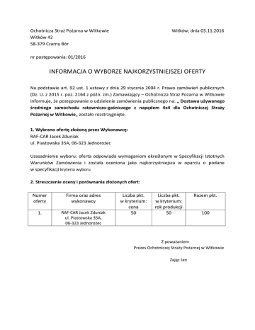 Ochotnicza Straż Pożarna w Witkowie Witków 42 58-379 Czarny Bór Witków; dnia 03.11.2016 nr postępowania: 01/2016 INFORMACJA O WYBORZE NAJKORZYSTNIEJSZEJ OFERTY Na podstawie art. 92 ust. 1 ustawy z dnia 29 stycznia 2004 r. Prawo zamówień publicznych (Dz. U. z 2015 r. poz. 2164 z późn. zm.) Zamawiający – Ochotnicza Straż Pożarna w Witkowie informuje, że postępowanie o udzielenie zamówienia publicznego na: „ Dostawa używanego średniego samochodu ratowniczo-gaśniczego z napędem 4x4 dla Ochotniczej Straży Pożarnej w Witkowie„ zostało rozstrzygnięte. 1. Wybrano ofertę złożoną przez Wykonawcę: RAF-CAR Jacek Zduniak ul. Piastowska 35A, 06-323 Jednorożec Uzasadnienie wyboru: oferta odpowiada wymaganiom określonym w Specyfikacji Istotnych Warunków Zamówienia i została oceniona jako najkorzystniejsza w oparciu o podane w specyfikacji kryteria wyboru 2. Streszczenie oceny i porównania złożonych ofert: Numer oferty Firma oraz adres wykonawcy 1. RAF-CAR Jacek Zduniak ul. Piastowska 35A, 06-323 Jednorożec Liczba pkt. w kryterium: cena 50 Liczba pkt. w kryterium: rok produkcji 50 Razem pkt. 100 Z poważaniem Prezes Ochotniczej Straży Pożarnej w Witkowie Zając Jan
