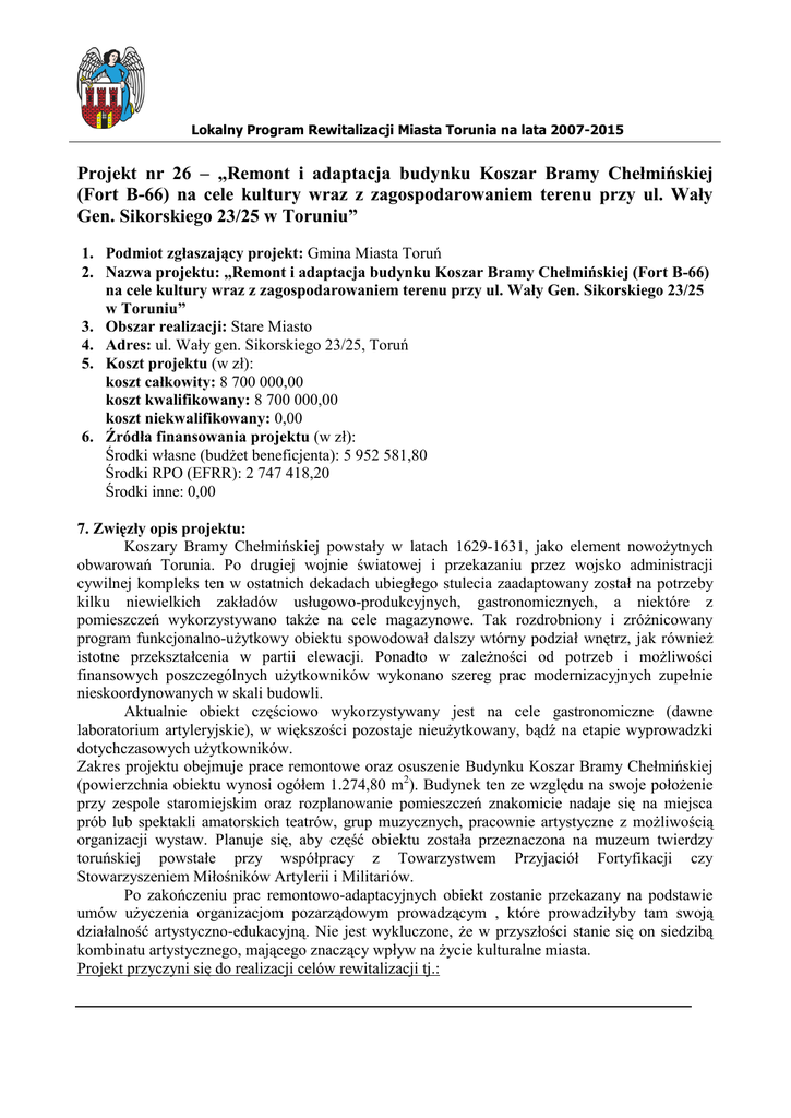 Lokalny Program Rewitalizacji Miasta Torunia na lata 2007-2015 Projekt nr 26 – „Remont i adaptacja budynku Koszar Bramy Chełmińskiej (Fort B-66) na cele kultury wraz z zagospodarowaniem terenu przy ul. Wały Gen. Sikorskiego 23/25 w Toruniu” 1. Podmiot zgłaszający projekt: Gmina Miasta Toruń 2. Nazwa projektu: „Remont i adaptacja budynku Koszar Bramy Chełmińskiej (Fort B-66) na cele kultury wraz z zagospodarowaniem terenu przy ul. Wały Gen. Sikorskiego 23/25 w Toruniu” 3. Obszar realizacji: Stare Miasto 4. Adres: ul. Wały gen. Sikorskiego 23/25, Toruń 5. Koszt projektu (w zł): koszt całkowity: 8 700 000,00 koszt kwalifikowany: 8 700 000,00 koszt niekwalifikowany: 0,00 6. Źródła finansowania projektu (w zł): Środki własne (budżet beneficjenta): 5 952 581,80 Środki RPO (EFRR): 2 747 418,20 Środki inne: 0,00 7. Zwięzły opis projektu: Koszary Bramy Chełmińskiej powstały w latach 1629-1631, jako element nowożytnych obwarowań Torunia. Po drugiej wojnie światowej i przekazaniu przez wojsko administracji cywilnej kompleks ten w ostatnich dekadach ubiegłego stulecia zaadaptowany został na potrzeby kilku niewielkich zakładów usługowo-produkcyjnych, gastronomicznych, a niektóre z pomieszczeń wykorzystywano także na cele magazynowe. Tak rozdrobniony i zróżnicowany program funkcjonalno-użytkowy obiektu spowodował dalszy wtórny podział wnętrz, jak również istotne przekształcenia w partii elewacji. Ponadto w zależności od potrzeb i możliwości finansowych poszczególnych użytkowników wykonano szereg prac modernizacyjnych zupełnie nieskoordynowanych w skali budowli. Aktualnie obiekt częściowo wykorzystywany jest na cele gastronomiczne (dawne laboratorium artyleryjskie), w większości pozostaje nieużytkowany, bądź na etapie wyprowadzki dotychczasowych użytkowników. Zakres projektu obejmuje prace remontowe oraz osuszenie Budynku Koszar Bramy Chełmińskiej (powierzchnia obiektu wynosi ogółem 1.274,80 m2). Budynek ten ze względu na swoje położenie przy zespole staromiejskim oraz rozplanowanie pomieszczeń znakomicie nadaje się na miejsca prób lub spektakli amatorskich teatrów, grup muzycznych, pracownie artystyczne z możliwością organizacji wystaw. Planuje się, aby część obiektu została przeznaczona na muzeum twierdzy toruńskiej powstałe przy współpracy z Towarzystwem Przyjaciół Fortyfikacji czy Stowarzyszeniem Miłośników Artylerii i Militariów. Po zakończeniu prac remontowo-adaptacyjnych obiekt zostanie przekazany na podstawie umów użyczenia organizacjom pozarządowym prowadzącym , które prowadziłyby tam swoją działalność artystyczno-edukacyjną. Nie jest wykluczone, że w przyszłości stanie się on siedzibą kombinatu artystycznego, mającego znaczący wpływ na życie kulturalne miasta. Projekt przyczyni się do realizacji celów rewitalizacji tj.: Lokalny Program Rewitalizacji Miasta Torunia na lata 2007-2015 - Poprawa ładu przestrzennego i estetyki Starego Miasta poprzez adaptacje obiektów na cele użyteczności publicznej, polepszenie stanu technicznego budynków, podniesienie ich wartości architektonicznej oraz walorów funkcjonalnych i estetycznych ulic, przeprowadzenie szeregu prac modernizacyjnych w kamienicach mieszkalnych. 8. Powiązania z innymi projektami: „Toruńska Starówka - ochrona i konserwacja dziedzictwa kulturowego UNESCO", działanie 11.1 "Ochrona i zachowanie dziedzictwa kulturowego o znaczeniu ponadregionalnym" XI Oś priorytetowa Programu Operacyjnego Infrastruktura i Środowisko „Toruń - Hanza nad Wisłą” - projekt znajdujący się na indykatywnej liście indywidualnych projektów kluczowych Programu Operacyjnego Innowacyjna Gospodarka 2007-2013, działanie 6.4 "Inwestycje w produkty turystyczne o znaczeniu ponadregionalnym" „Przebudowa budynku przy ul. Strumykowej 4 wraz z zagospodarowaniem terenu na potrzeby muzeum Świat Toruńskiego Piernika w Toruniu”, działanie 7.1 Rewitalizacja zdegradowanych dzielnic miast, 7 Oś priorytetowa Regionalnego Programu Operacyjnego Województwa Kujawsko-Pomorskiego na lata 2007-2013 (projekt nr 22) „Adaptacja Zabytkowej Baszty Gołębnik na pracownie artystyczne i siedziby organizacji pozarządowych prowadzących działalność w dziedzinie kultury”, działanie 7.1 Rewitalizacja zdegradowanych dzielnic miast, 7 Oś priorytetowa Regionalnego Programu Operacyjnego Województwa Kujawsko-Pomorskiego na lata 2007-2013 (projekt nr 16) „Adaptacja Zabytkowej Bramy Klasztornej na cele kulturalne, społeczne i gospodarcze”, działanie 7.1 Rewitalizacja zdegradowanych dzielnic miast, 7 Oś priorytetowa Regionalnego Programu Operacyjnego Województwa Kujawsko-Pomorskiego na lata 2007-2013 (projekt nr 24) 9. Podmiot Zarządzający: Gmina Miasta Toruń / Urząd Miasta Torunia – Wydział Kultury 10. Podmiot zarządzający projektowanym przedsięwzięciem po jego zrealizowaniu: Gmina Miasta Toruń / Urząd Miasta Torunia – Wydział Kultury 11. Harmonogram działań: Działania Termin realizacji Prace projektowe lata 2010 - 2011 Prace budowlane lata 2012 – 2013 12. Przewidywany termin rozpoczęcia realizacji projektu: 2010 r. 13. Przewidywany termin zakończenia realizacji projektu: 2013 r. 14. Osoba mogąca udzielić informacji na temat projektu: Piotr Giza – Wydział Kultury UMT Telefon: 056 622-20-65 e-mail: [email protected]