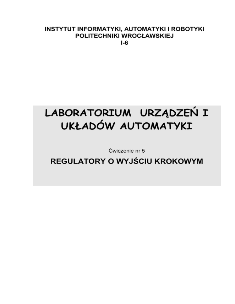 INSTYTUT INFORMATYKI, AUTOMATYKI I ROBOTYKI POLITECHNIKI WROCŁAWSKIEJ I-6 LABORATORIUM URZĄDZEŃ I UKŁADÓW AUTOMATYKI Ćwiczenie nr 5 REGULATORY O WYJŚCIU KROKOWYM Ćwiczenie 5 - Regulatory o wyjściu krokowym str.2 1.Cel ćwiczenia Celem ćwiczenia jest badanie właściwości regulatora krokowego i układu regulacji krokowej o róŜnych algorytmach działania. 2. Zakres ćwiczenia. Badane regulatory z wyjściem krokowym: • MRP 51 ( wykonanie: 1-001-111-11-4-00 ) • MRP-41 (wykonanie: 03-103-112-01-02-00 ) Program ćwiczenia zawiera : • konfigurowanie regulatora do realizacji róŜnych algorytmów regulacji krokowej, • realizacja układu regulacji połoŜenia elementu wyjściowego siłownika (serwomechanizm), • analiza pracy serwomechanizmu. • realizacja innych układów regulacji krokowej, 3. Opis przebiegu ćwiczenia. Regulatorem krokowym realizowanym w technice analogowej przyjęto nazywać regulator trójpołoŜeniowy z korekcyjnym sprzęŜeniem zwrotnym, w którym wypełnienie impulsowego sygnału wyjściowego (czas trwania impulsów) zaleŜy od wartości odchyłki regulacji. Regulator ten współpracuje ze stałoprędkościowym elementem wykonawczym o działaniu całkującym (członem astatycznym 1/sTM). Nazwa regulatora pochodzi stąd, Ŝe wskutek pojawiania się impulsów wyjściowych (+1, 0, -1), całkujący element wykonawczy przestawia nastawnik małymi przesunięciami - krokami. Schemat blokowy takiego regulatora krokowego przedstawia rys.5.1. h WY e v N 0 1 Tms Kz(s) Rys.5.1. Schemat blokowy analogowego regulatora krokowego. u Ćwiczenie 5 - Regulatory o wyjściu krokowym str.3 JeŜeli jako członu korekcyjnego uŜyjemy członu o transmitancji : oraz przyjmując , Ŝe przekaźnik trójpołoŜeniowy jest wzmacniaczem o bardzo duŜym wzmocnieniu otrzymamy transmitancję regulatora o takiej postaci: Widać zatem, Ŝe regulator realizuje algorytm PI regulacji. JeŜeli w obwodzie sprzęŜenia będzie człon inercyjny drugiego rzędu to otrzymamy regulator krokowy o charakterystyce PID: Zachowanie się regulatorów krokowych o charakterze PI lub PID jest podobne do ich odpowiedników "ciągłych". Charakterystyki regulatorów krokowych , a w szczególności impulsowe czy jednostkowe , są odcinkami liniowe. Nachylenie tych odcinków jest uzaleŜnione od czasu przestawiania siłownika Tm. Regulatory o wyjściach nieciągłych realizowane w technice mikroprocesorowej zasadniczo róŜnią się strukturą od regulatorów analogowych. Wszystkie one są zbudowane z regulatora o wyjściu ciągłym z układem przetwarzającym to wyjście na sygnał nieciągły. Zamiana wyjścia na nieciągłe spowodowana jest koniecznością współpracy z niektórymi urządzeniami wykonawczymi. W strukturze regulatora o wyjściu krokowym uwzględnia się fakt współpracy z astatycznymi członami wykonawczymi (silnik, siłownik stałoprędkościowy). Informacja o połoŜeniu elementu wykonawczego (siłownika) jest zwykle w nich przekazywana poprzez potencjometr lub nadajnik indukcyjny . Aby uniknąć szkodliwych przerw z nadajnika potencjometrycznego, bardzo często połoŜenie siłownika jest w tym przypadku symulowane programowo, poprzez dodatkowy integrator. 3.1. Regulator MRP-51 ( wykonanie: 1-001-111-11-4-00 ). Regulator zgodnie z dokumentacją posiada następujące parametry: MRP-51 1-001-111-11-4-00 bez atestów RS232C skalowanie wskaźnika uchybu ± 20% wejście X1prądowe 0 .. (4) - 20 mA wyjście krokowe przekaźnikowe wejście X2 4-20 mA (0 - 20 mA) wejście X3 4-20 mA (0 - 20 mA) wejście X4 4-20 mA (0 - 20 mA) wyjście analogowe 4-20 mA (0 - 20 mA) Ćwiczenie 5 - Regulatory o wyjściu krokowym str.4 Uwaga! wyjścia analogowe lub krokowe wykluczają się wzajemnie. Dlatego skreślono wynikające z kodu wyjście analogowe. Algorytmy regulacyjne MRP-51 przechowywane są na stałe w pamięci programów. Proces konfigurowania regulatora tj. wybór algorytmu oraz nastawa parametrów statystycznych i dynamicznych dla wybranego algorytmu odbywa się za pomocą przycisków umieszczonych na płycie czołowej regulatora lub przy pomocy programu ( Windows 3.11) "MRP51 re 51 ". Podstawowe parametry nastaw regulatora: • wzmocnienie Kp • czas zdwojenia Ti • Czas róŜniczkowania Td • wzmocnienie róŜniczkowania Kd • stała czasowa filtracji sygnałów wej. • względna strefa histerezy • strefa nieczułości 0.1 1 ÷ 1 ÷ 1 ÷ 0 ÷ 0.25 ÷ 0.5% ÷ ÷ 100, 9999s, 1000s, 9.99, 1000s, 0.5, 4 %, Wygląd płyty czołowej regulatora pokazuje rys.5.1. Rys.5.1. Płyta czołowa regulatora MRP-51. Ćwiczenie 5 - Regulatory o wyjściu krokowym str.5 Blok czołowy regulatora jest jednocześnie stacyjką sterowania ręcznego oraz blokiem nastaw umoŜliwiających konfigurację i wybór nastaw statycznych i dynamicznych. WyposaŜony jest w następujące wskaźniki i elementy manipulacyjne. • wskaźnik uchybu regulacji o programowanym zakresie wskazań od ±2.5% do ±40% z dodatkowymi wskaźnikami sygnalizującymi przekroczenie wartości granicznych ( LEDY A1 i A2) • czterocyfrowy wyświetlacz segmentowy sygnałów wejściowych wskazujący równieŜ wartość wielkości zadanej. Wyboru wyświetlonej wartości dokonuje się przyciskiem SP/X. Diody SP , X sygnalizują , która z wartości jest aktualnie wyświetlana. • przyciski sterowania ręcznego < > słuŜące do zmian wartości zmiennej wyjściowej. Dla regulatora typu ciągłego wartość wyjściowa zmienia się proporcjonalnie do czasu naciśnięcia przycisku. Dla regulatora krokowego uruchamiany jest przekaźnik wyjściowy co sygnalizowane jest diodami P1 lub P2. • dwucyfrowy wyświetlacz segmentowy wartości wyjściowej. • sygnalizator stanu wyjść trójstanowych diody P1 i P2. • przycisk trybu pracy MANUAL słuŜący do przełączania rodzaju pracy automatyka sterowanie ręczne i odwrotnie. Tryb pracy ręcznej sygnalizowany jest diodą M. • przyciski konfiguracyjne 56 słuŜą do zmiany nastaw. W tym trybie pracy wyświ